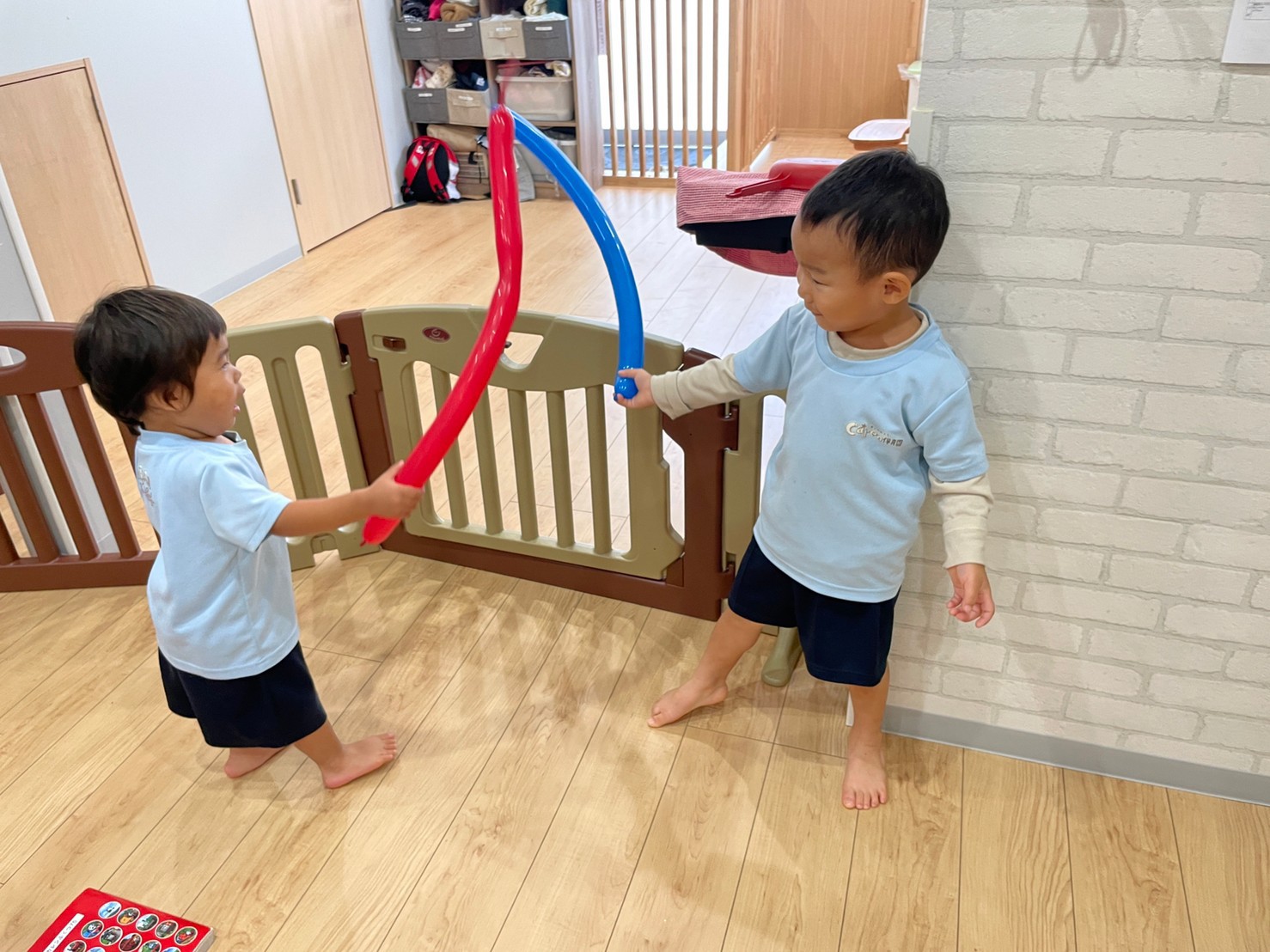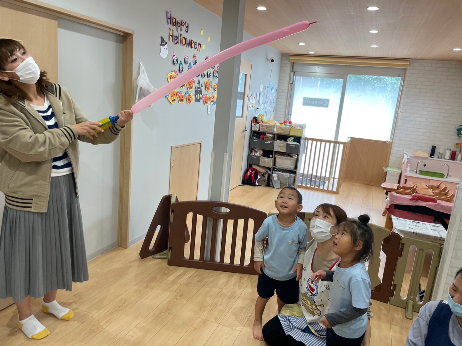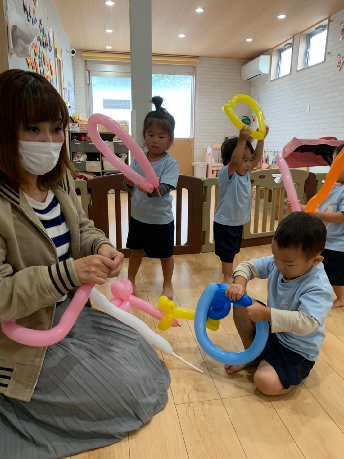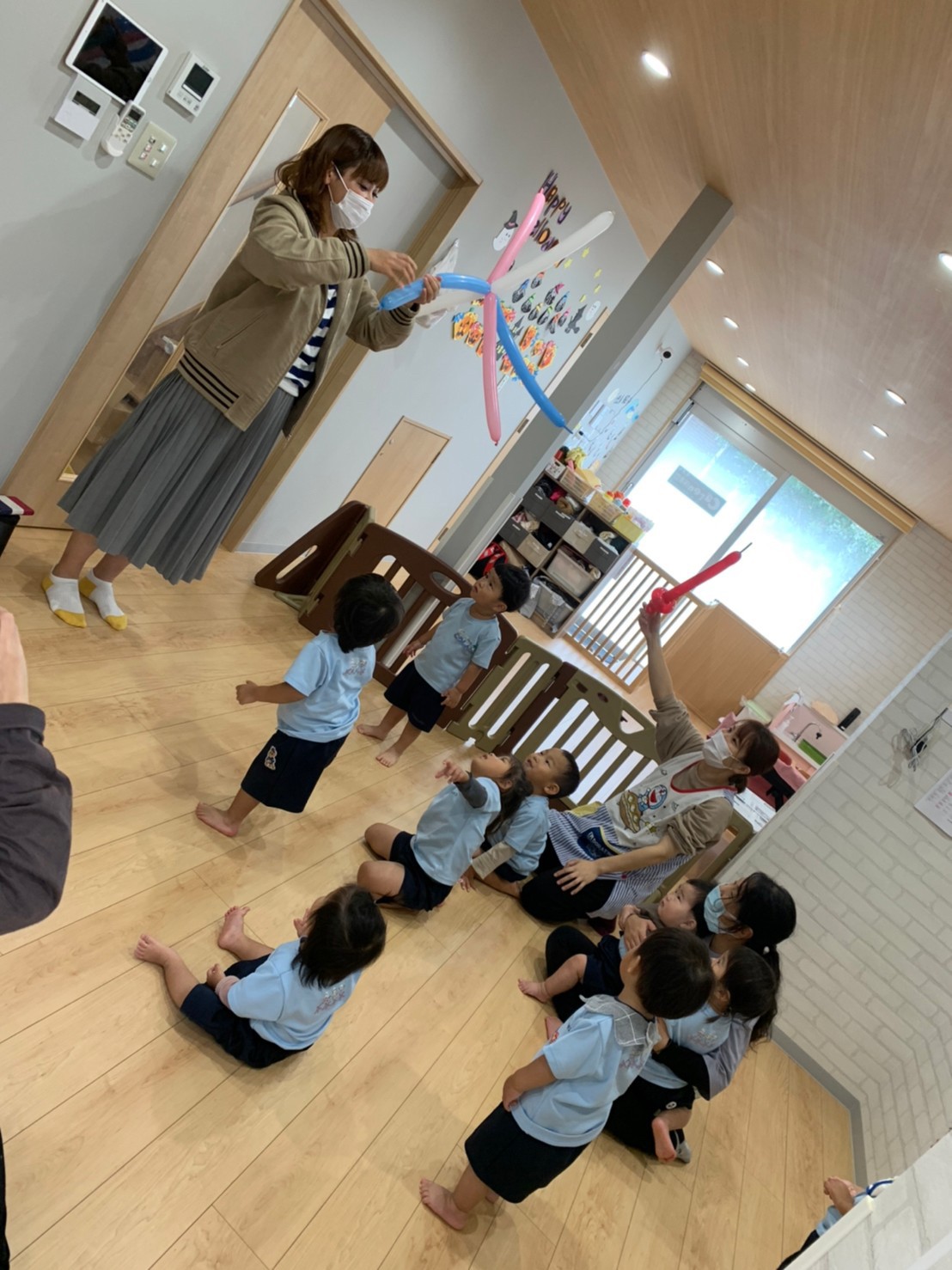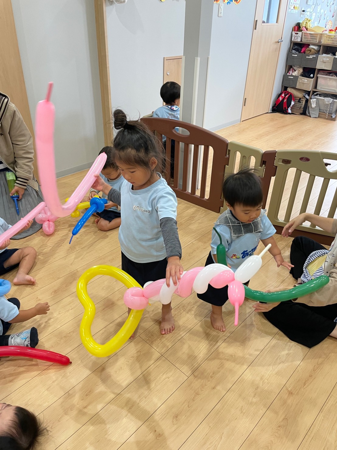 音楽にのって先生が風船を膨らまし、色んな形を作ってくれ子供たちは大興奮で風船で遊んでいました💘😊😊
