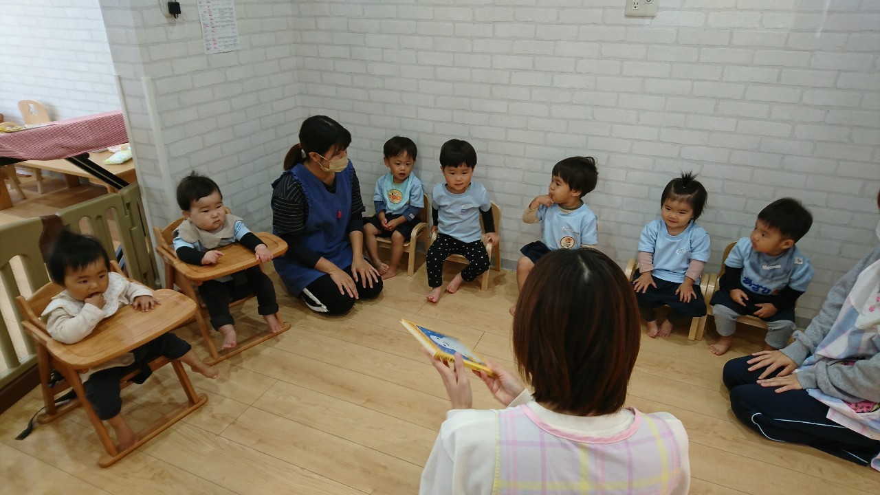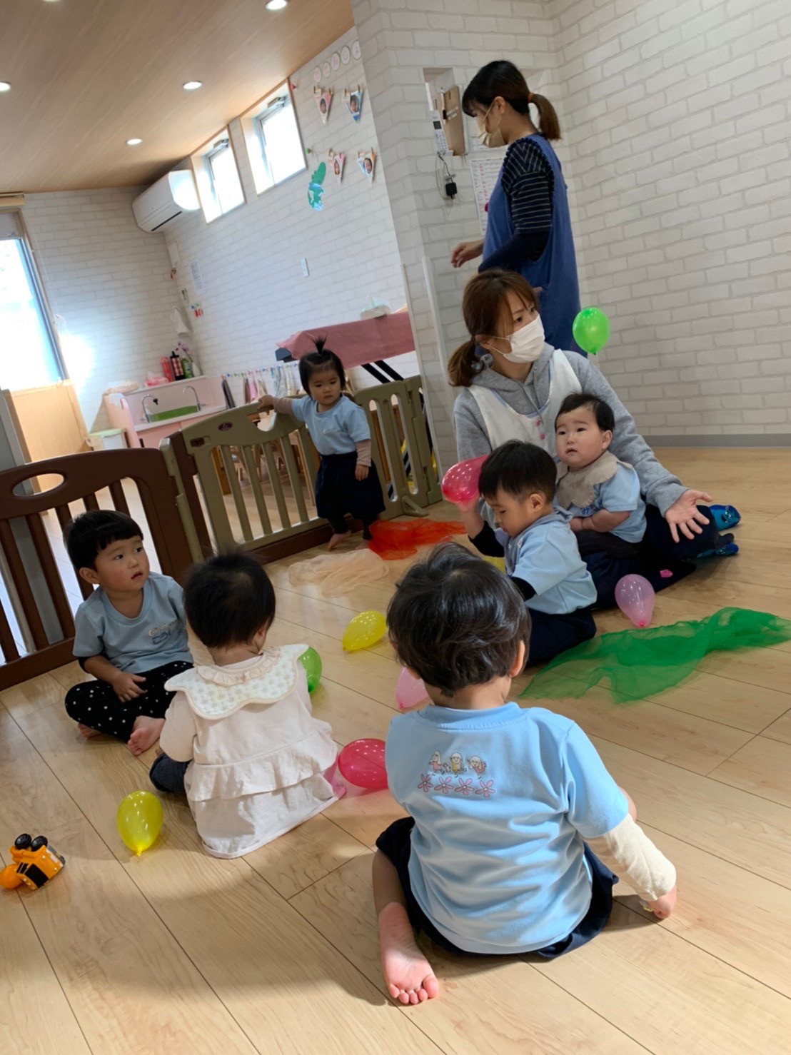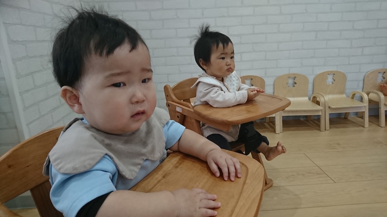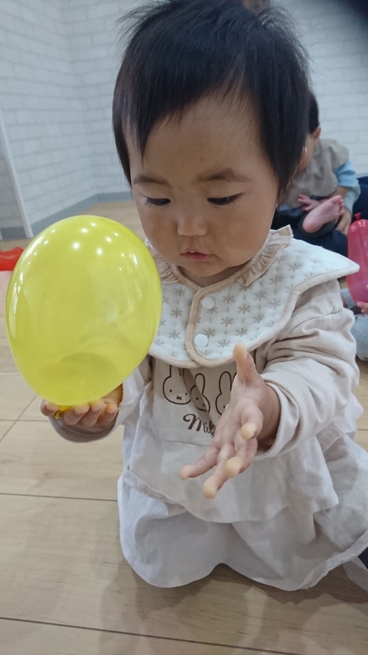 先生がアルファベットのカードを出すと、興味津々に近くによりカードを必死に目で追っていました!☺英語の後は、鼻水が出ている子が多かったので室内ですごすしました。🤧ミニ風船で遊び、割ってみたり蹴ってみたりと自分なりに感触を楽しんだりして過ごせました🎈 鼻水が出ている子が増えているので、水分補給を心がけて、鼻水をこまめにとり体調管理にきをつけてすごします🤧