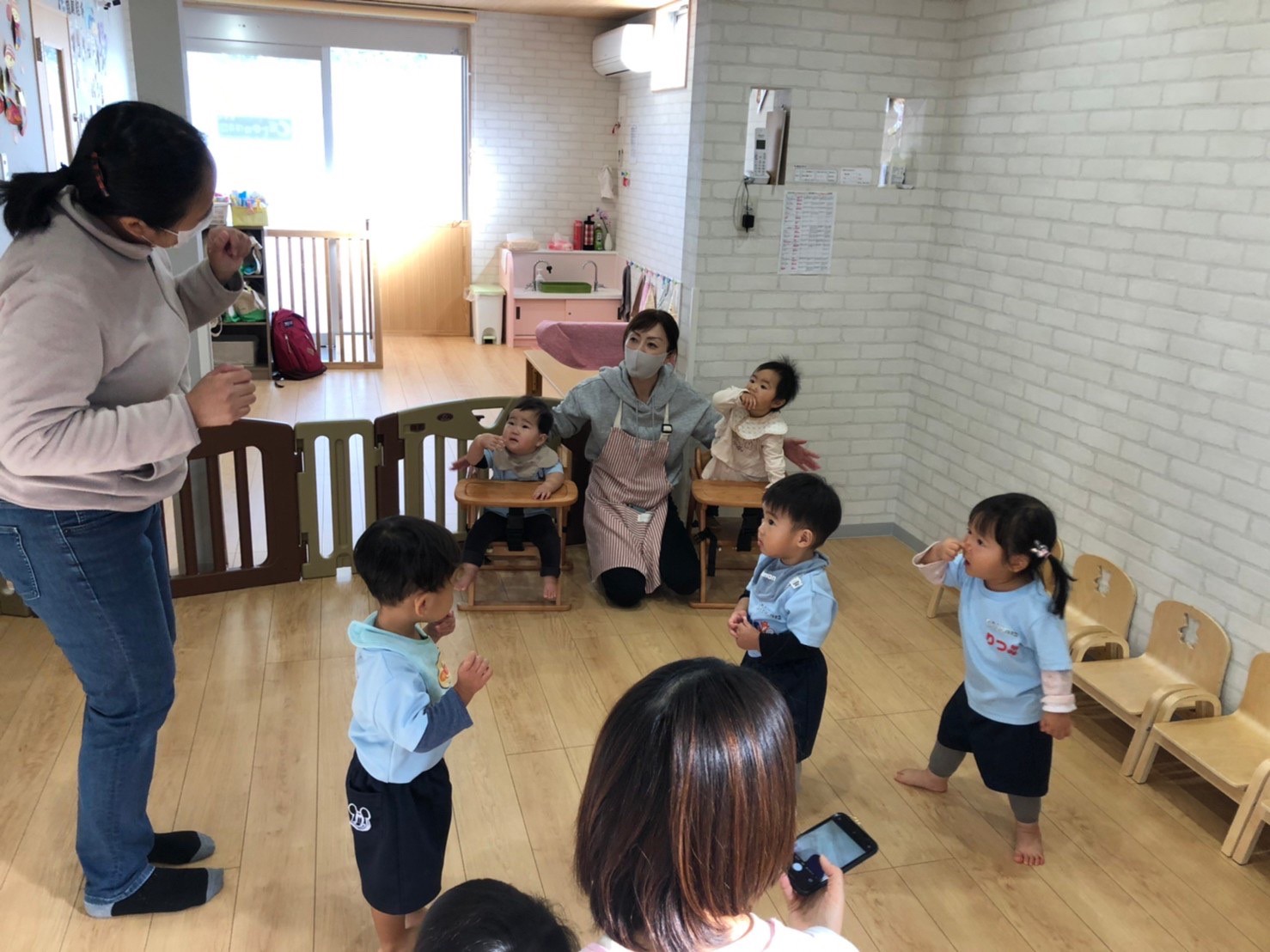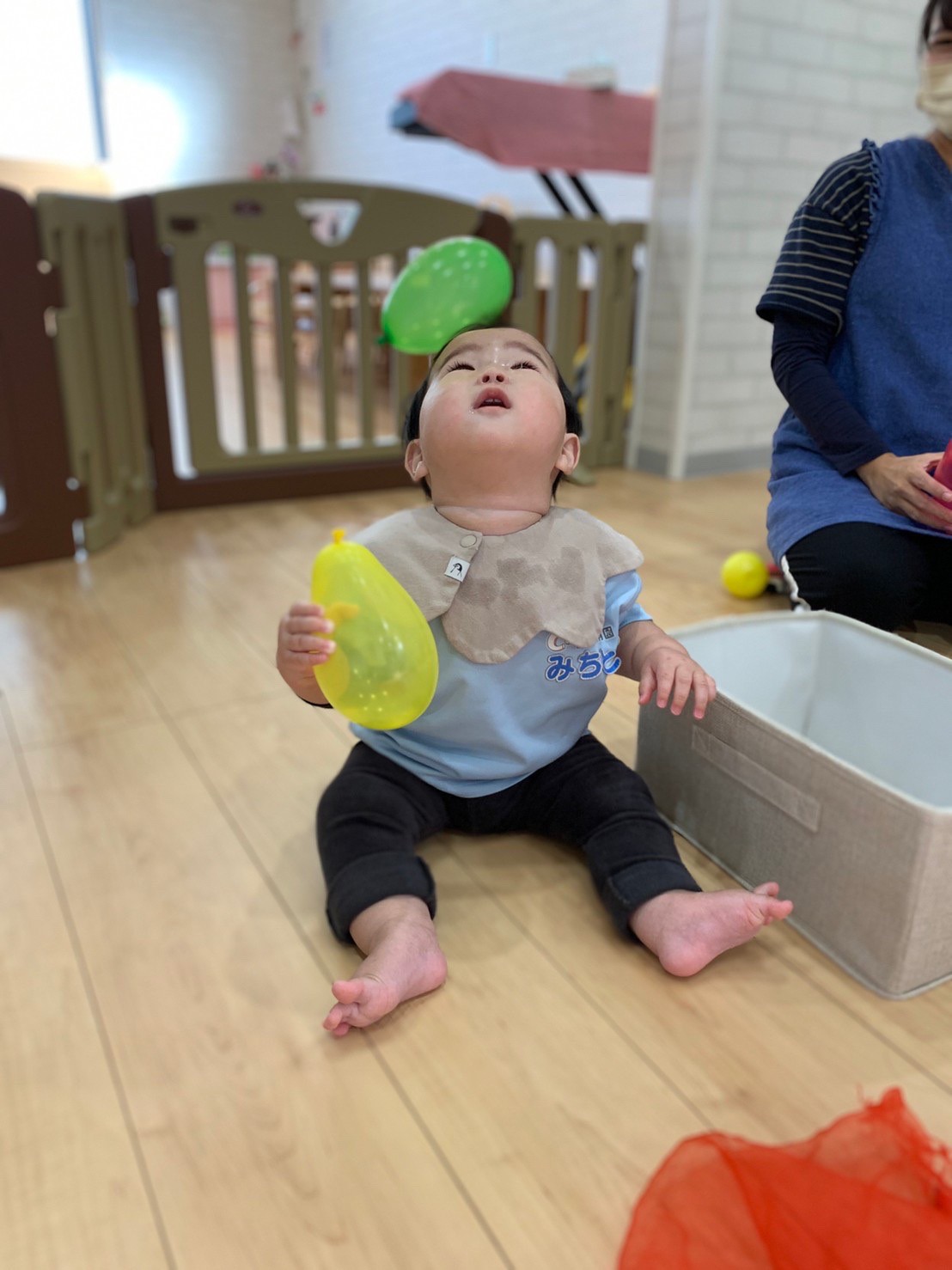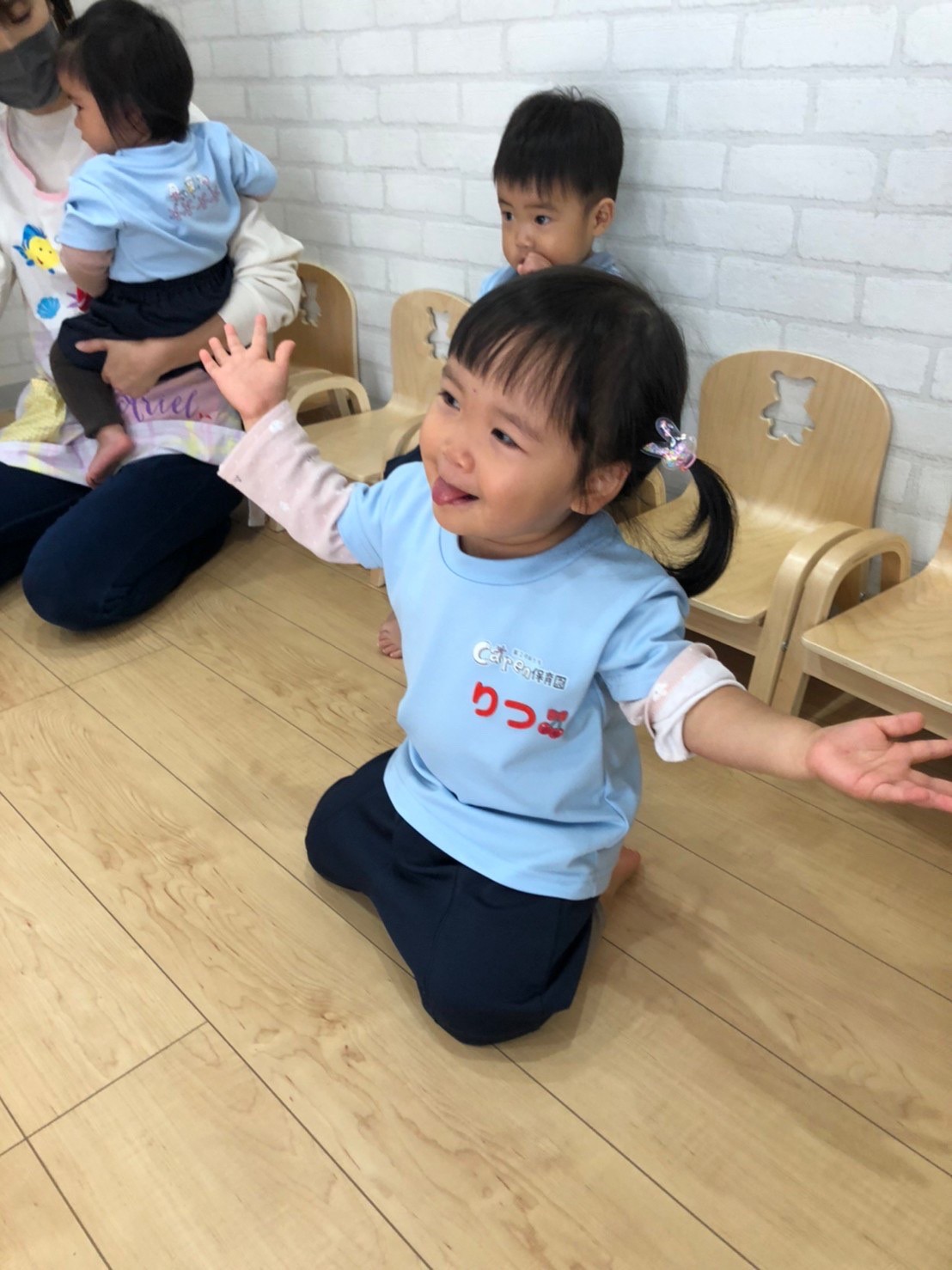 先生がアルファベットのカードを出すと、興味津々に近くによりカードを必死に目で追っていました!☺英語の後は、鼻水が出ている子が多かったので室内ですごすしました。🤧ミニ風船で遊び、割ってみたり蹴ってみたりと自分なりに感触を楽しんだりして過ごせました🎈 鼻水が出ている子が増えているので、水分補給を心がけて、鼻水をこまめにとり体調管理にきをつけてすごします🤧