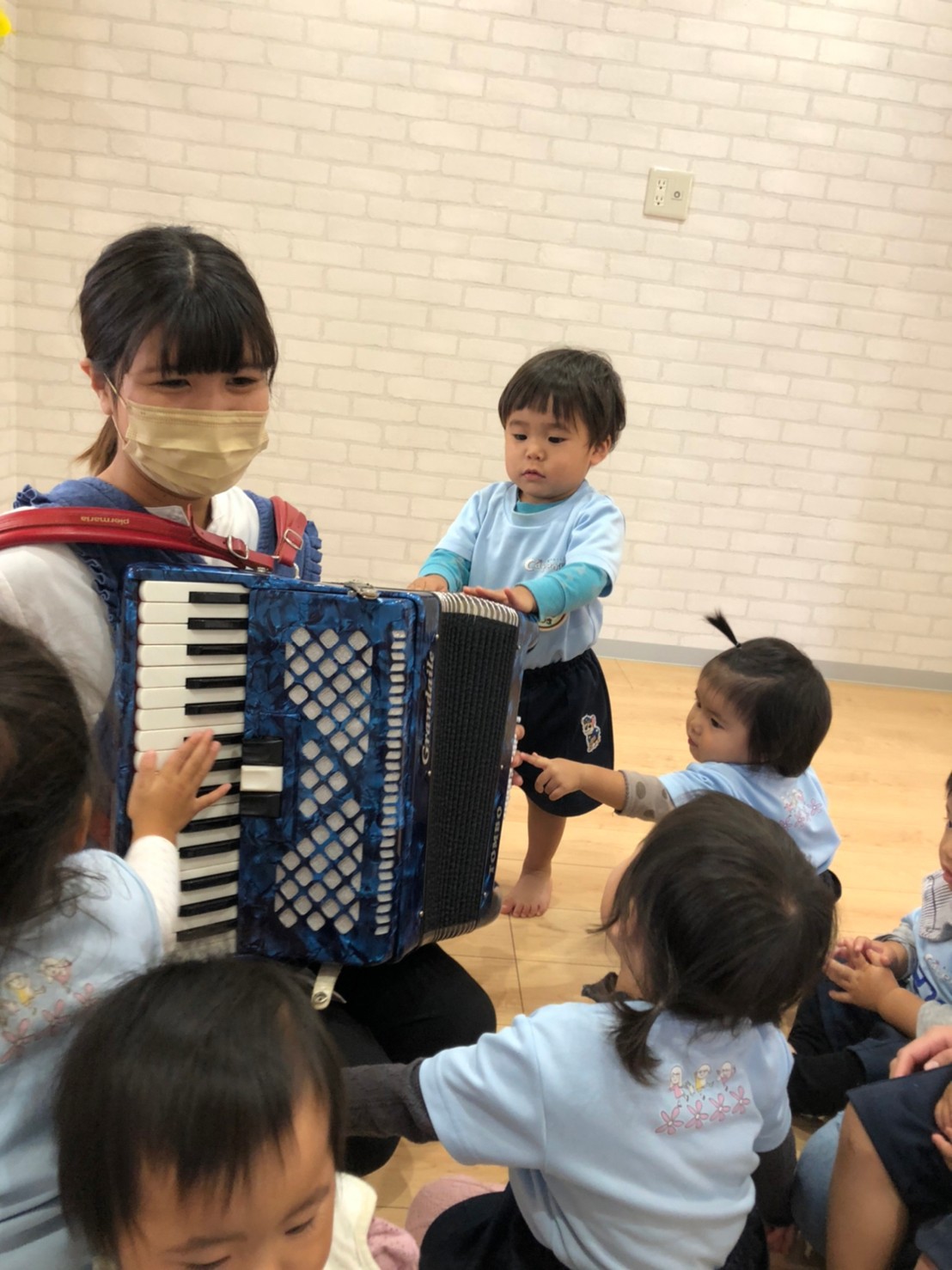 リトミックに参加をし、絵本や様々な形のカードを見て問いかけに答えたり、音楽に合わせて身体を動かして楽しんでいました🥰アコーディオンにもじっくり触らせてもらい、皆んな興味津々になりました(^_-)-☆