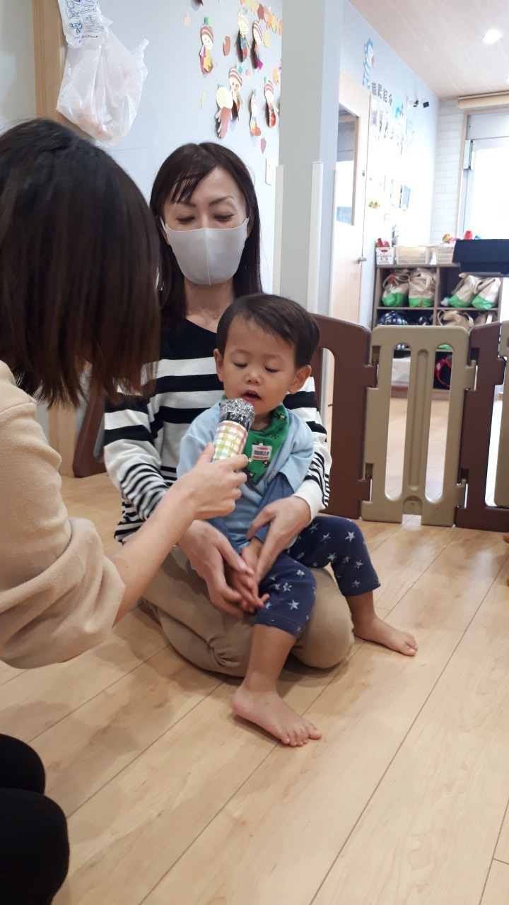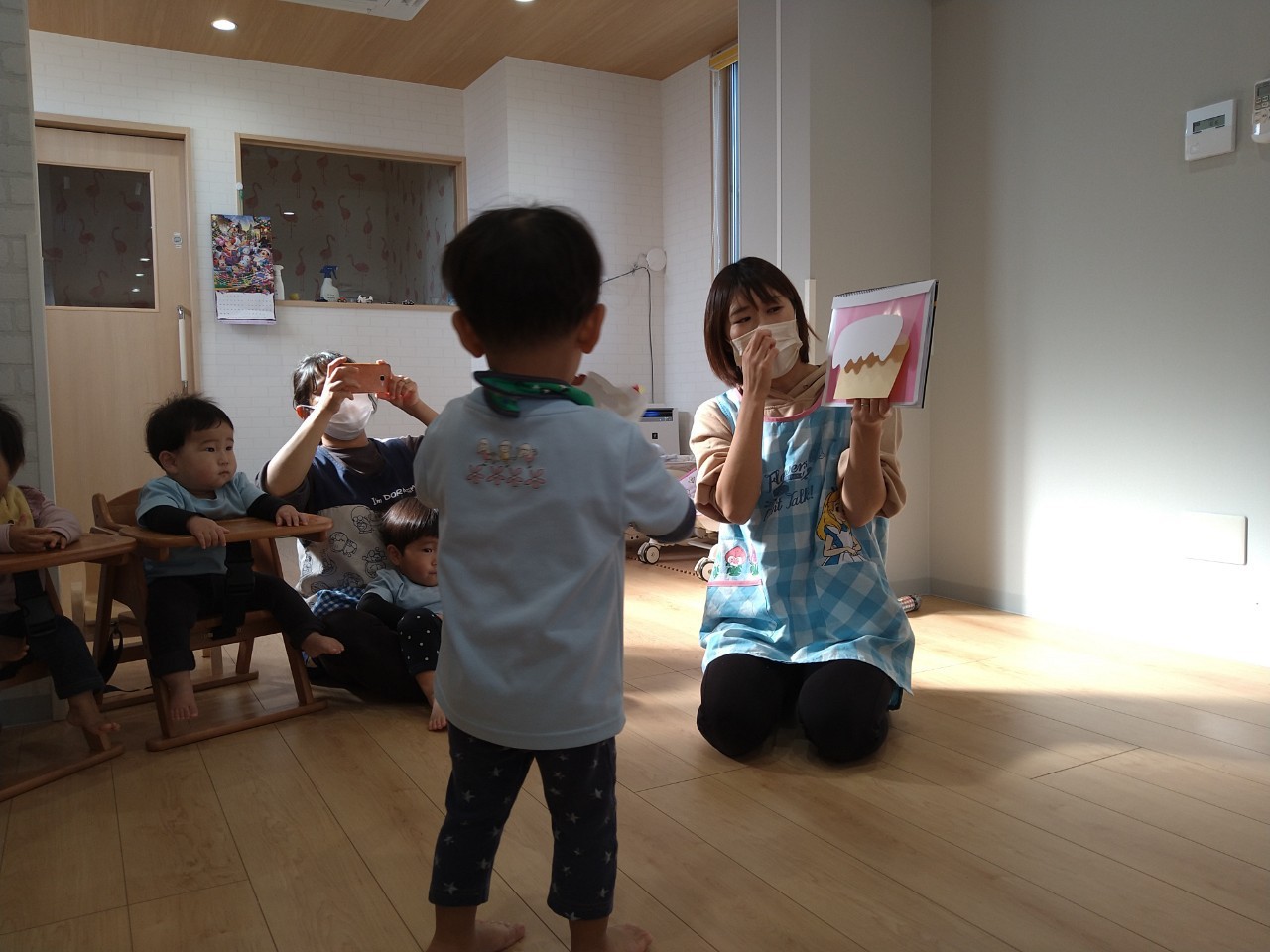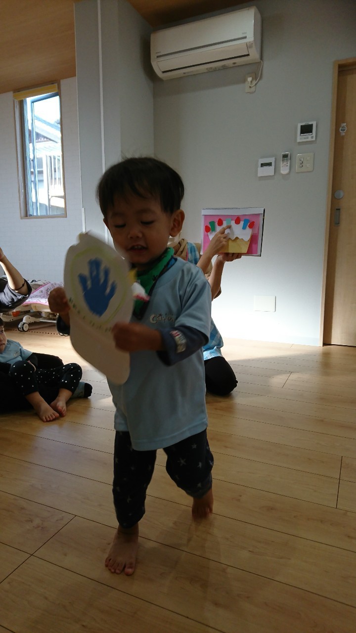 おやつの後は誕生日会に参加をし、 誕生日のメダルやカードを渡すととても嬉しかったようで他のお友達に一人一人みせてまわっていました💛 先生の出し物の『ケーキを作ろう』を見ました✨🍰一緒に掛け声をかけたり、最後にはみんなで、誕生日のお友達にハッピバースディ歌い🎶お祝いをしました!(^_-)-☆
