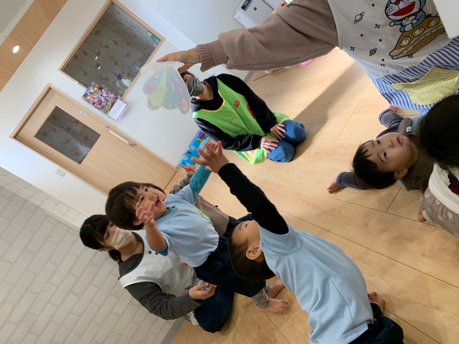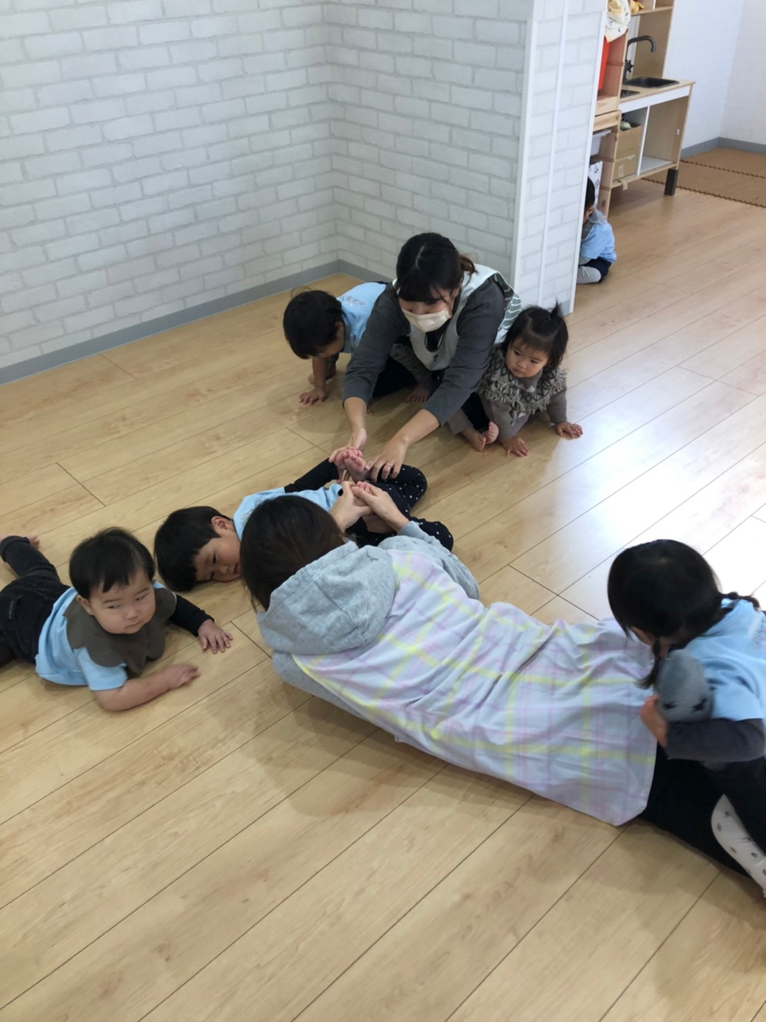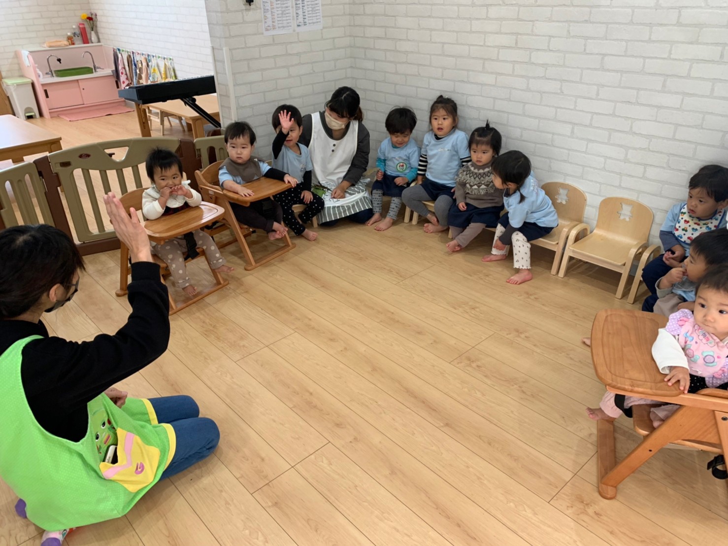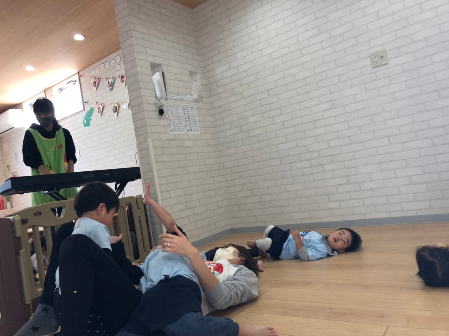 落ち着いた様子で、参加出来ていて、リトミックが終わり先生とさよならする時は名残惜しそうでした💓その後は、ピアノの音に合わせてヨチヨチ歩いたり眠ったりと動きに変化のあるリズム遊びをしたが、初めての事なので戸惑う様子も多く、子供たちが楽しめるよう声かけ等を工夫して、これから取り入れていきたいと思いました✨🥰