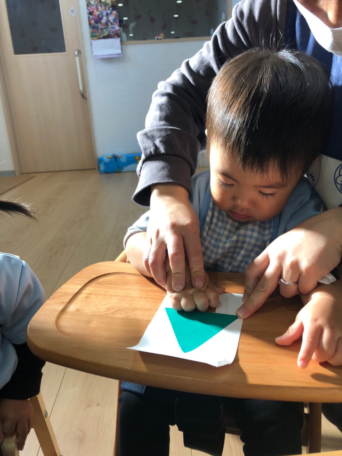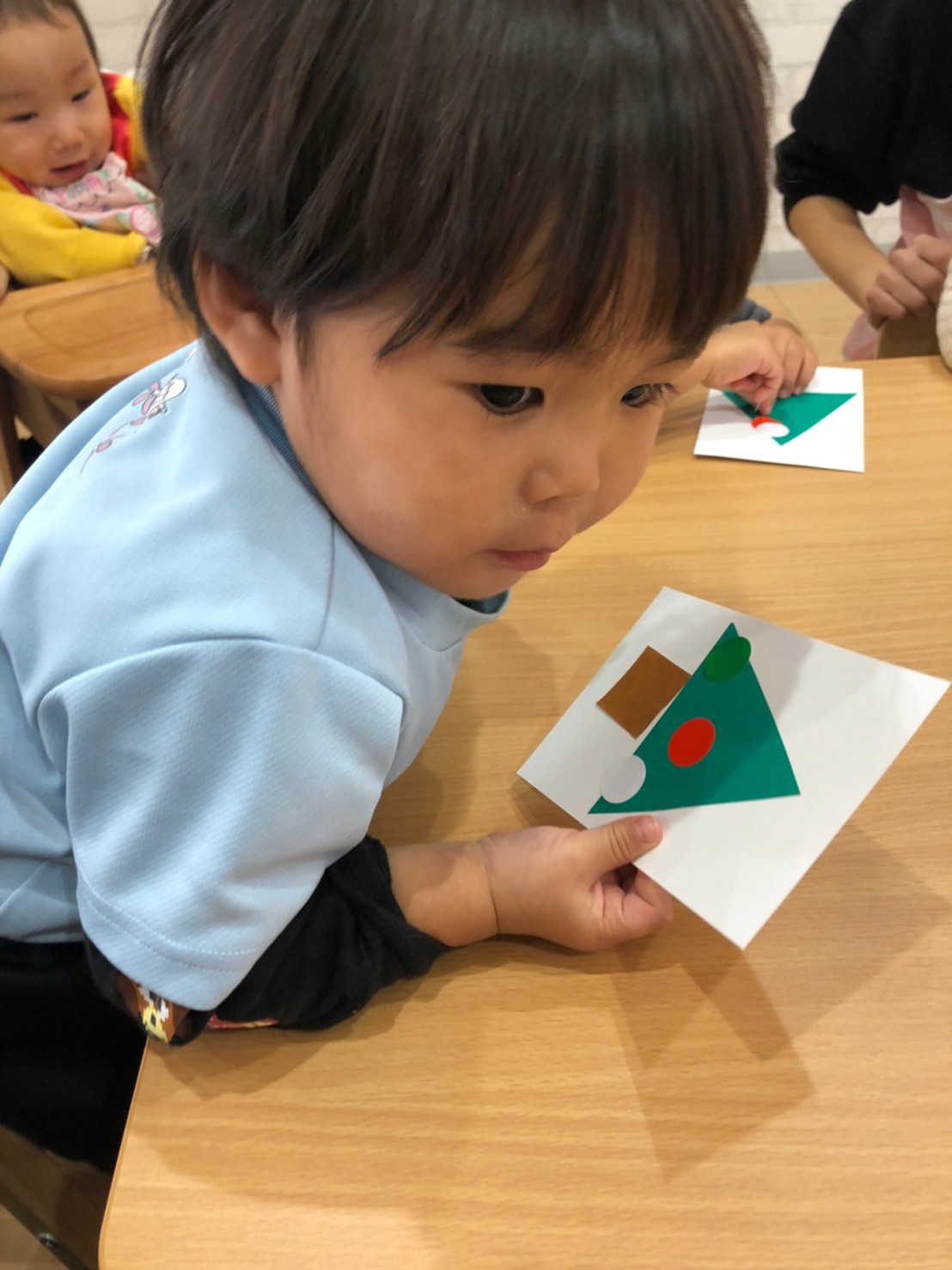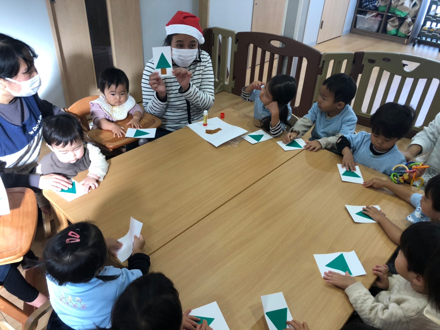 先生のお話しをしっかり聞いて シールの色を英語で答えてくれるお友達も 居て、みんな上手に貼っていました🥰✨ 出来上がりのクリスマスツリーをみんなで 見せ合いしてジングルベルを楽しく歌いました🎶 その後は、発表会の練習を行って はらぺこあおむしの音楽に合わせて 入場の練習をし、初めての練習だったので 戸惑いも見られたがみんな音楽を聴いたり 楽しんでいる姿も見られました🥰✨♡