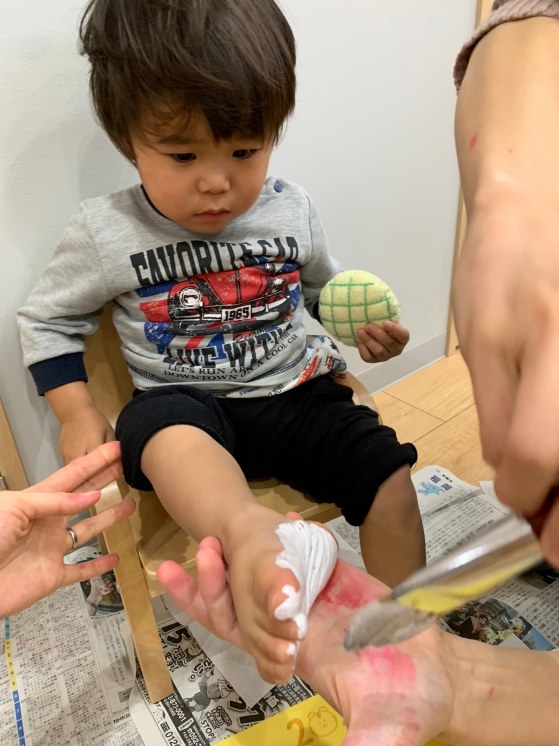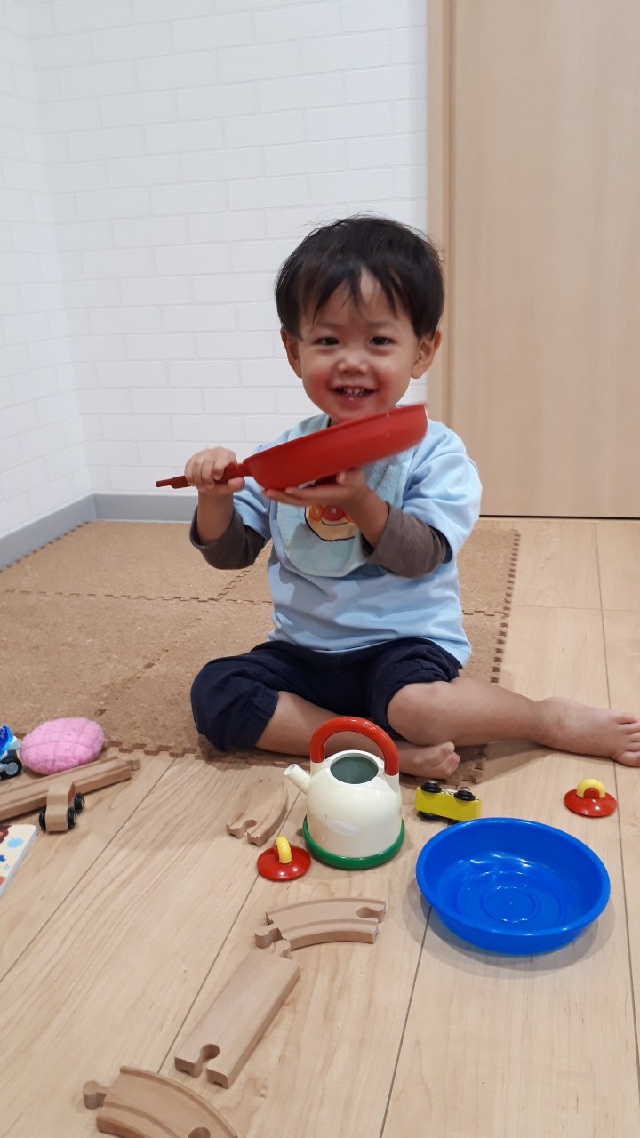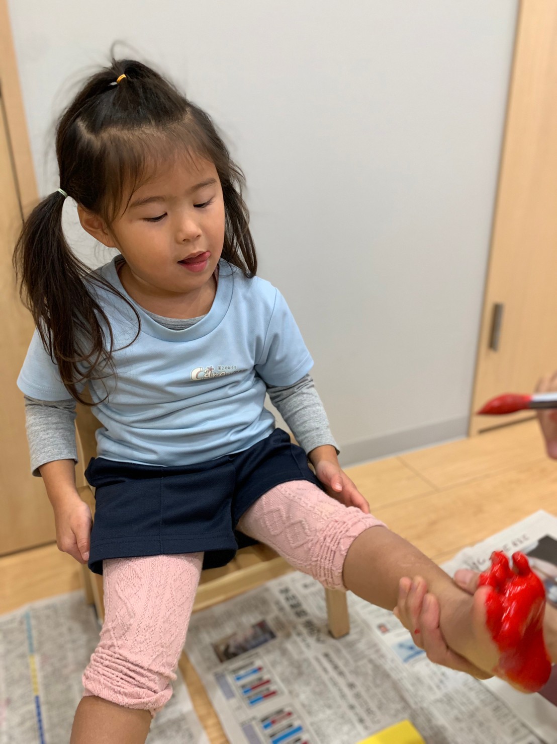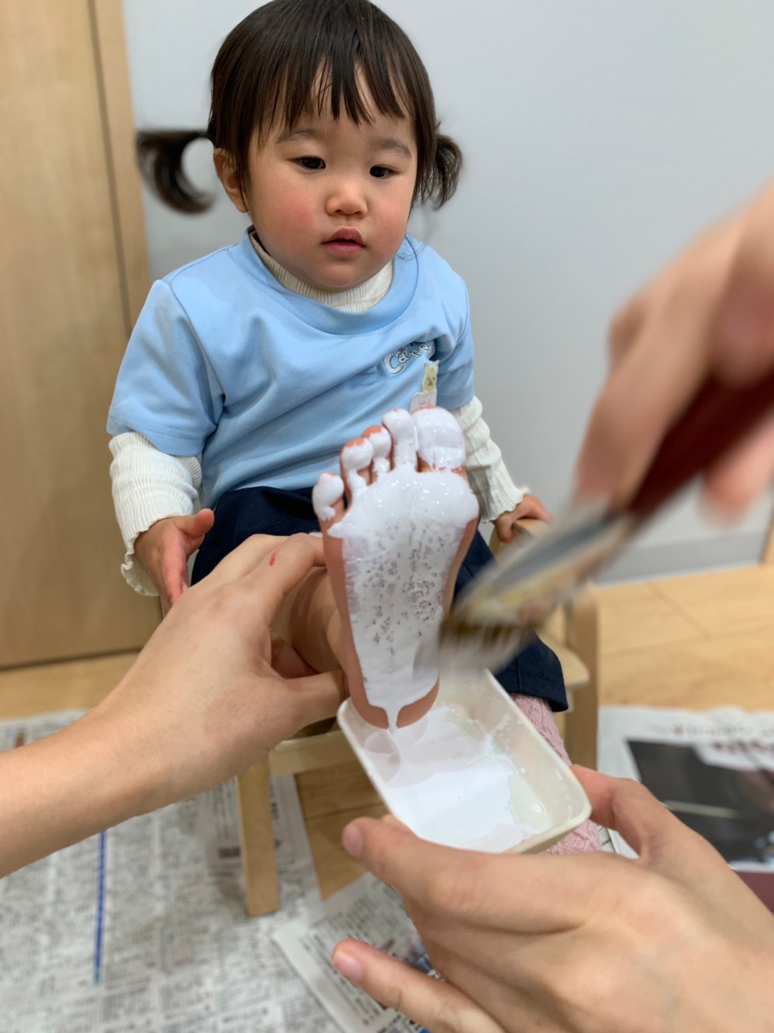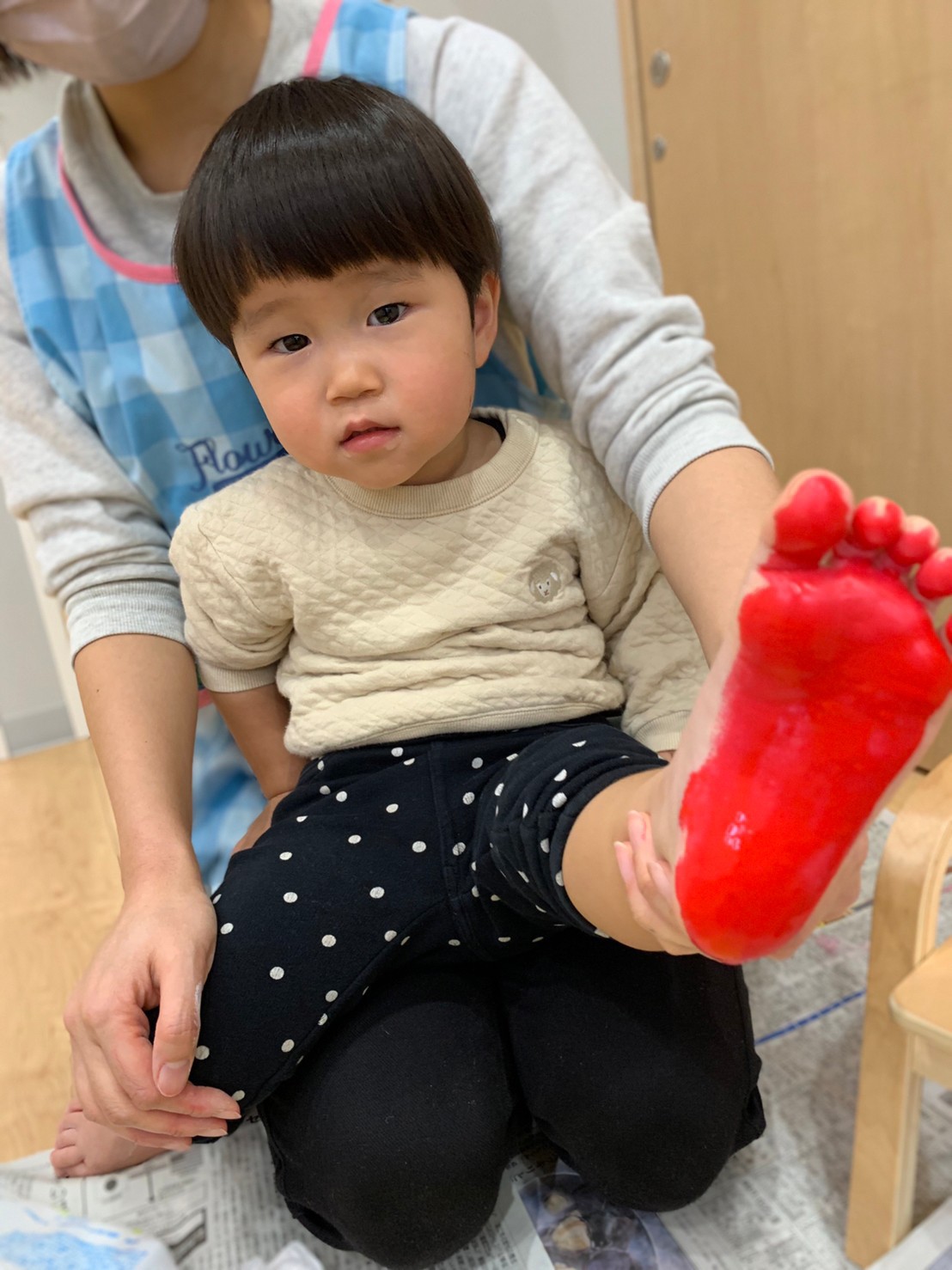 毎朝の絵本読みでは保育者に読んでと絵本を持ってきてくれたり、手遊びや歌を楽しみにしている姿もあるので、1日を安心して迎えれるよう朝の会を進行していきたいです🥳✨おやつ後は足形とりを行い、 足の裏に筆で絵の具を塗ると、くすぐったい表情やジッと真剣に見ている子など、一人ひとり様々な反応が見られました💛 今日は雨のため室内での活動となるが、保育者とブロックやままごとなどを並べて楽しむ姿が見られました🥰これからも小さい玩具の誤飲に留意していきたいです。