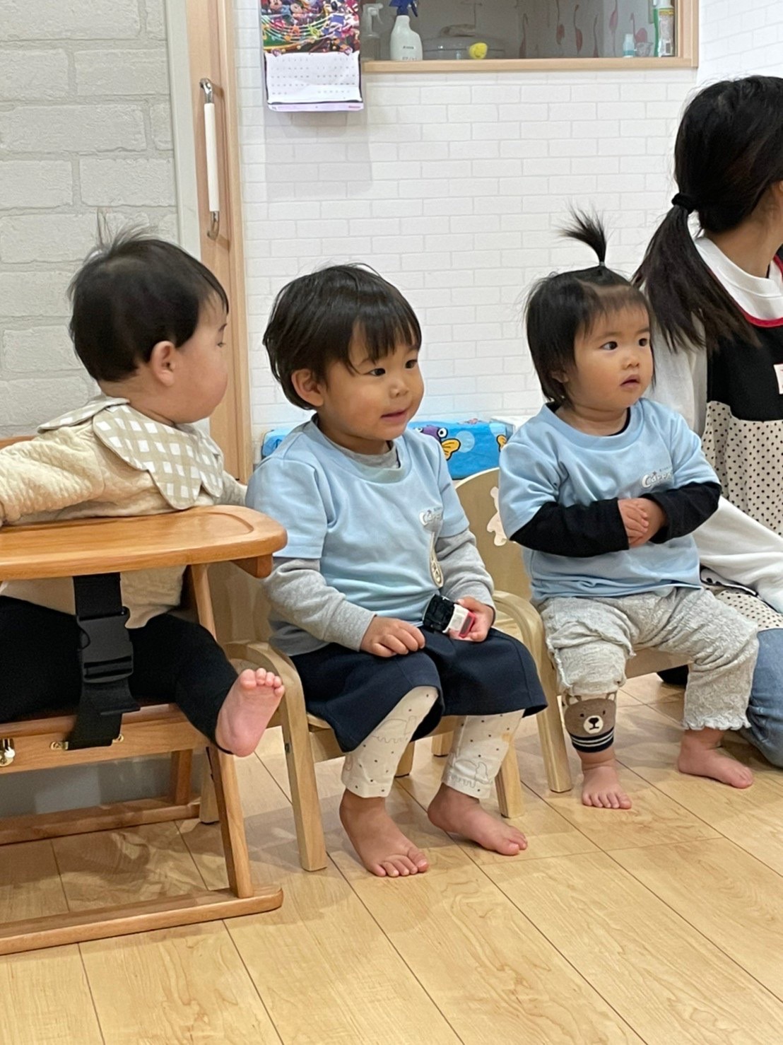 朝の会では、落ち着いて椅子に座り参加します🥰お名前呼びでは小さいお友達の手を挙げるお手伝いをしてあげる様子も見られました✨🥰