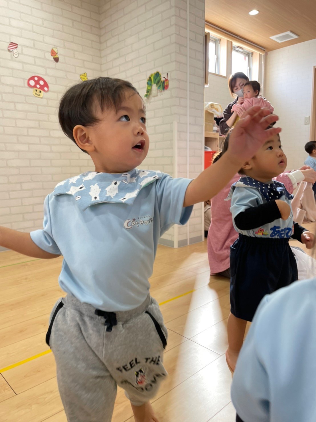 落ち着かない子どもには保育者が寄り添い安心して参加出来るようにしていきたいです💓気温の変化が激しいので、体調管理にも充分に留意します🤧