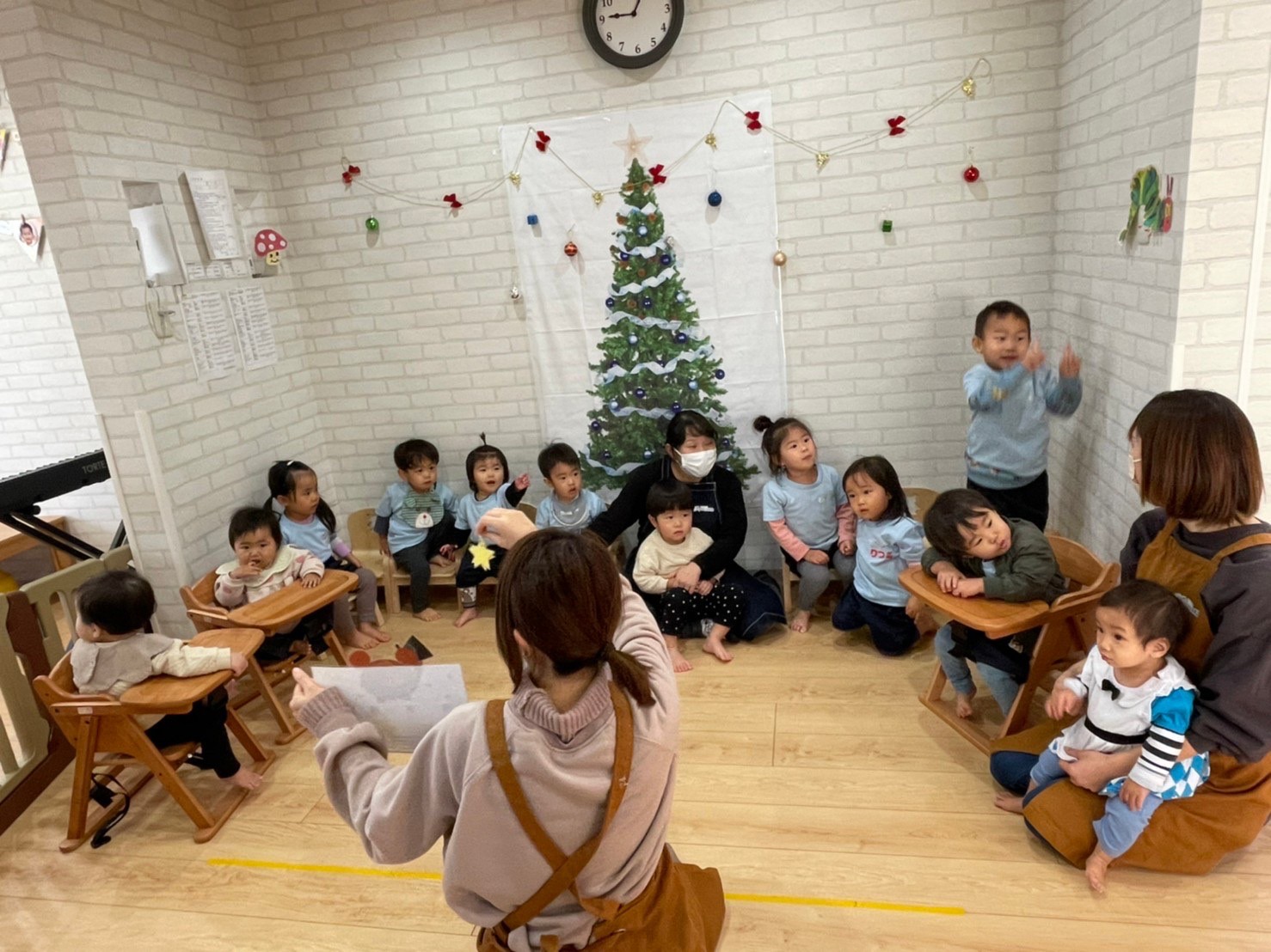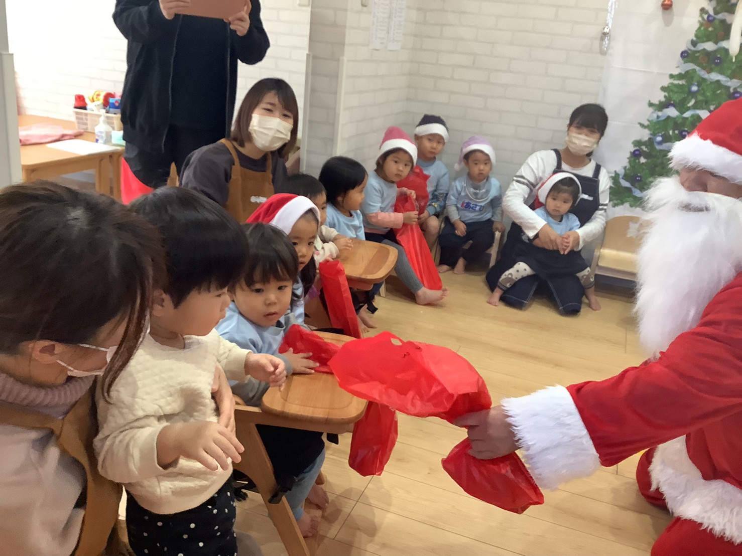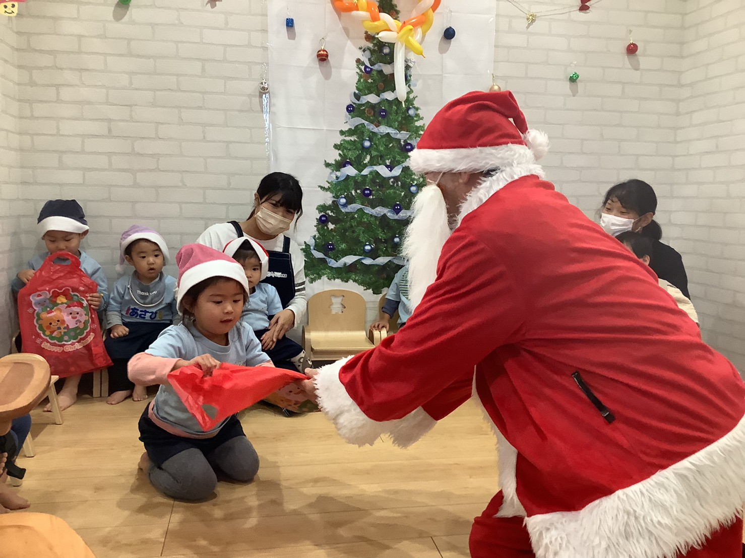 朝の会では、きちんと座りお名前を呼ばれると元気に手を挙げ答えていました🥰 おやつ後はリトミックのクリスマスコンサートに参加をし、ピアノやサックスの音色に静かに耳を傾けて聴いている姿がありました。馴染みのある曲では、嬉しそうに手をたたいたり、音楽にあわせてのっていた🎅最後にサンタクロースからのプレゼントを受けとると、緊張した表情や嬉しそうな笑顔を見せる子など一人ひとり様々な反応が見られました🎅その後、むつき公園までお散歩をして、ボールを追いかけたり、ぽかぽか陽気の中、たくさん身体を動かして楽しみました