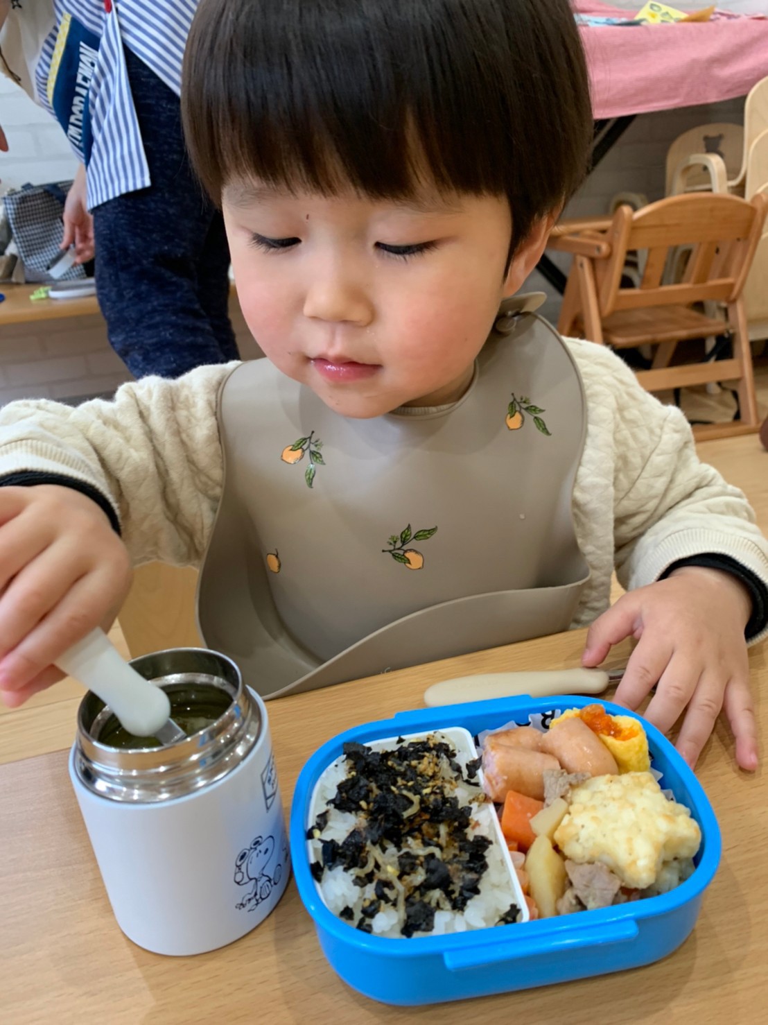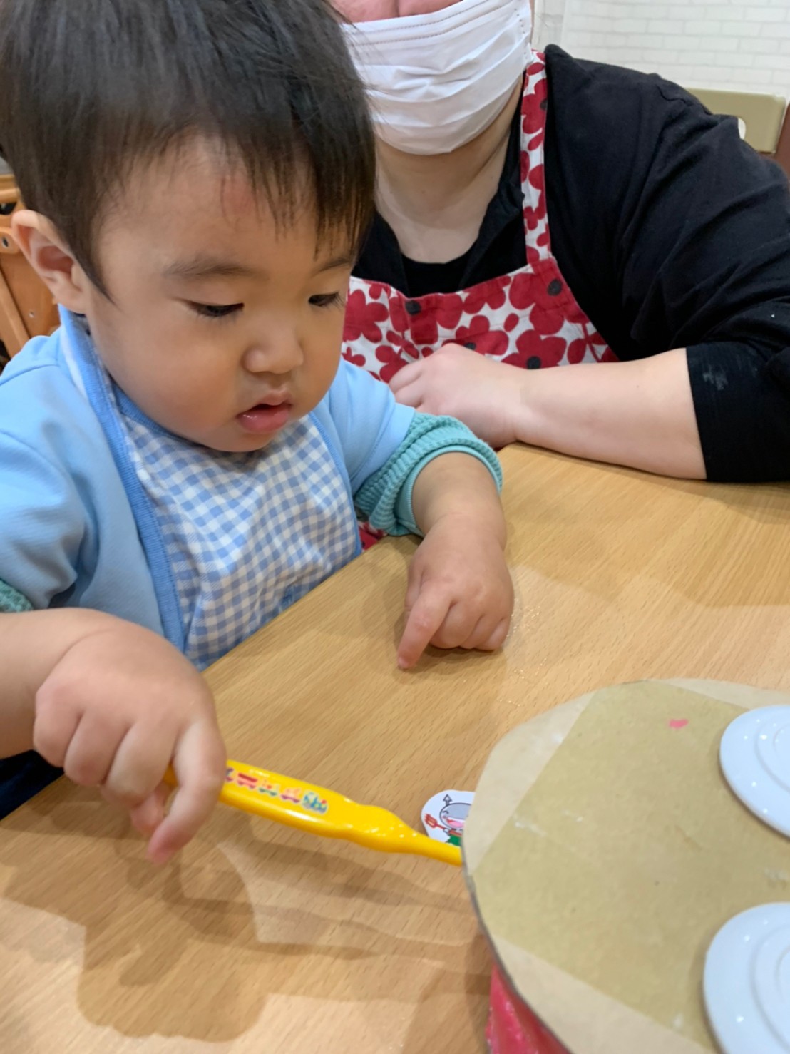 食育に参加をしました🥴 「正しい歯磨きの仕方」について栄養士からの話を最後まで落ち着いて聞くことができました🥳✨ 歯の模型に怖がる子もいたが興味深そうに見つめ触ったり、歯ブラシを実際に持ち楽しみながら歯磨きの仕方を学ぶことができました🥳またお弁当持参の日で、家庭からのお弁当を喜んで食べる姿がありました🥳雨のため終日、室内で過ごしました。