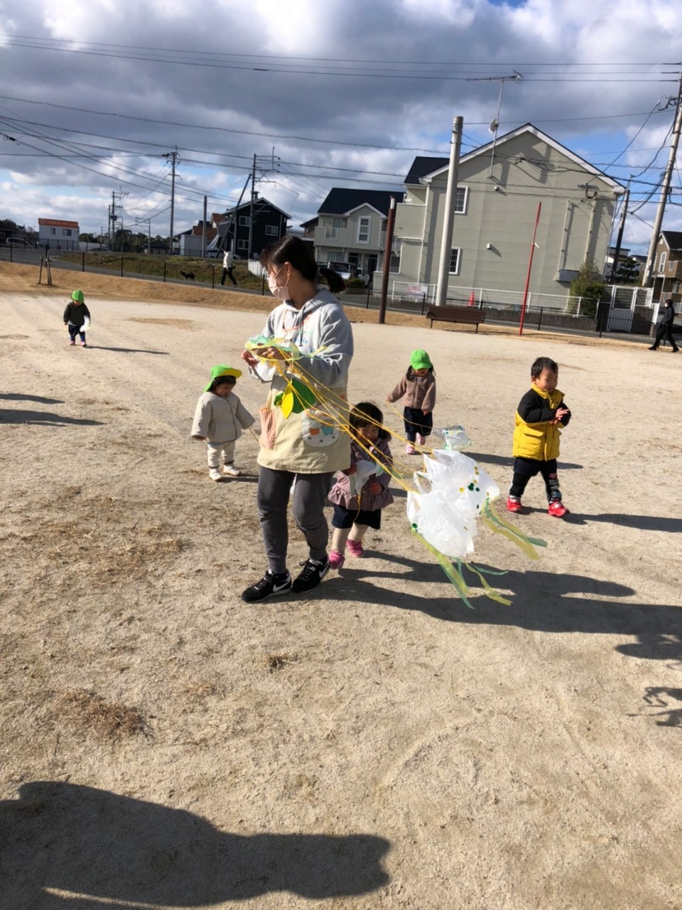 大きいお友達は、英語の歌やアルファベットを覚えてきて、知っていることを元気いっぱい答えていました✨その後は、先日作った凧を持ってむつき公園へ😆