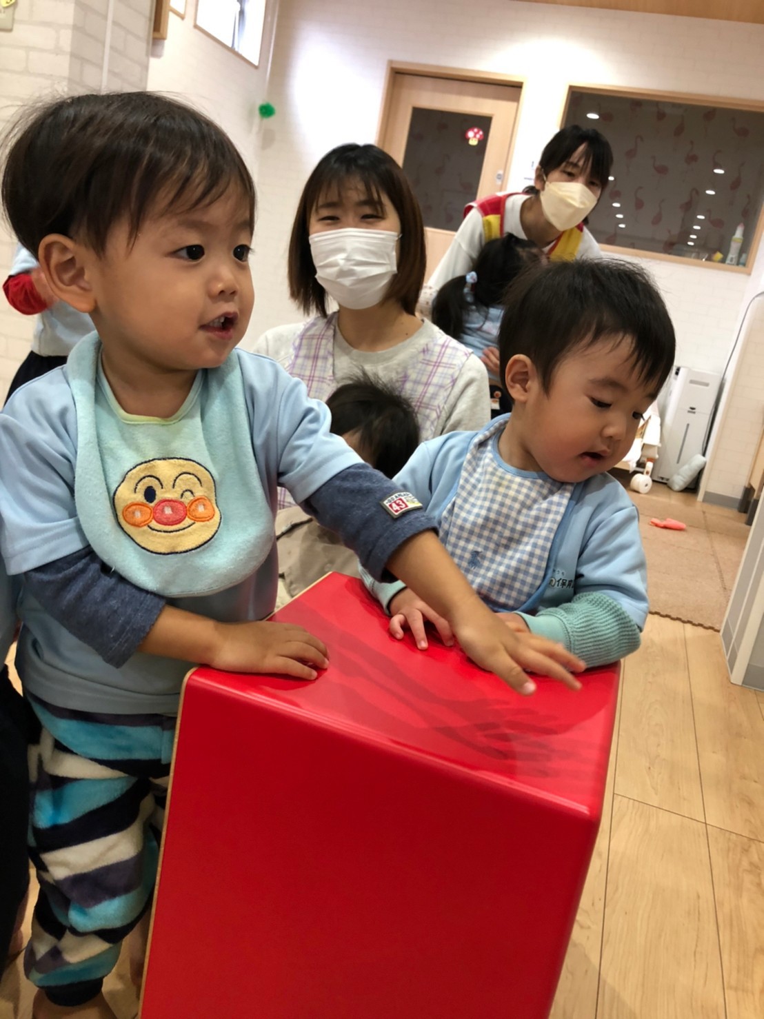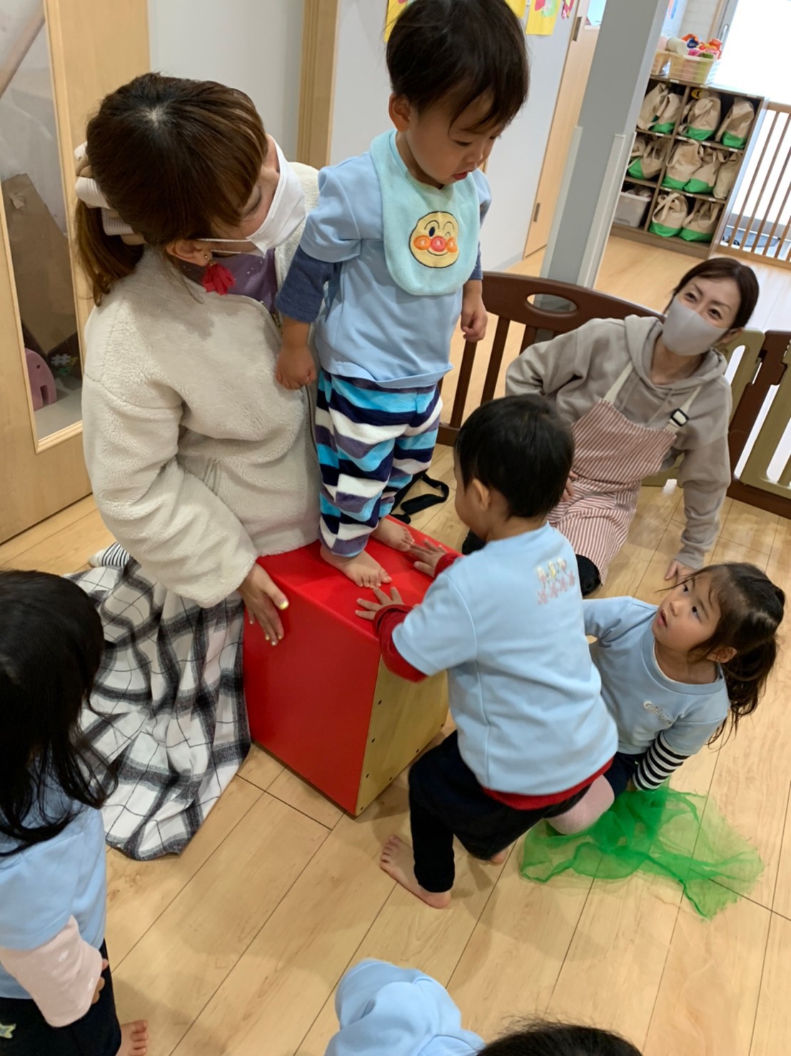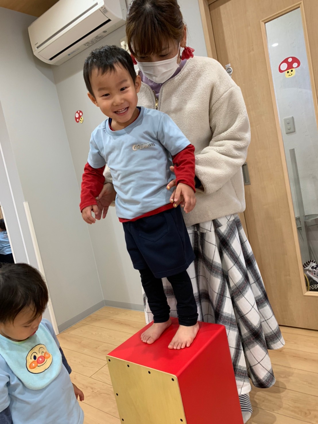 太鼓の上に乗って叩いたり、太鼓のリズムに合わせて『パプリカ』を踊ったり『もう、一回パプリカして〰️😆』とエンドレスで楽しむ子供達でした💓