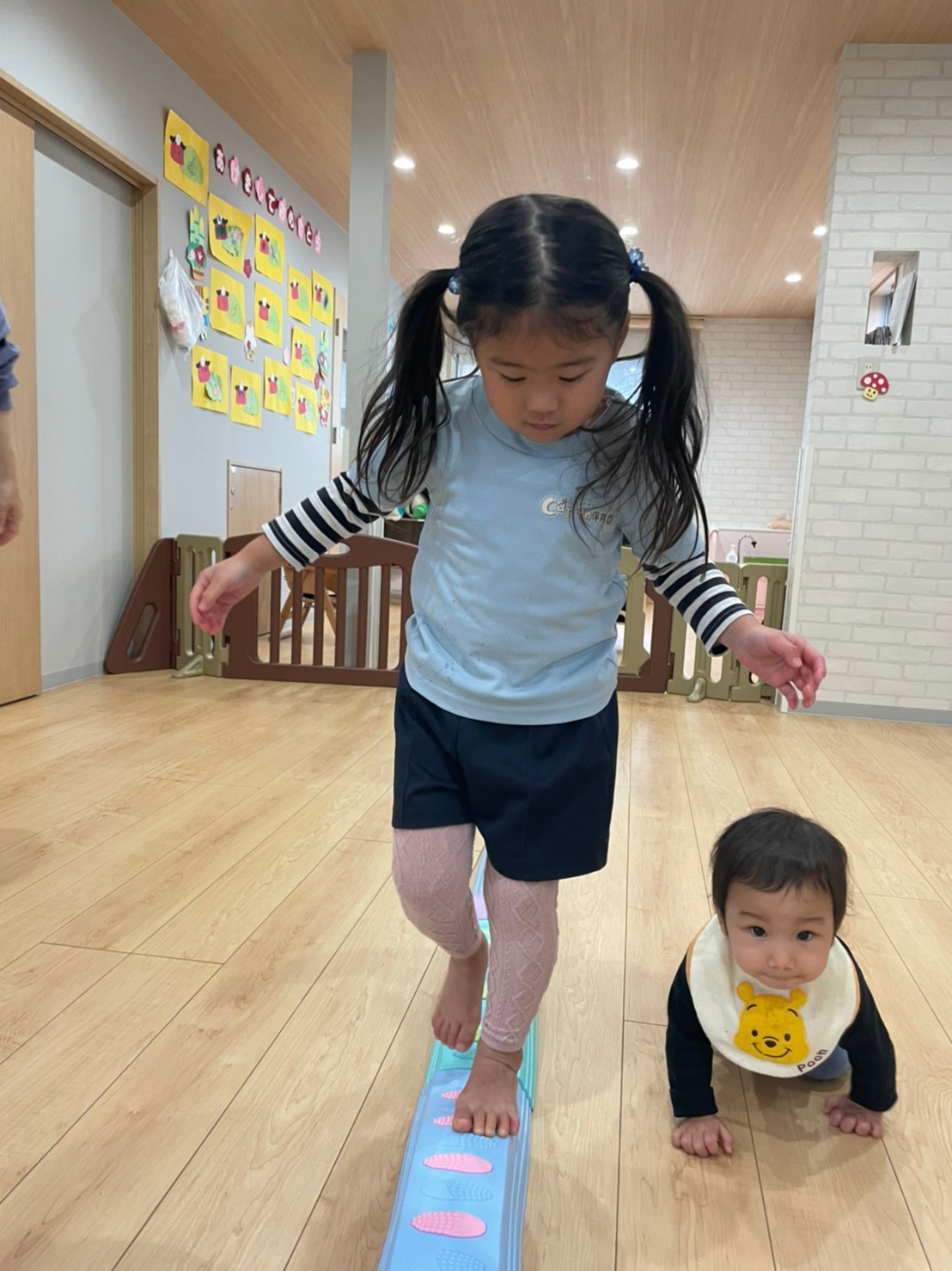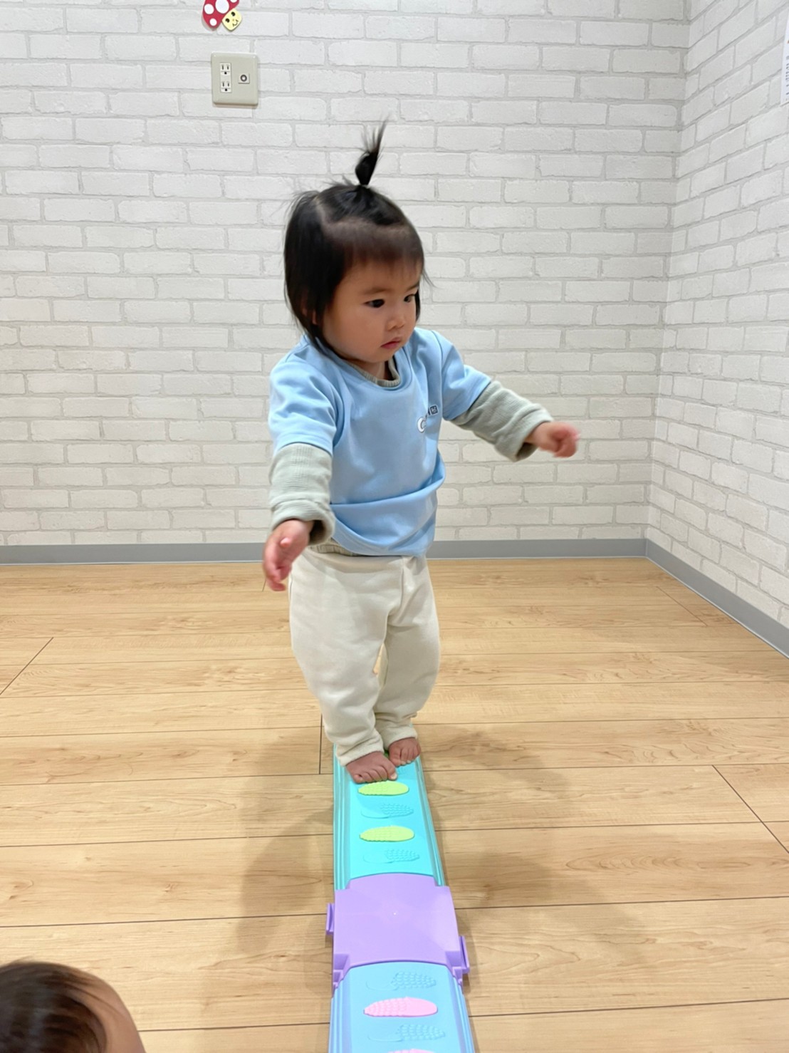 平均台では保育者と一緒に手を繋いで渡って楽しんで