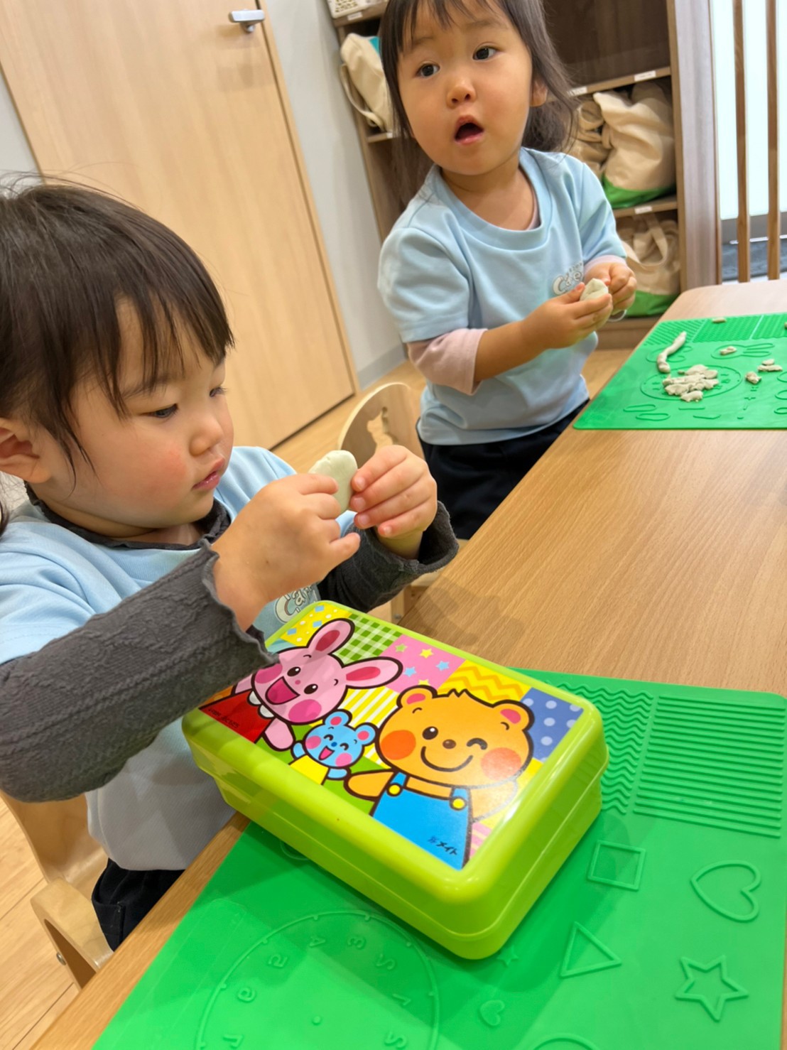 順番に交代で遊び、粘土を小さくちぎり遊ぶ友達や