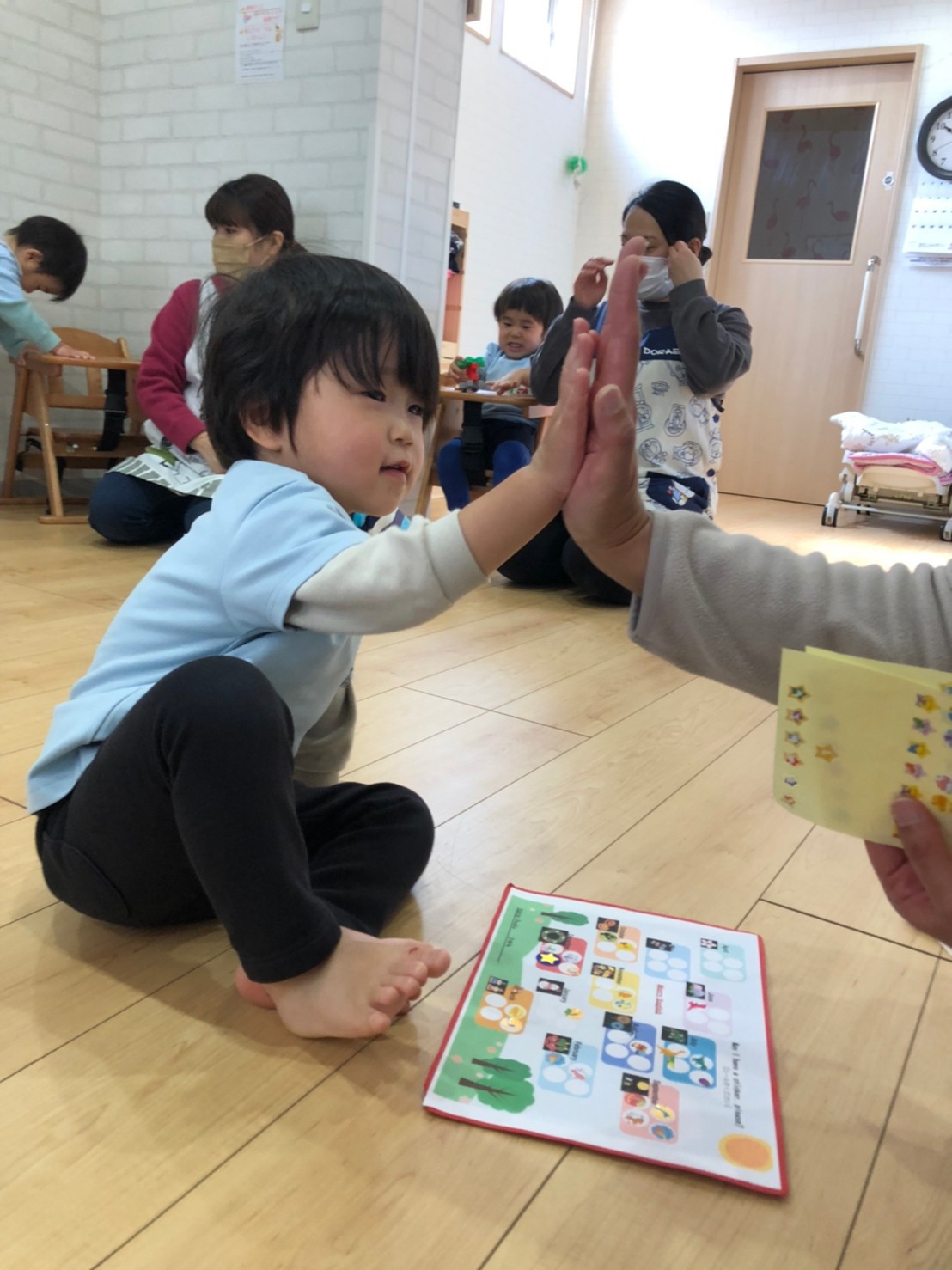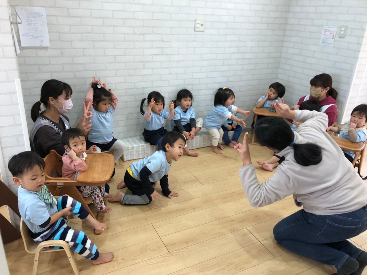 『あたまかたひざぽん』の英語バージョンの歌では、どんどん早くなっていく音楽においつこうと一生懸命頑張る子どもたち😆