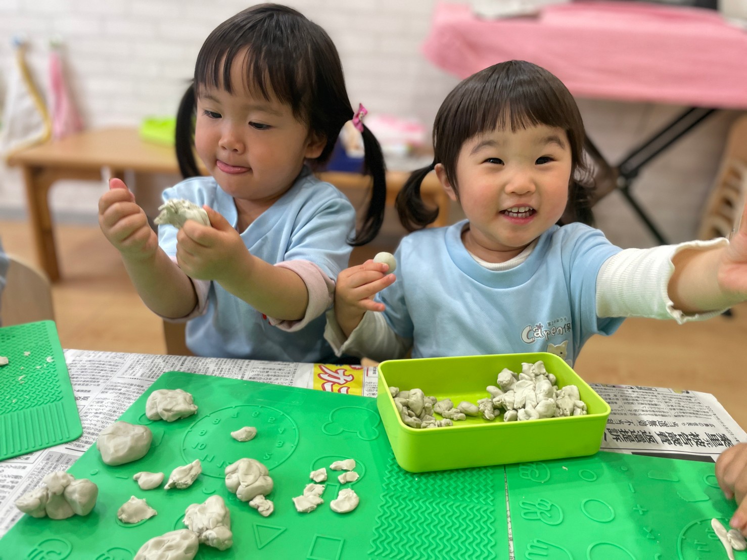 今日は朝からあいにくの雨だったので、お部屋で粘土やスノーブロックを出して遊びました😊