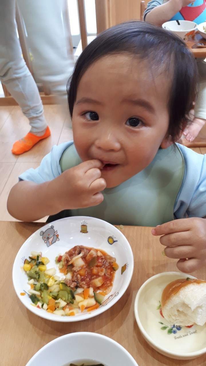 シャボン玉を追いかけたり砂遊びをしたりして、元気いっぱい遊びましたよ😆💕【ふくつ園の今日の給食です】