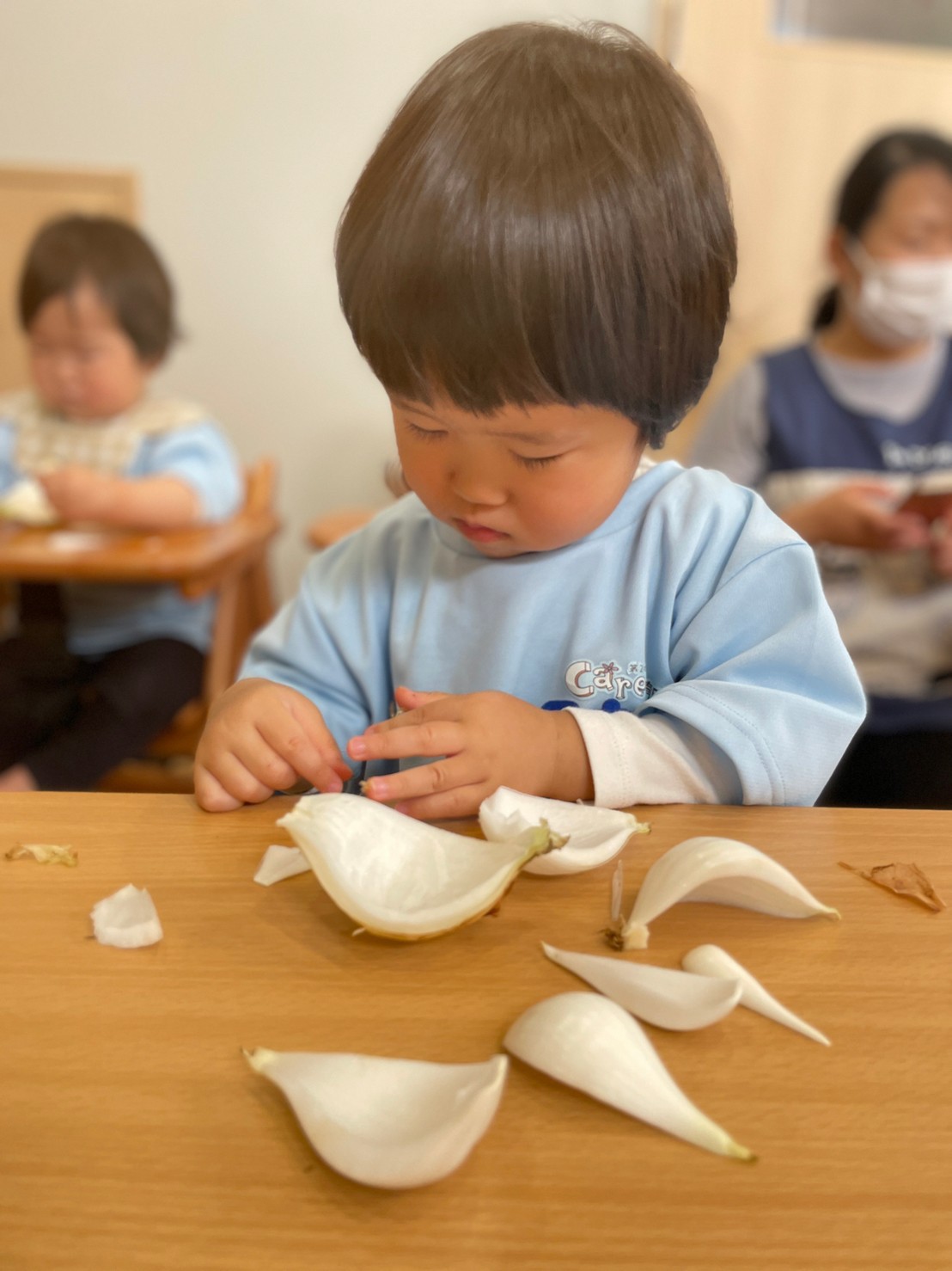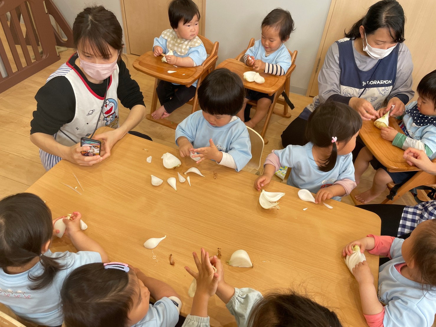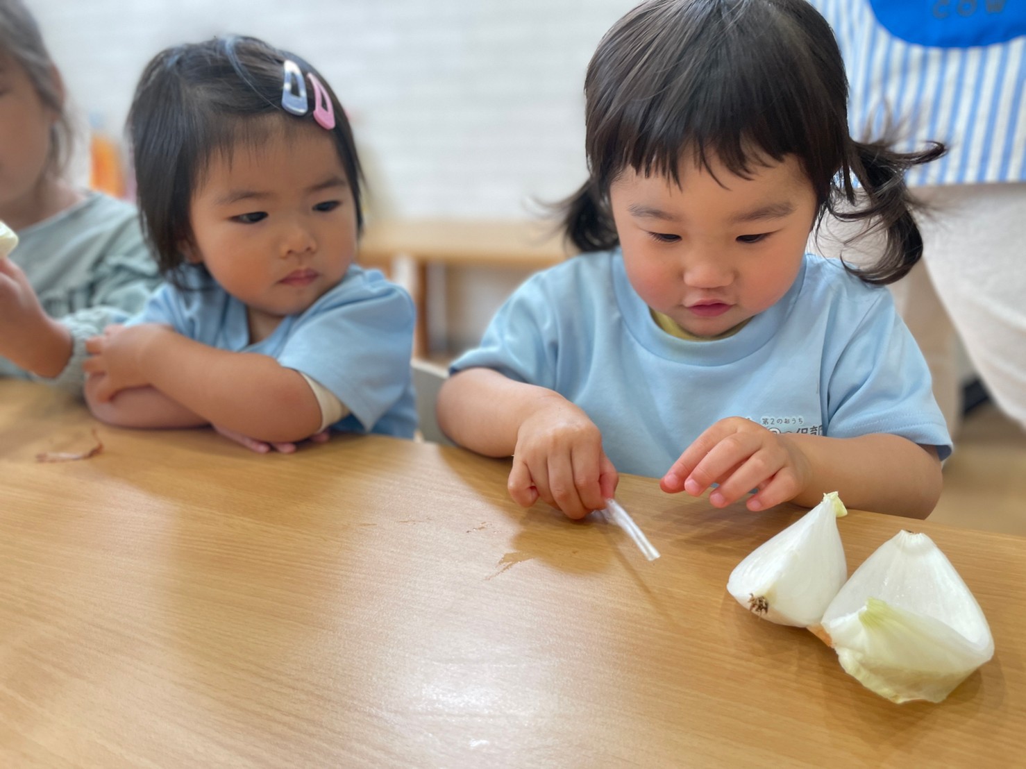 今日は食育で『春の食材』についてのお話がありました🎶子どもたちは、興味津々に、玉ねぎ・そら豆・スナップえんどうに触れていましたよ🤗