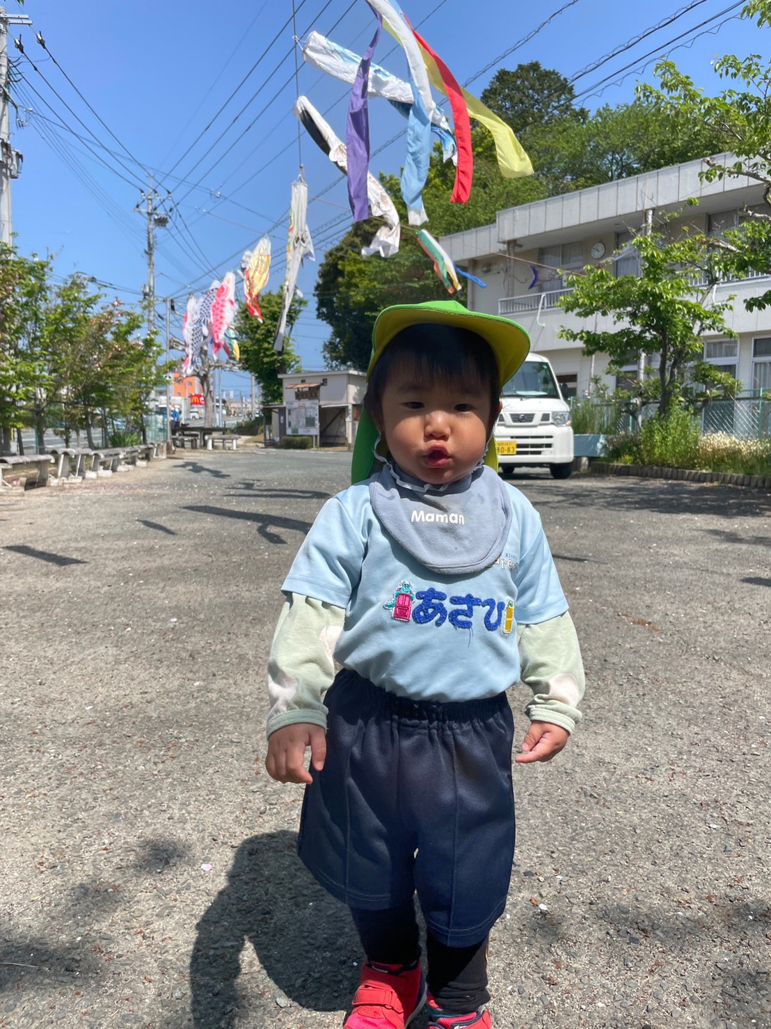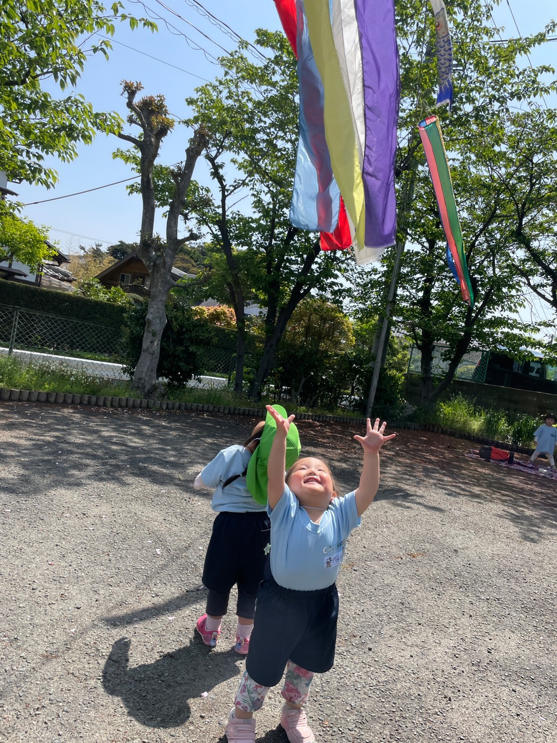 青空の下で気持ち良さそうに泳ぐ鯉のぼりの下で記念撮影をして、砂場道具で遊んで帰って来ましたよ🎶💗【ふくつ園の今日の給食です】
