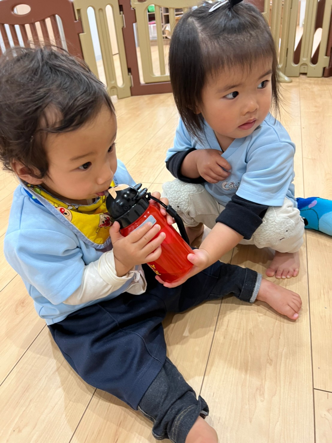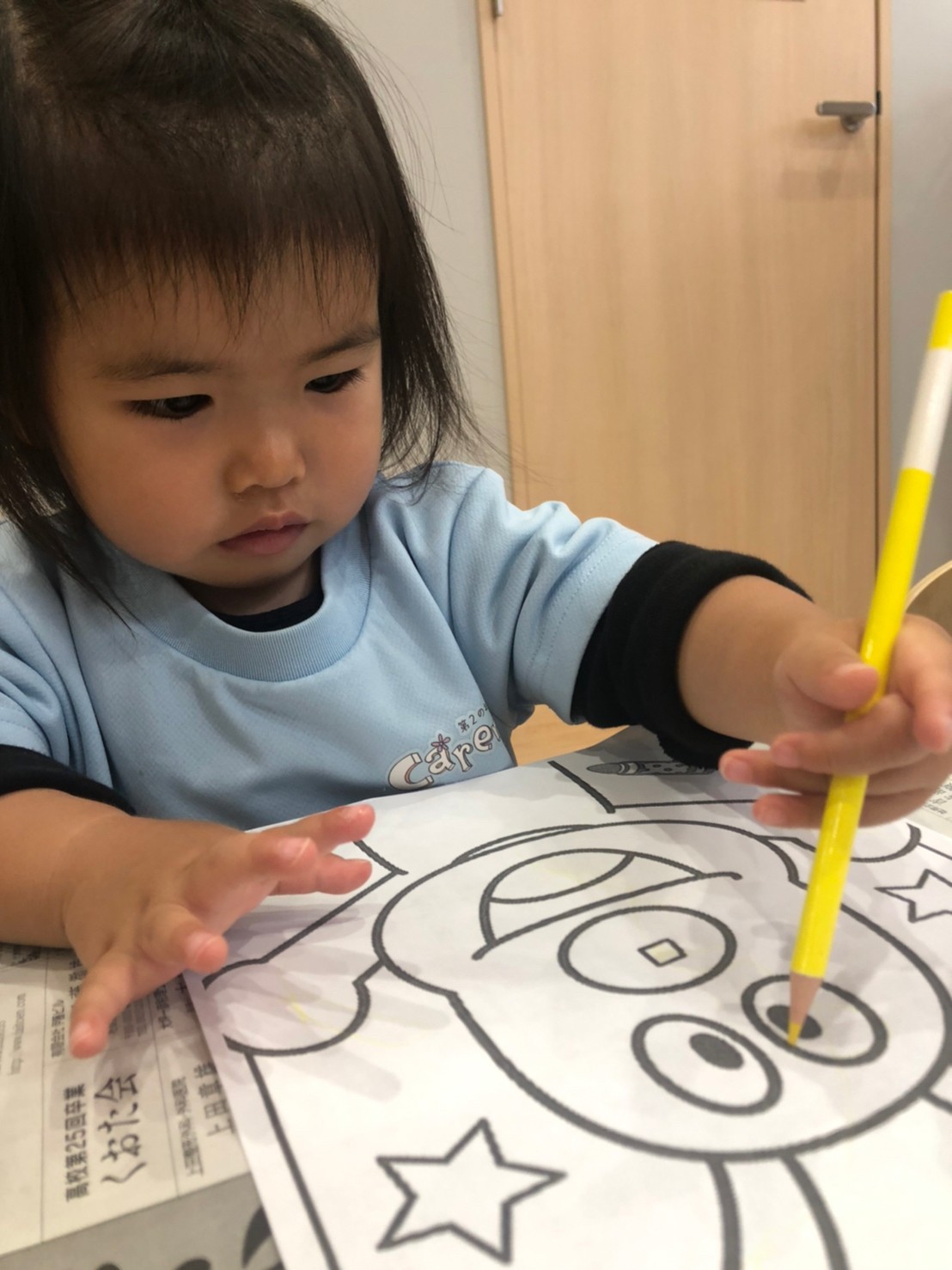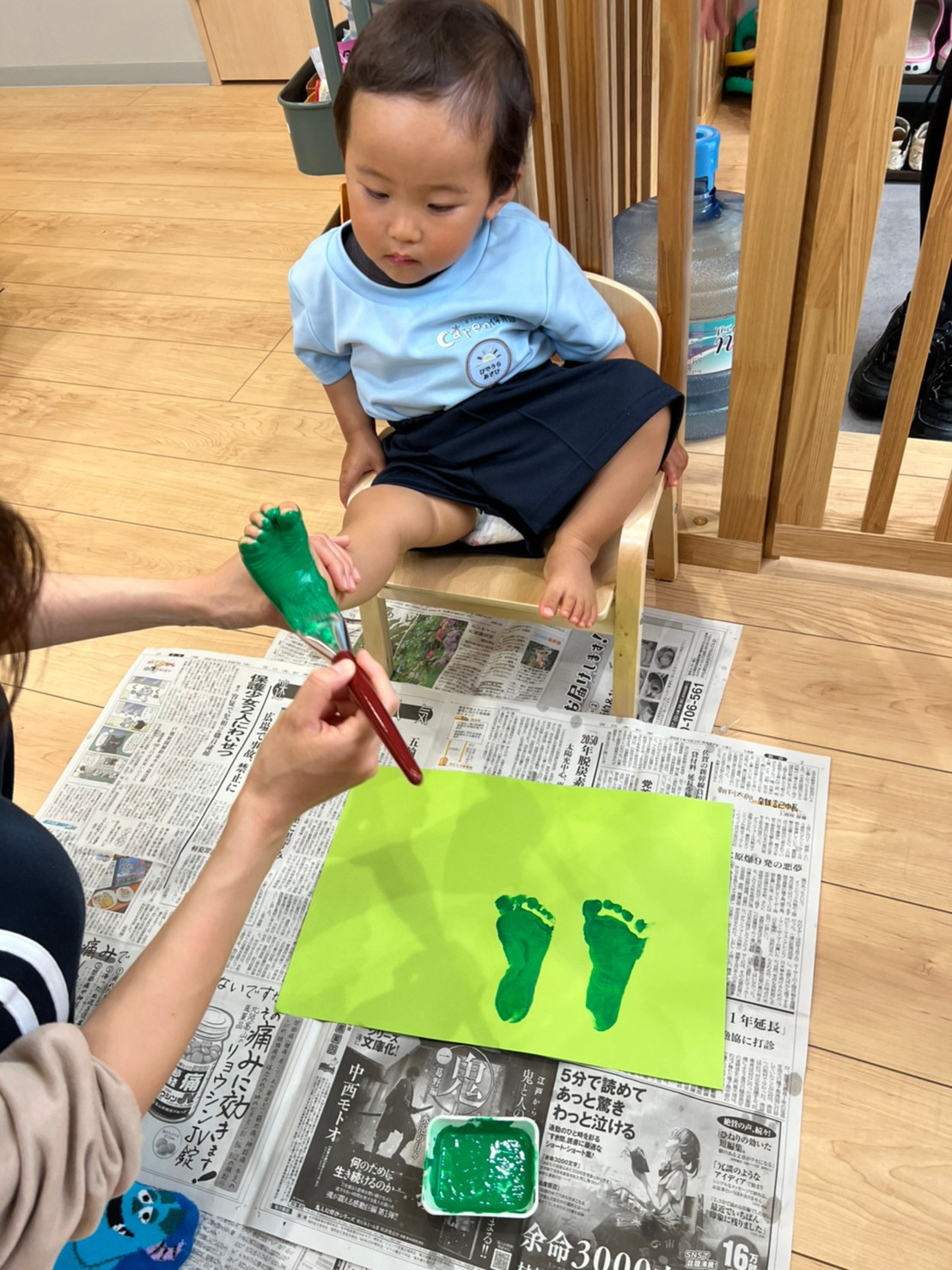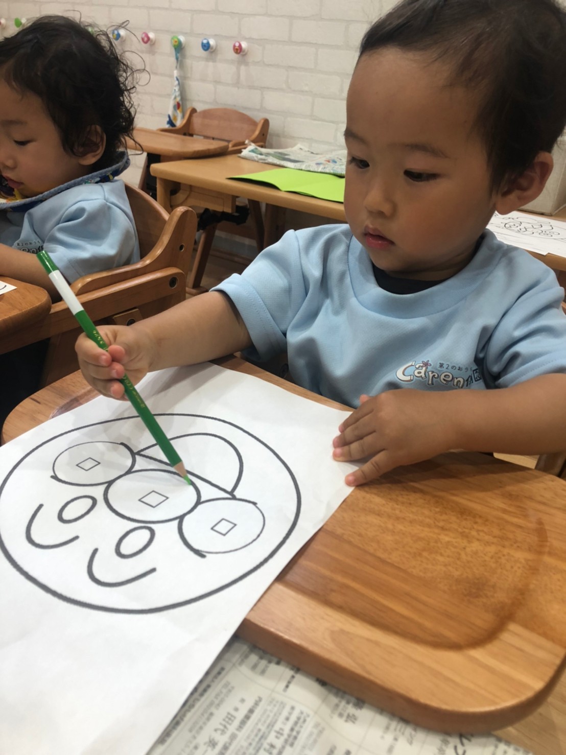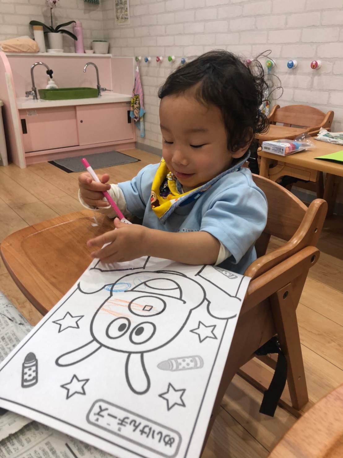 朝から雨だったのでお部屋でゆっくり過ごしました😊あんぱんまんの塗り絵をしながら順番に足形とりをしましたよ💕