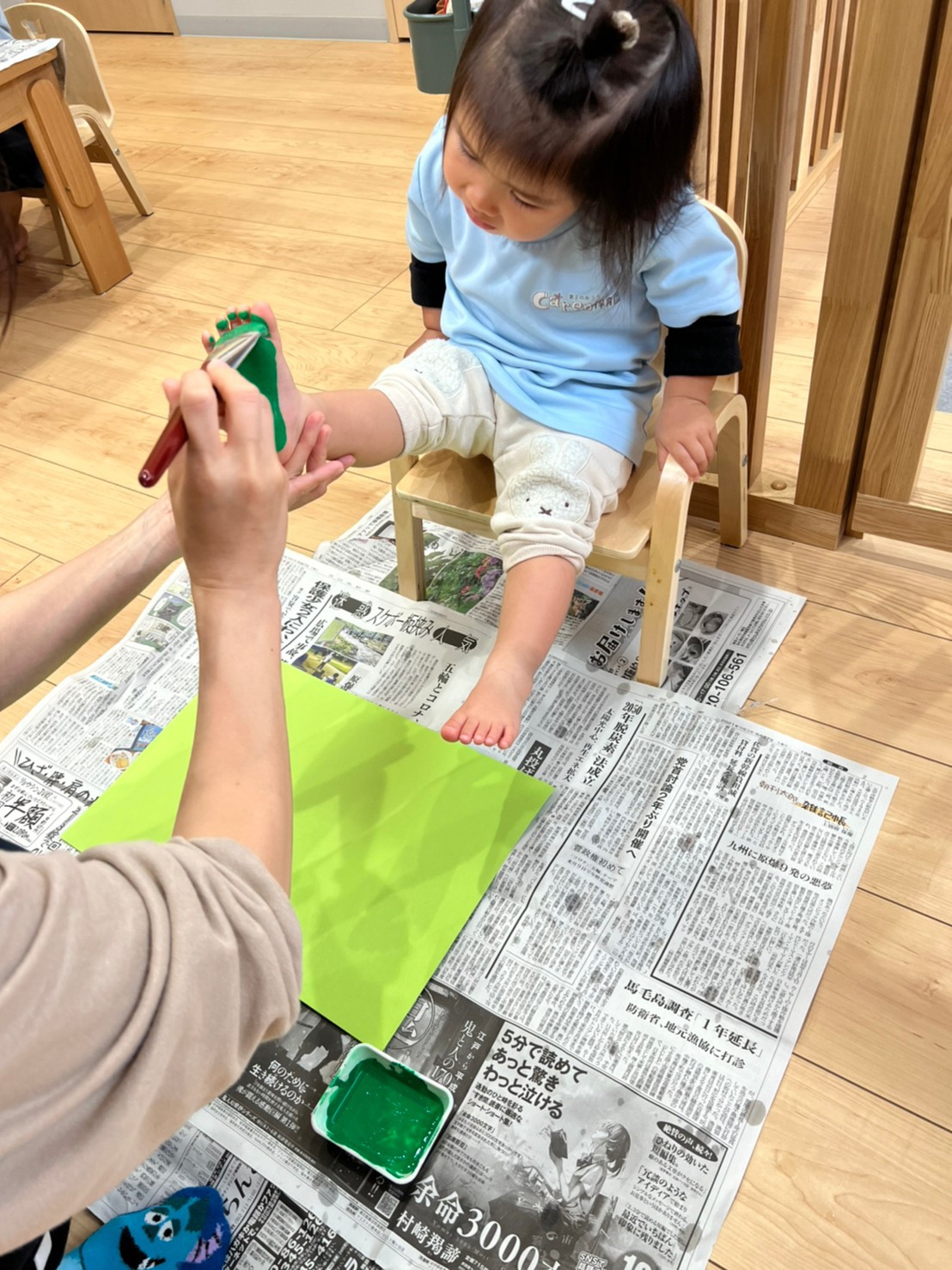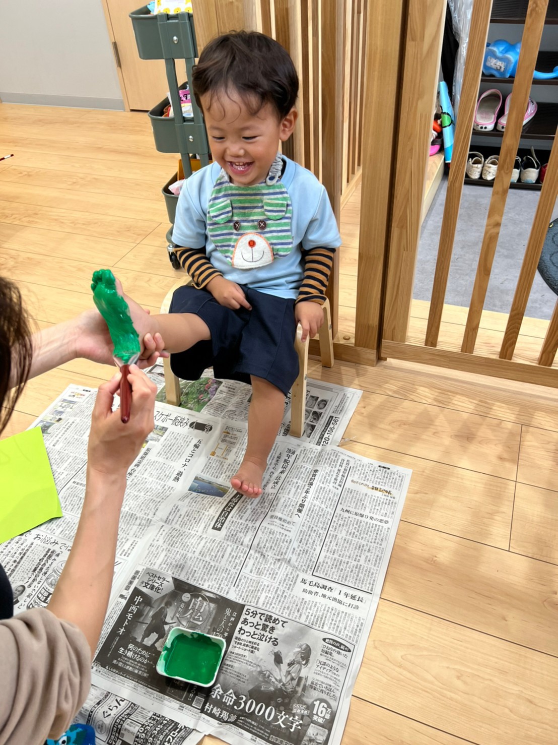 先生から筆で絵の具を塗ってもらうと、くすぐったくて思わず笑顔が溢れる子、じっとその様子を見つめる子など、いろんな表情を見せてくれました😆