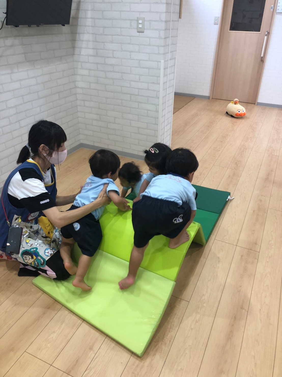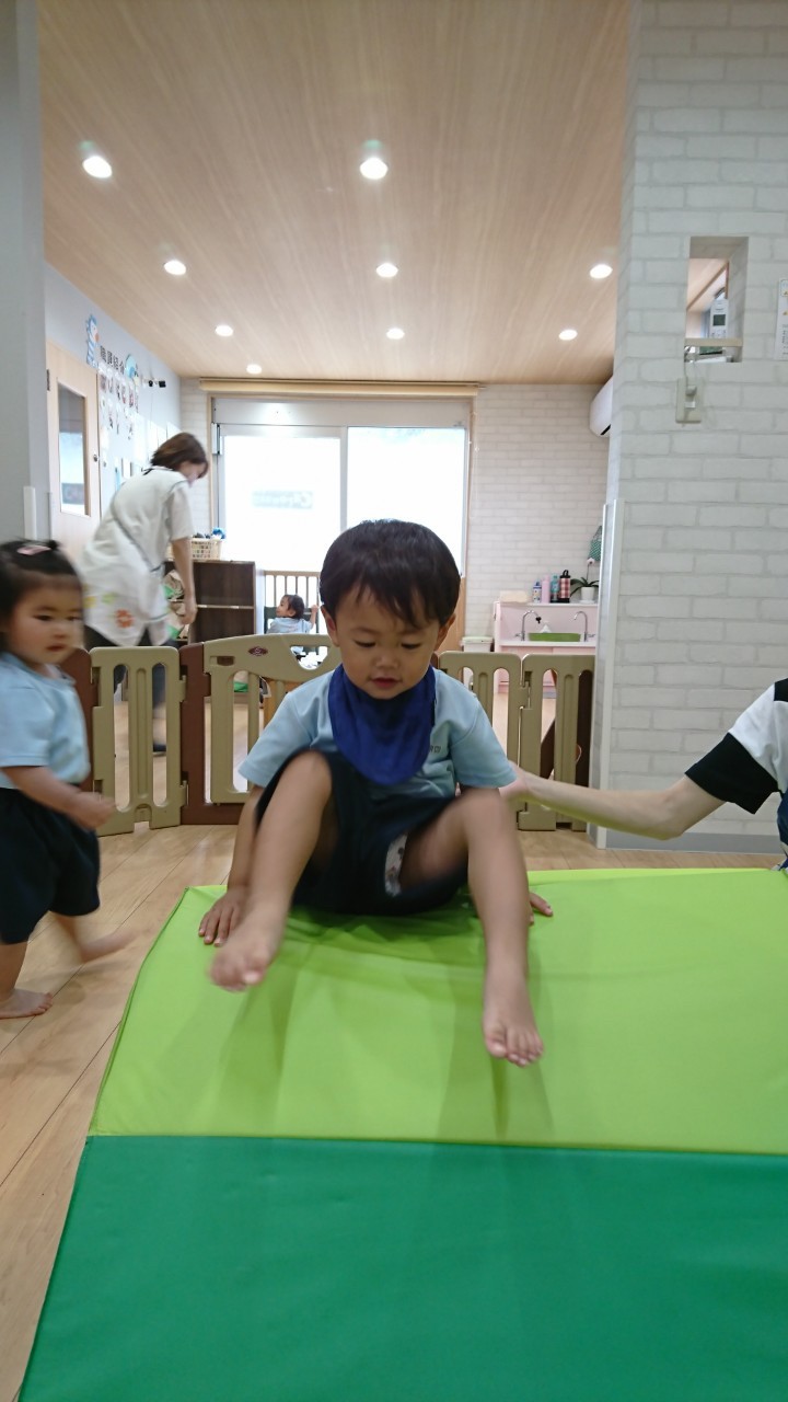 マットを滑り台のようにしてあげると順番に上から降りたりして楽しんでいた子ども達💓