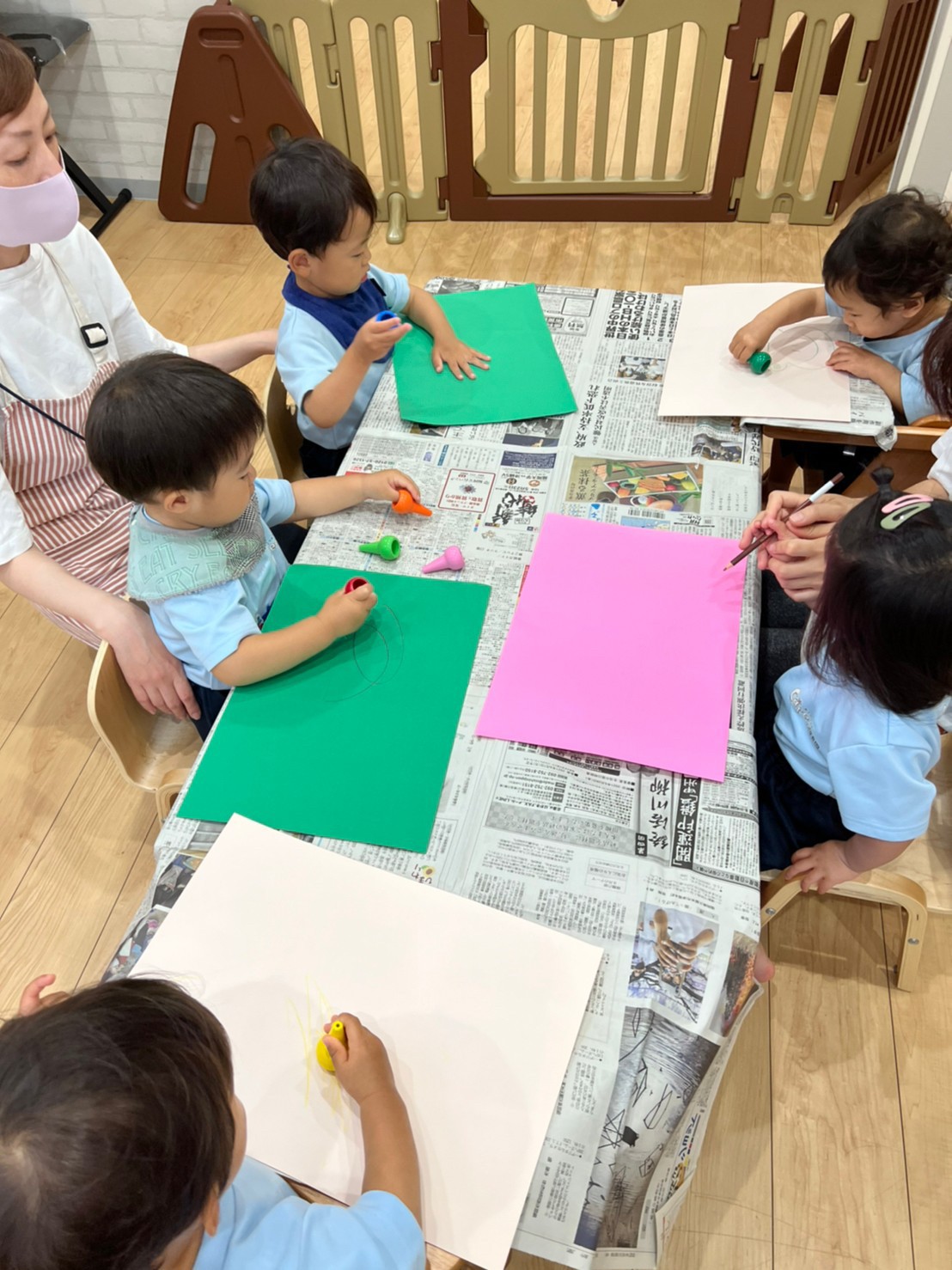 今日は室内でお絵描きをしたりマットやトンネルで遊びました😋🙌思い思いになぐり描きをして、出来上がりを嬉しそうに見せていましたよ🥰