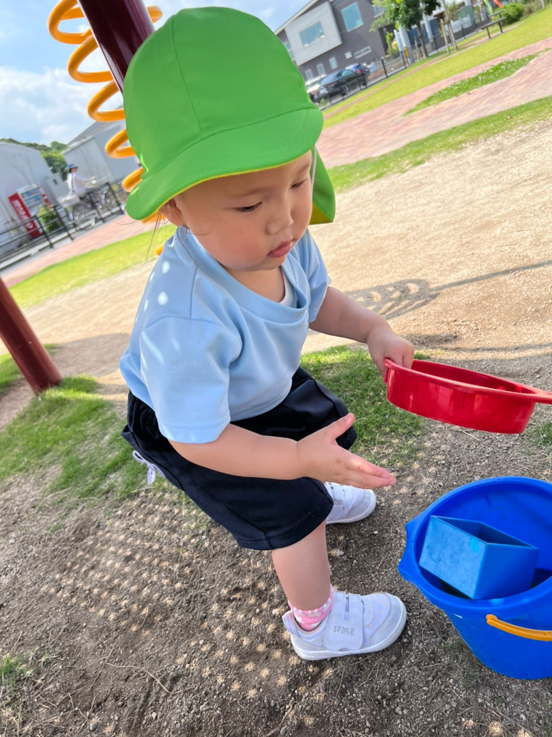 スコップやバケツを持って砂遊びを夢中で楽しんだりして