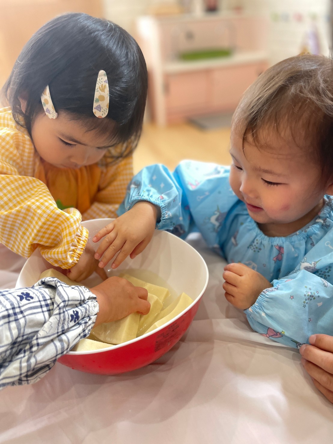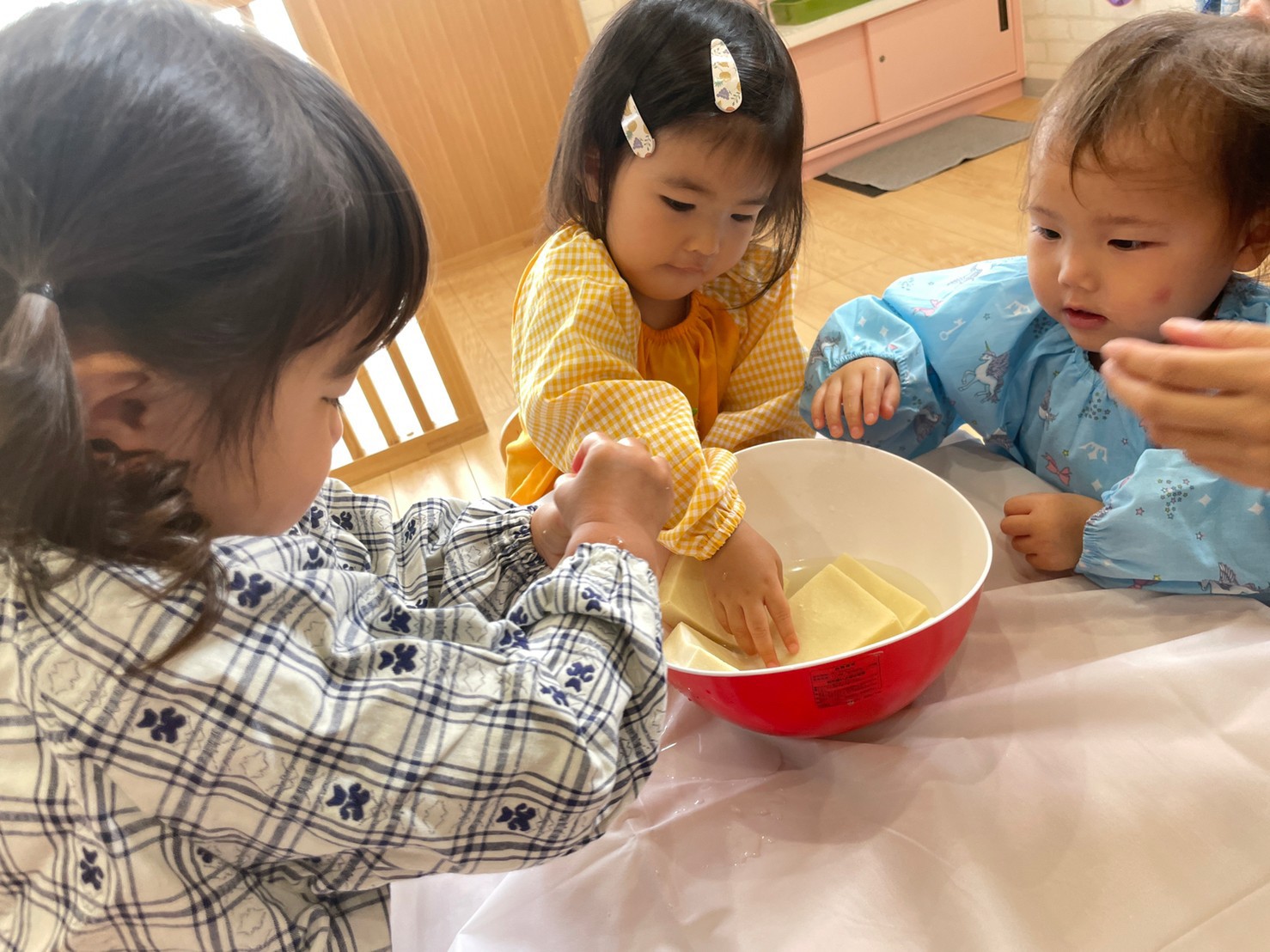 その後は、高野豆腐を使って感触遊びをしました😊