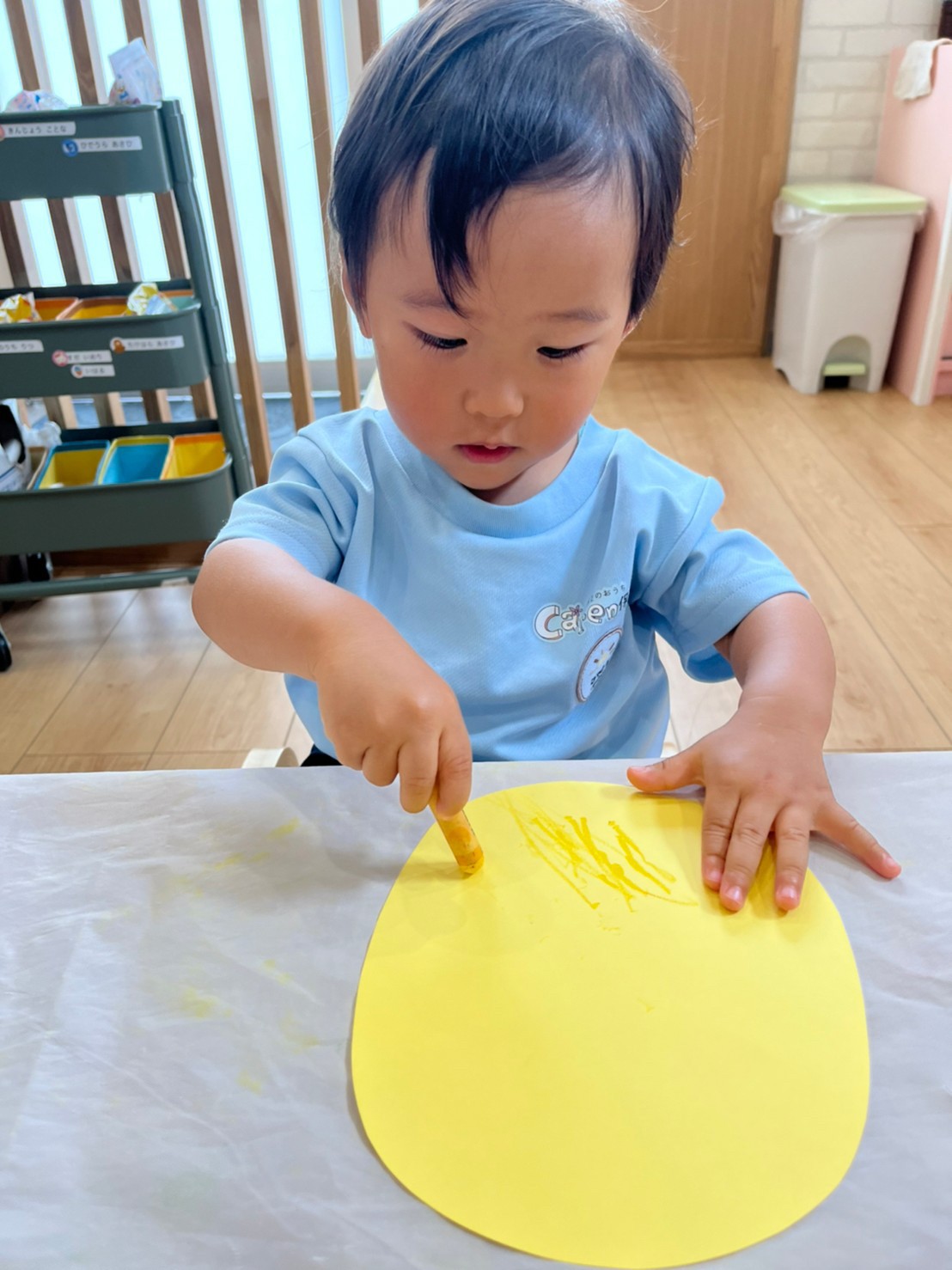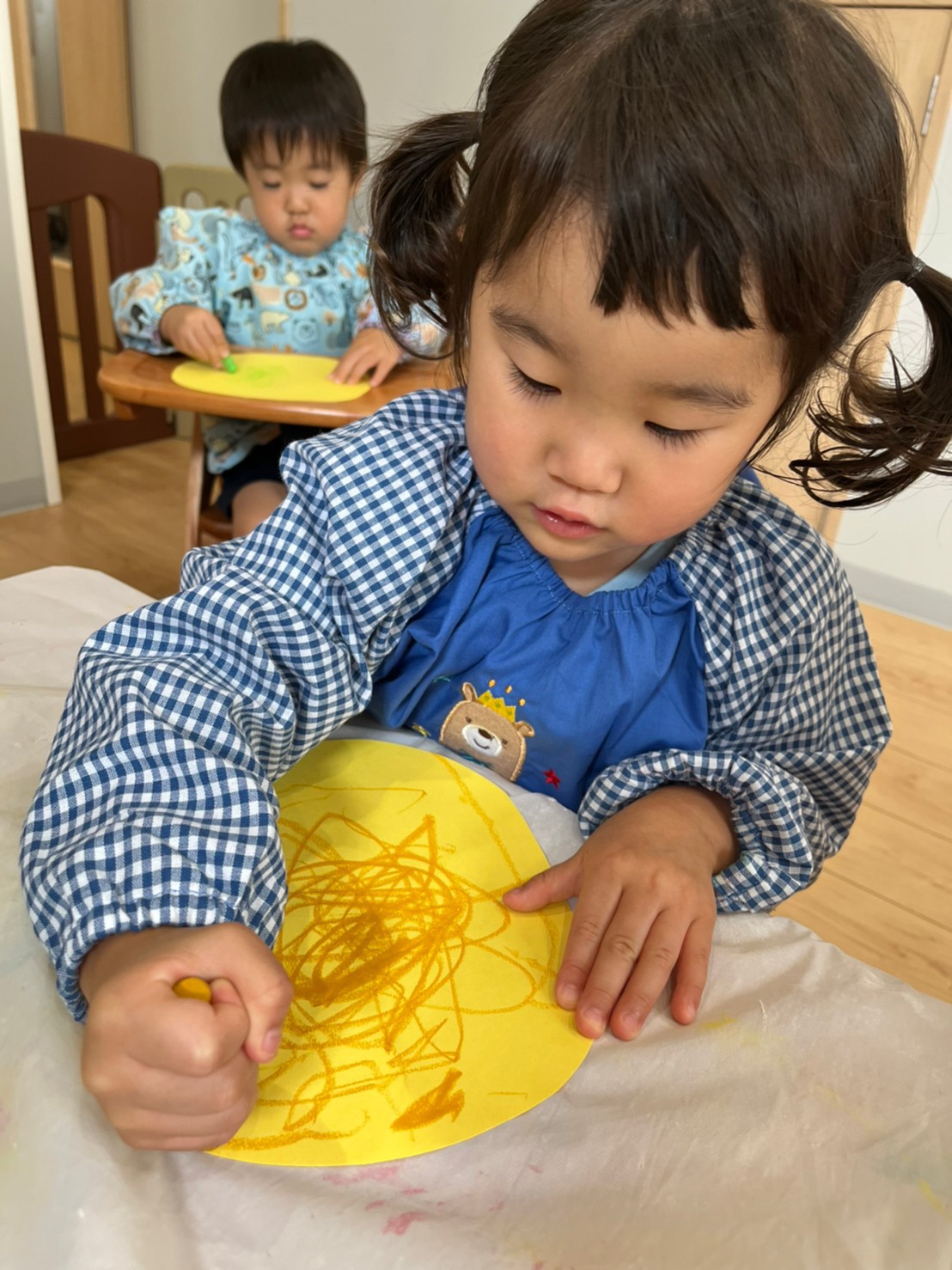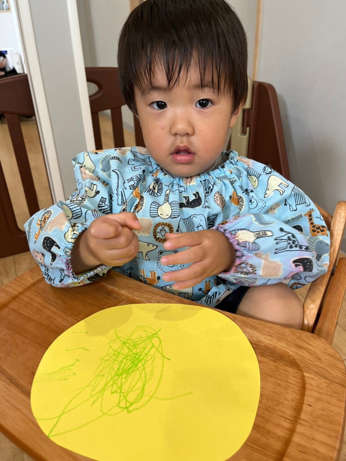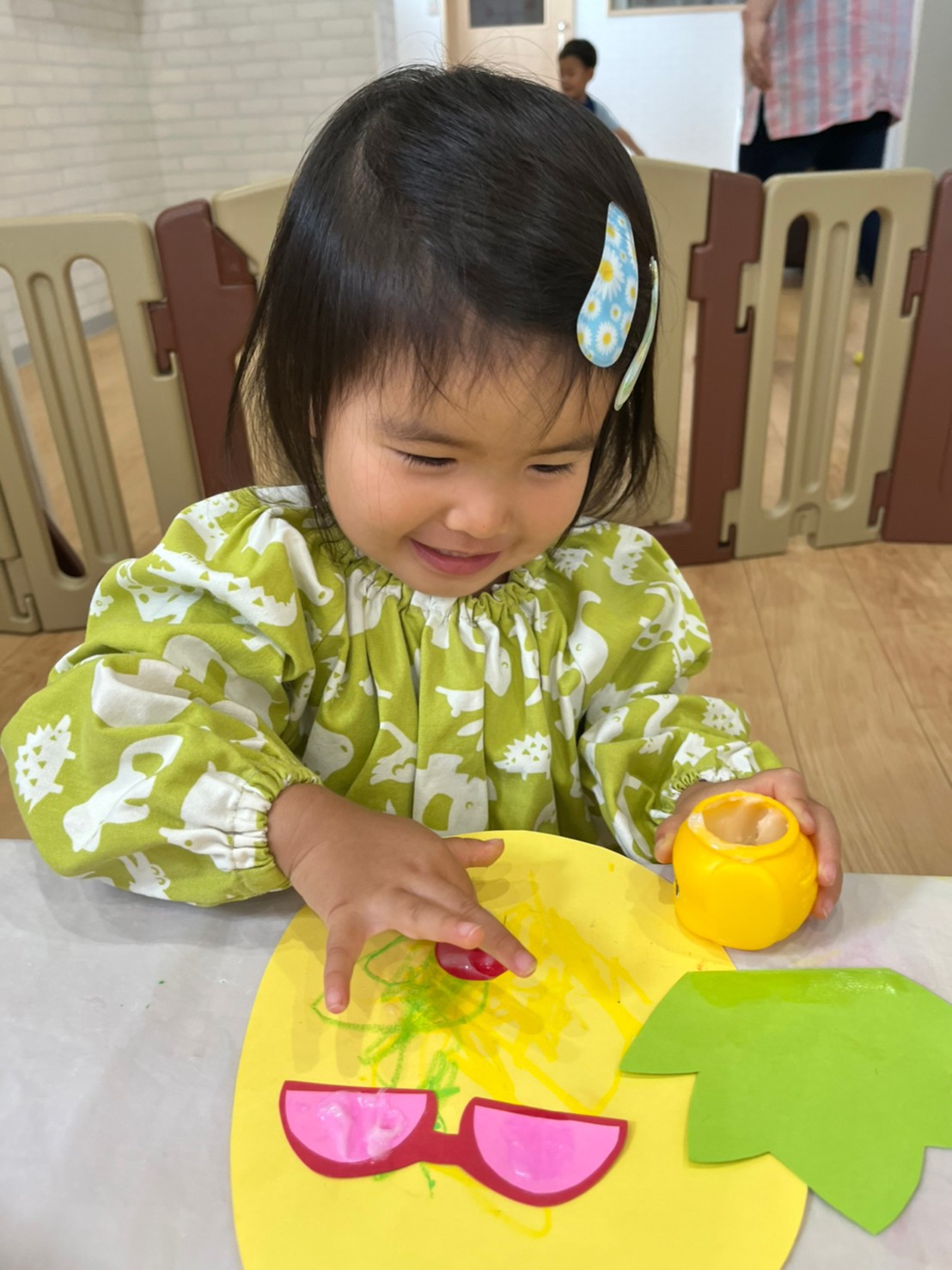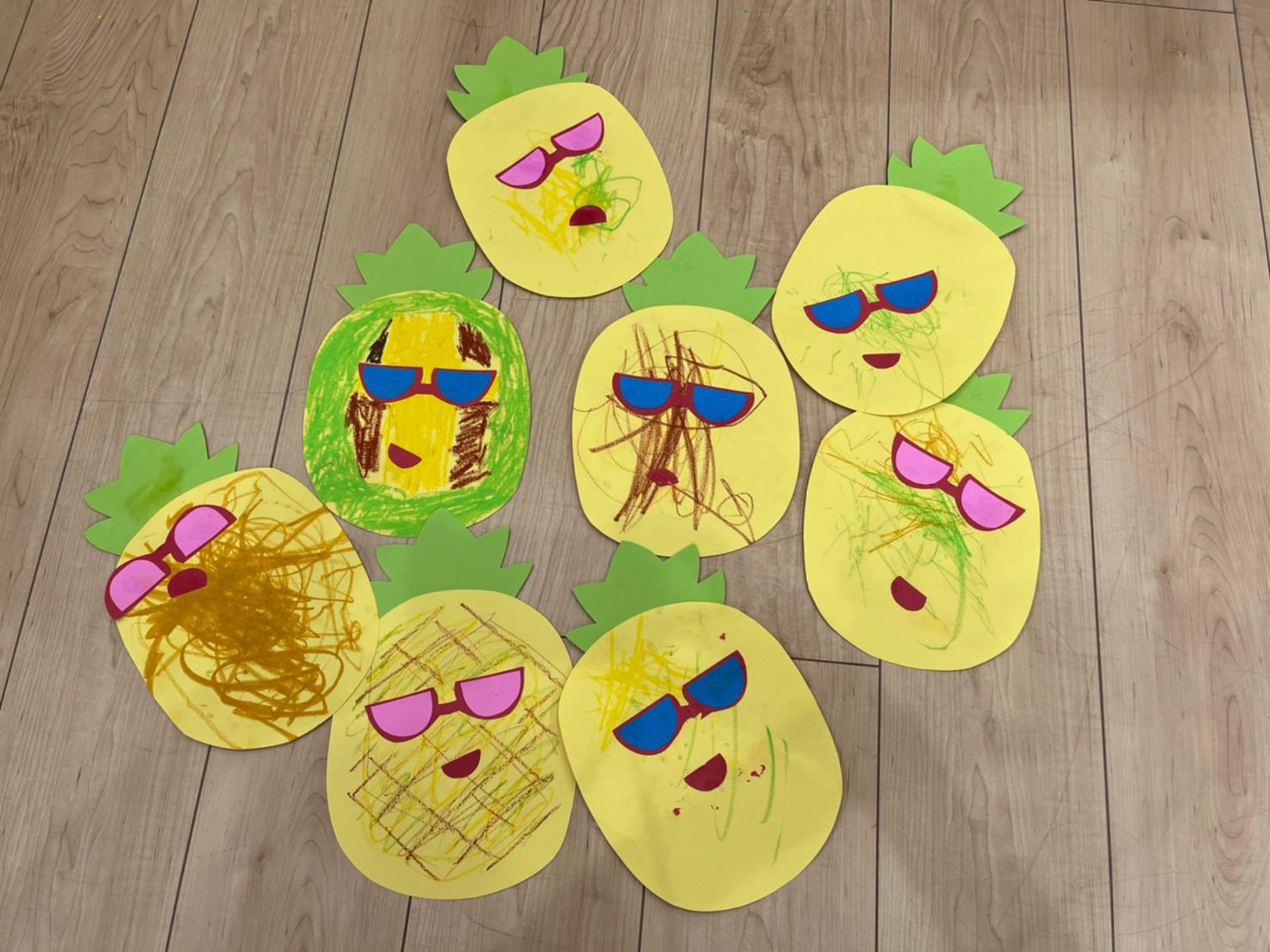おやつを食べてパイナップルにお絵描きをしました🍍カラフルに描く子、力強くクレヨンを握って塗る子とそれぞれで、色んな表情のパイナップルマンが出来ました😆
