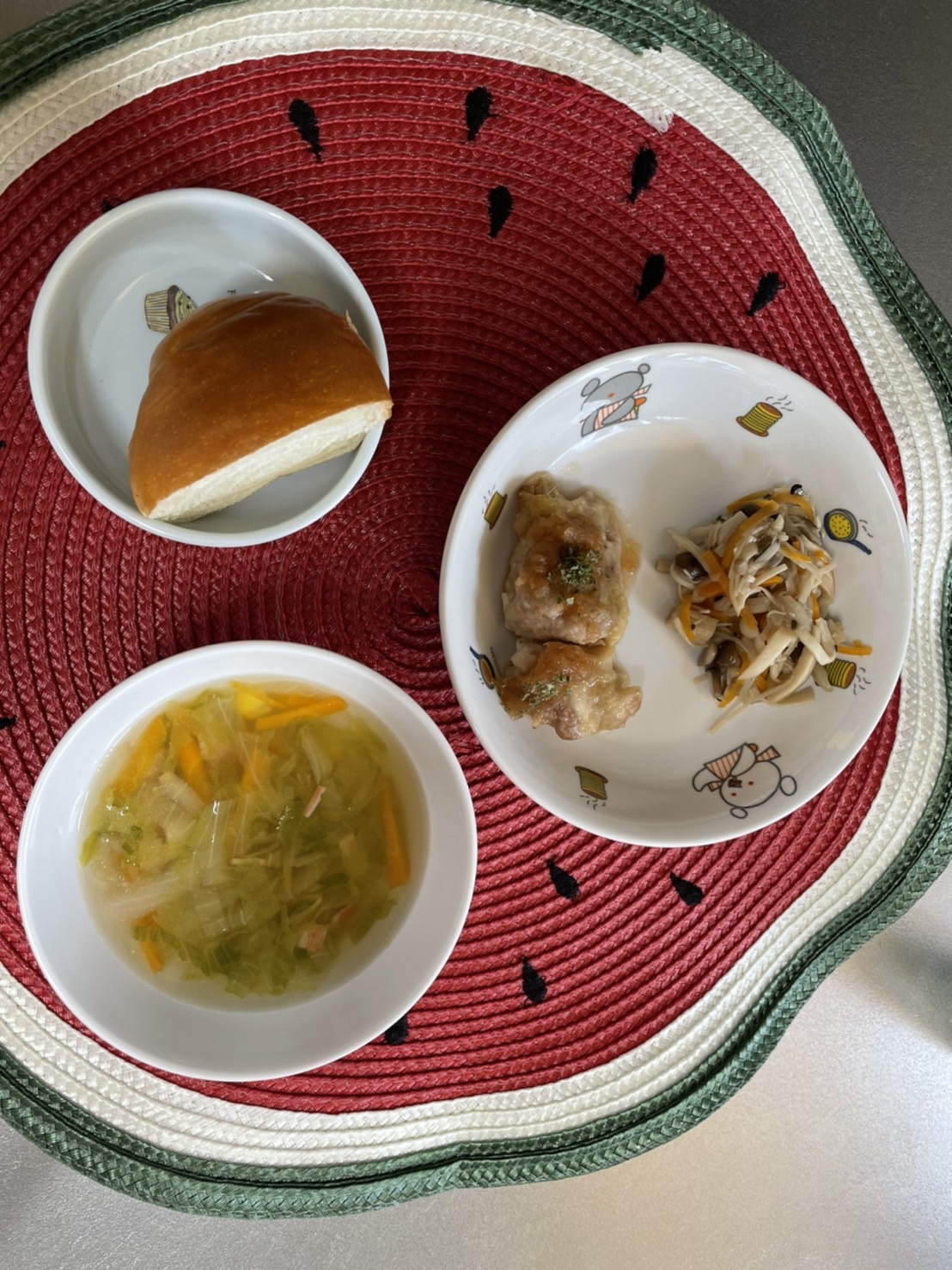 残暑や雨で外に出れない日が続いていますが、絵の具や感触遊び、運動会の練習などの活動をしながら、室内でも元気いっぱい、楽しい時間を過ごしています🥰【ふくつ園の今日の給食です】