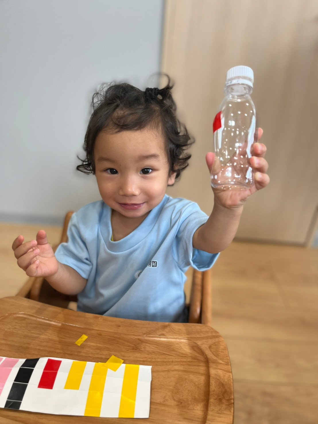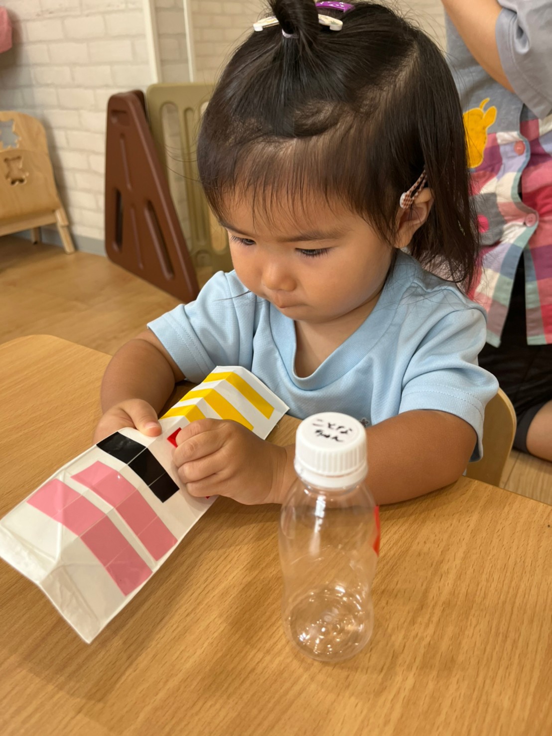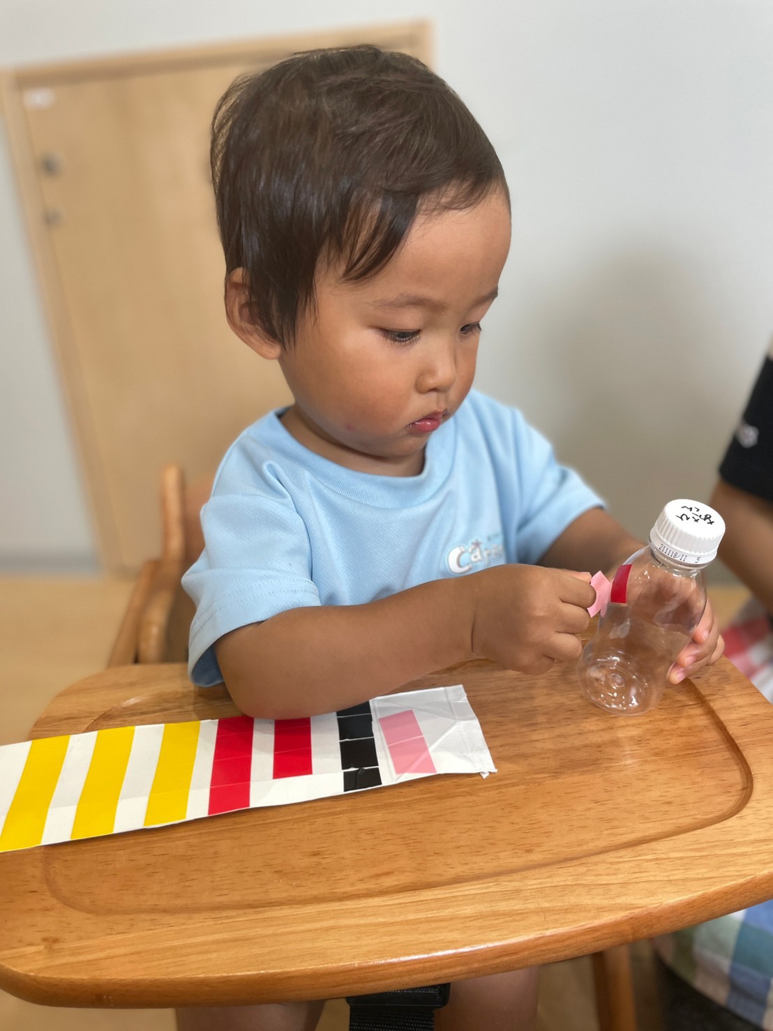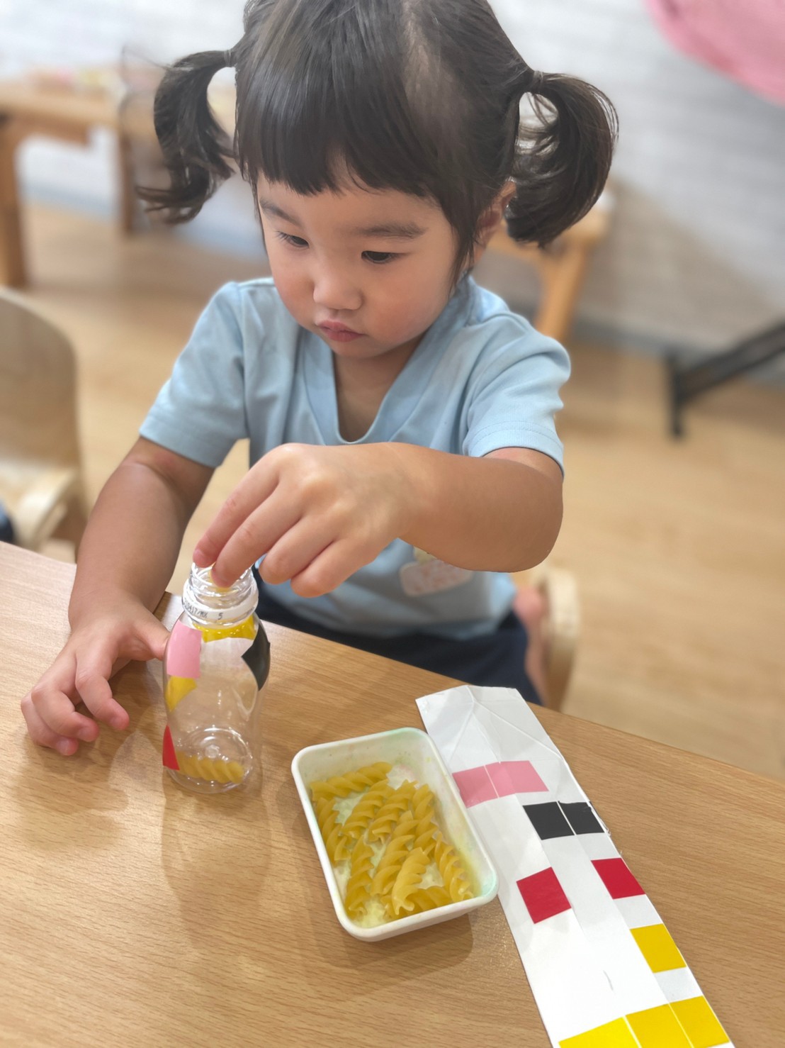小さく切ったビニールテープを台紙から剥がし、空き容器に貼ってデコレーションした後は、マカロニを入れてマラカスの出来あがり(マラカス)💕