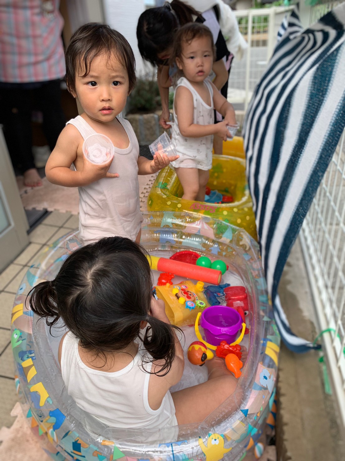 水面をバシャバシャ叩いたり、カップを使って水のあけうつしをしたりして、冷たい感触に心地良さを感じながら夢中で遊んでいましたよ😍