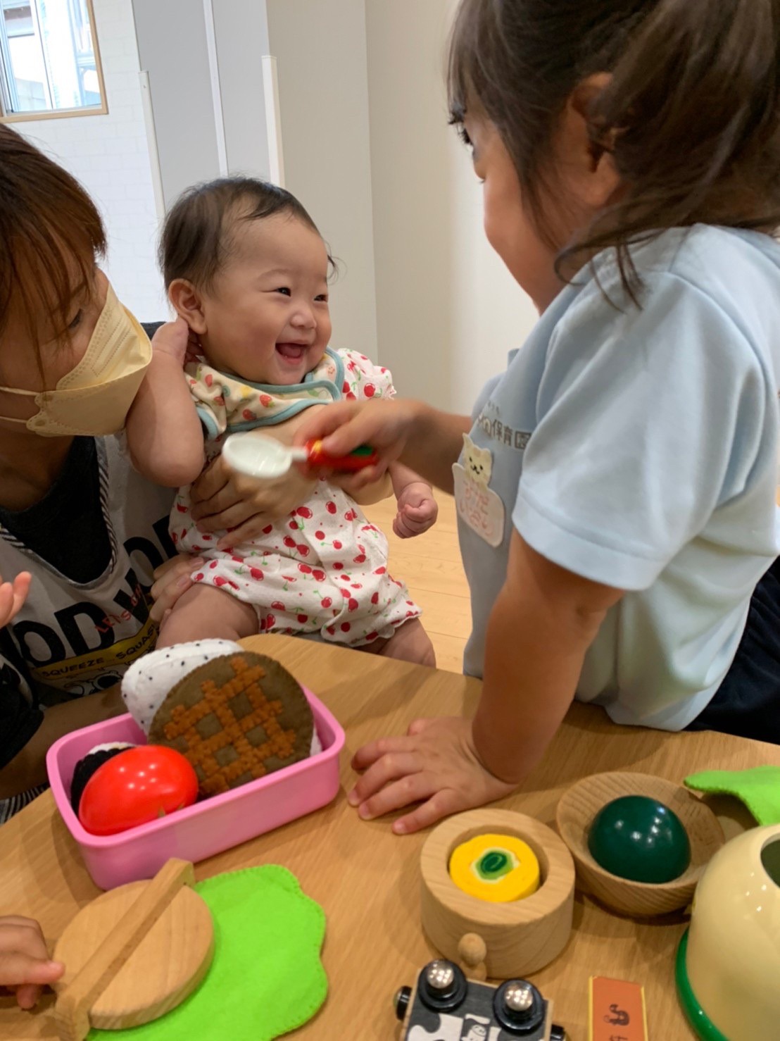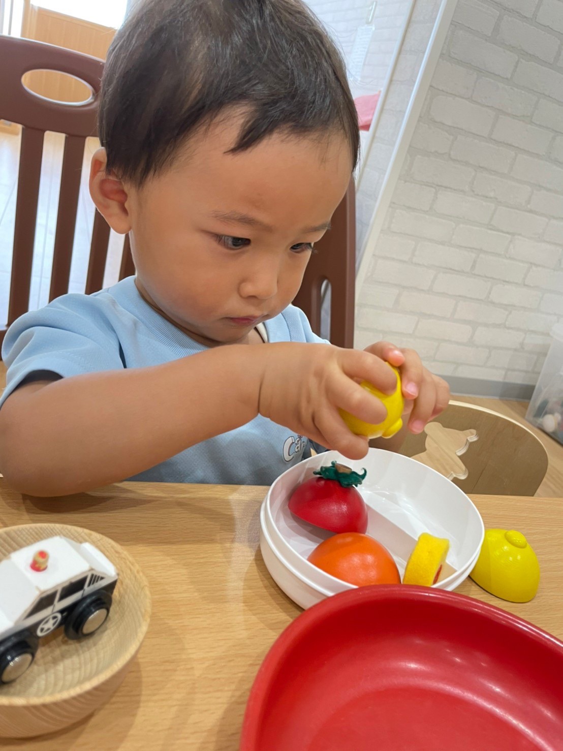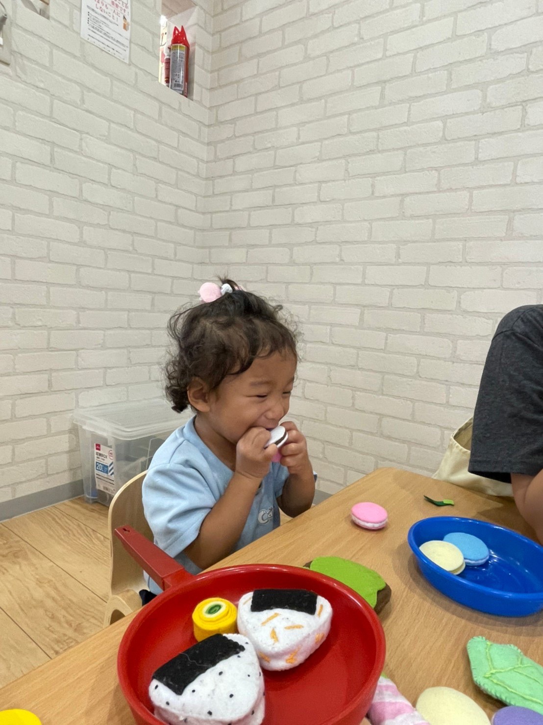 おやつの後は、テーブルを出して、フェルトの食べ物のおもちゃとおままごとセットで遊びました🎶
