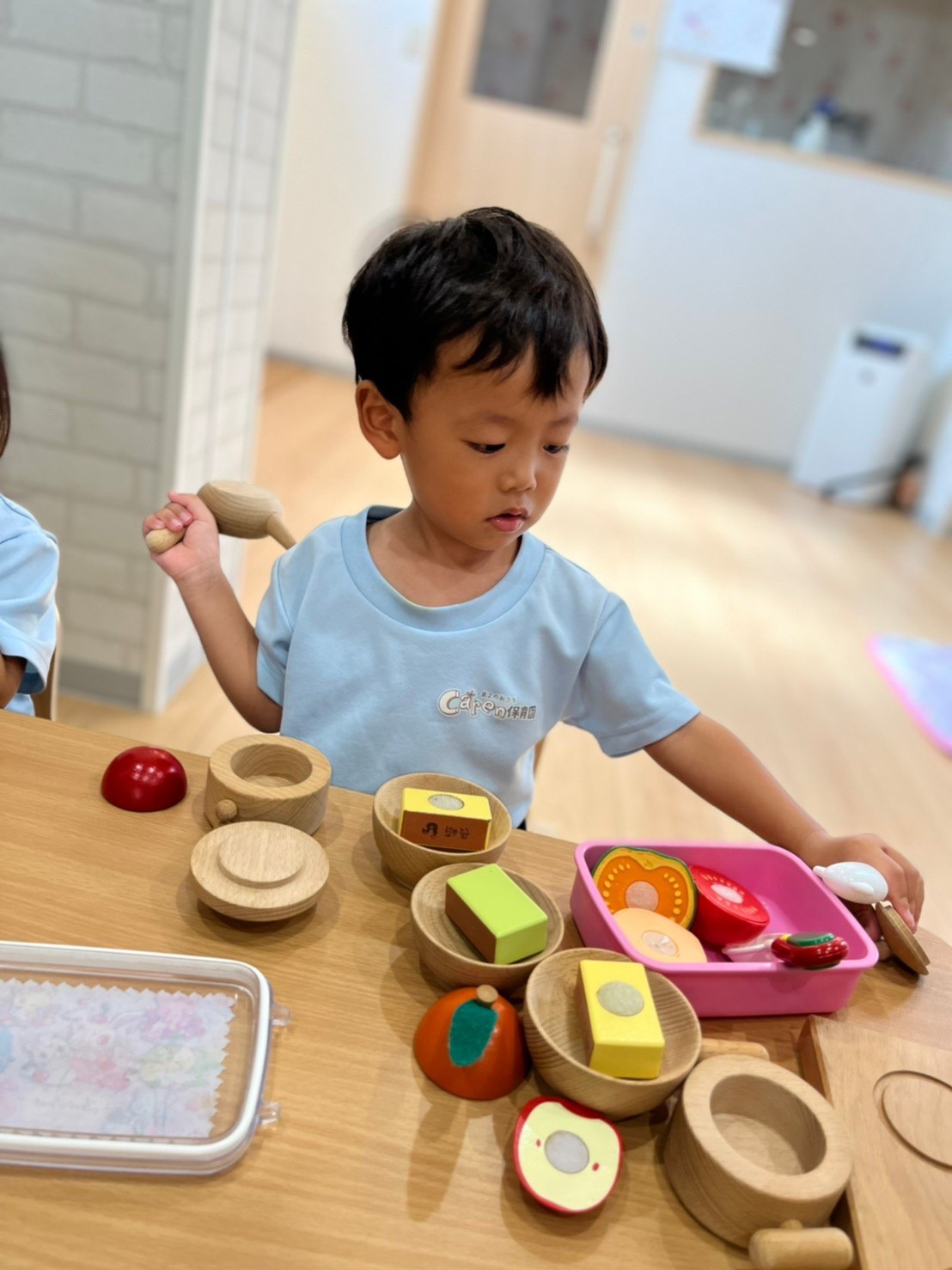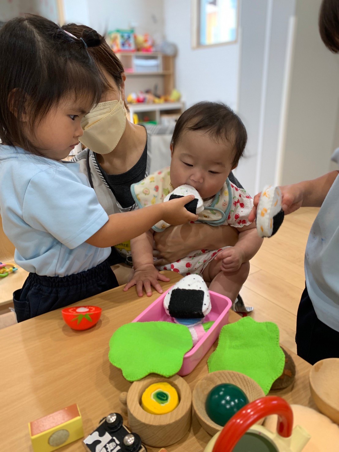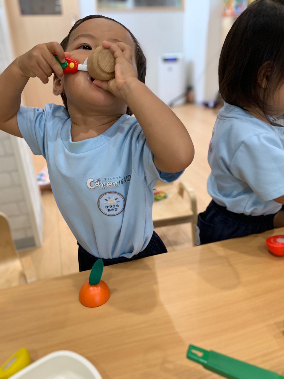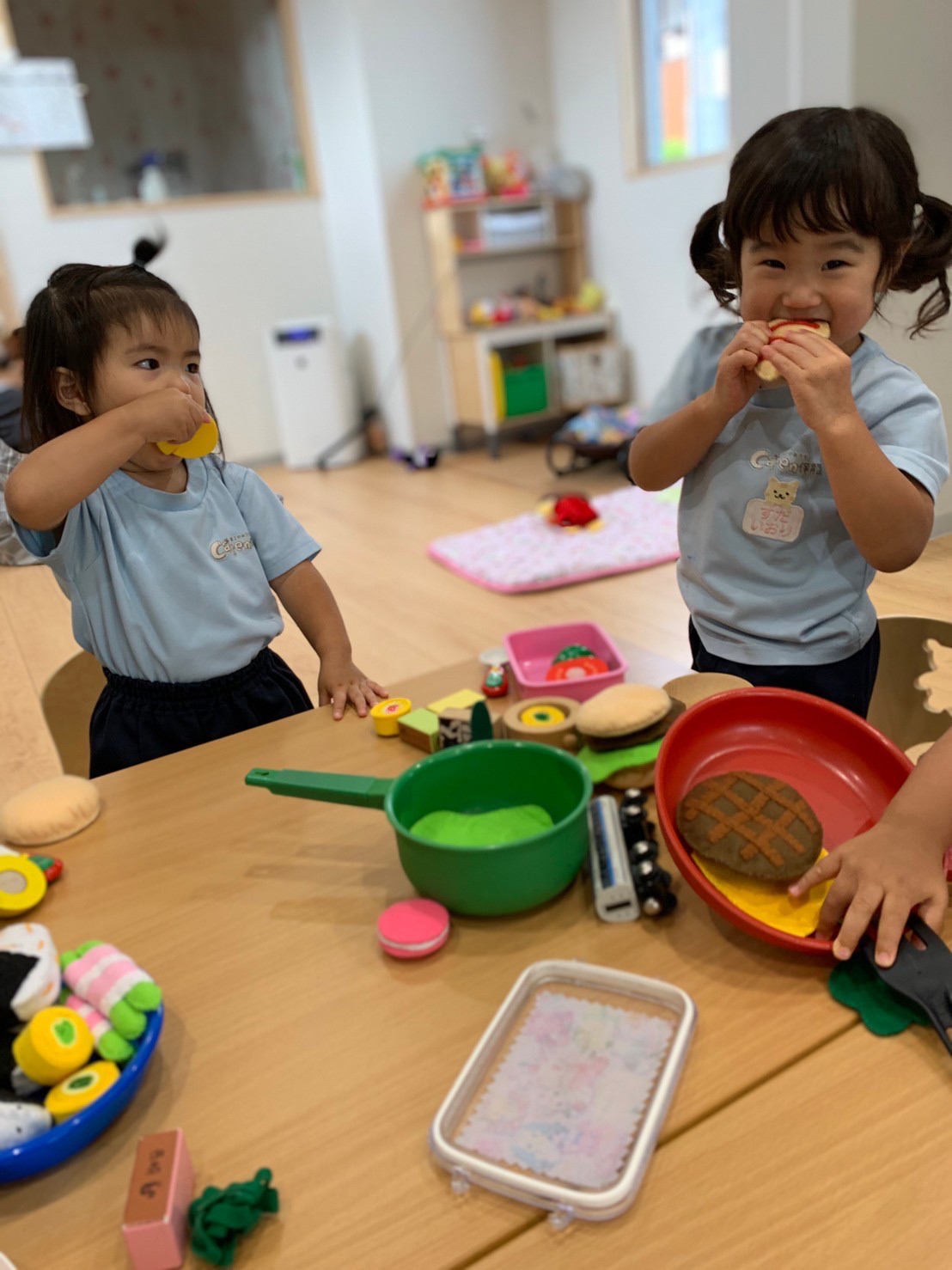 おやつの後は、テーブルを出して、フェルトの食べ物のおもちゃとおままごとセットで遊びました🎶