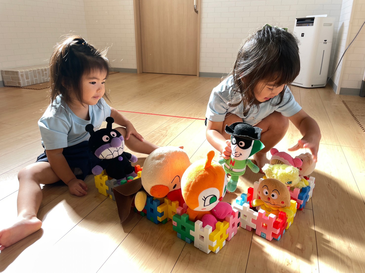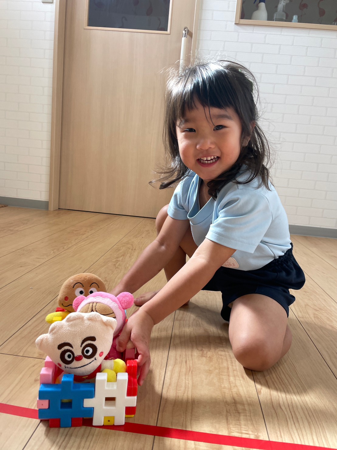 2歳児さんが先生に作ってもらったブロックの箱に、ぬいぐるみを乗せて「ガタンゴトン🚃」と言いながら電車ごっこをして遊んでいると、他のお友だちも同じようにして、最後はみんなでガタンゴトン🎶楽しみました😆