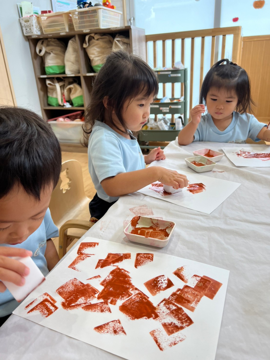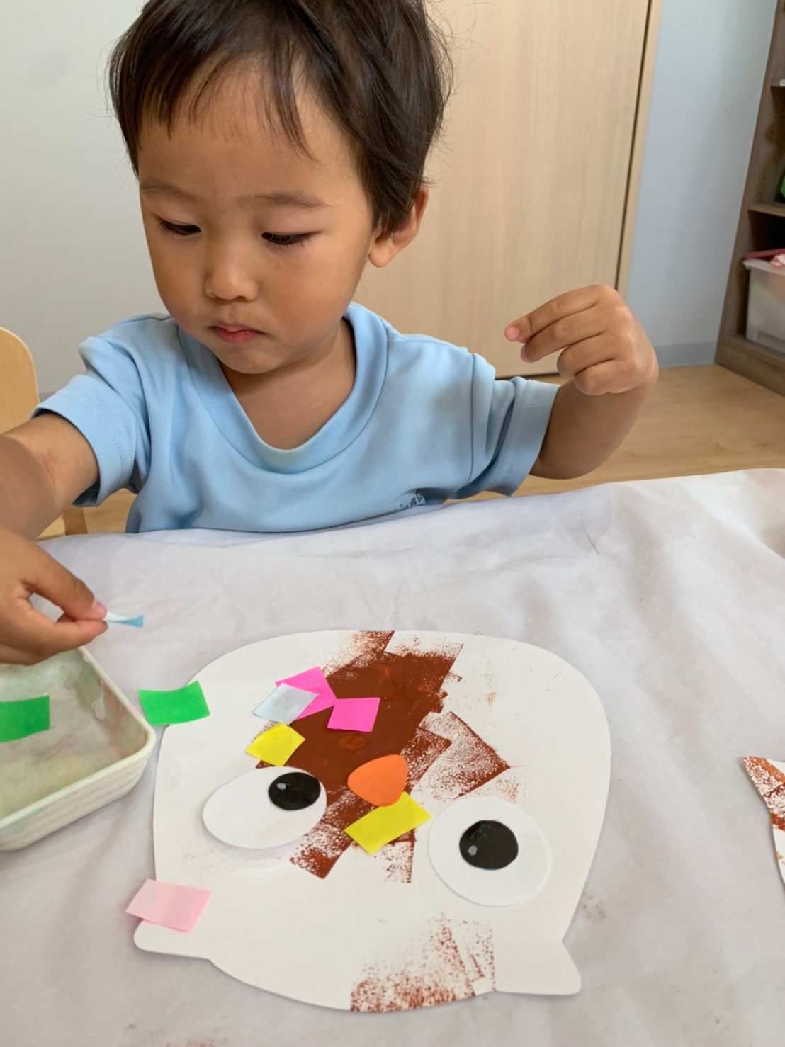 フクロウの体にスポンジでスタンプをし、カラフルな折り紙を糊付けしていきました💗