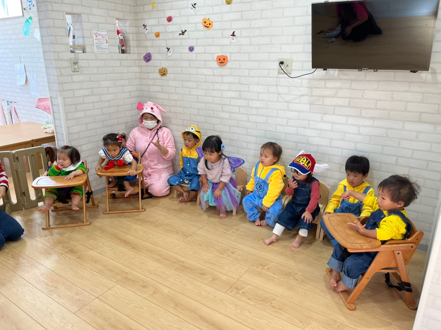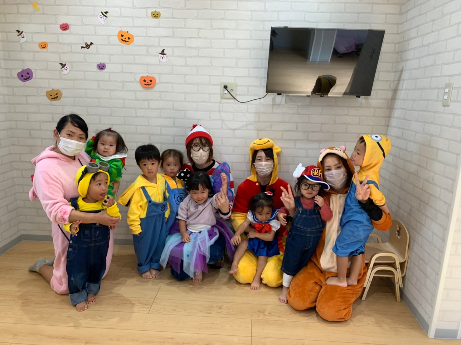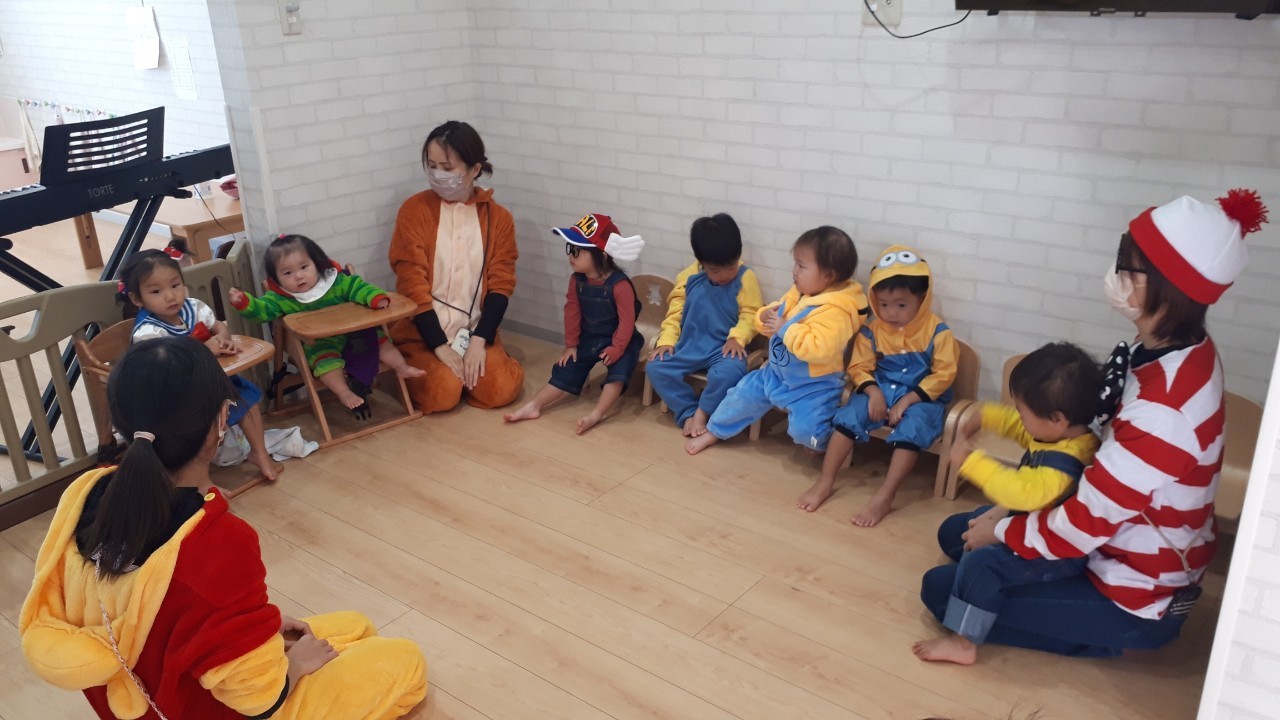 みんな可愛いく仮装をして英語教室の講師の先生と一緒に音楽に合わせて身体を動かしたりして