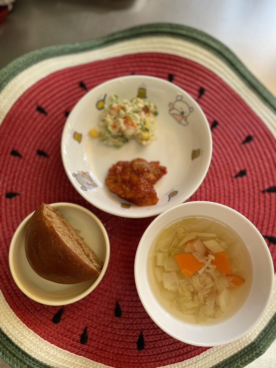 最後はみんなでヨーイドン🏃💨して、お腹空いたねー🤤と保育園に帰ってきました😋💓【ふくつ園の今日の給食です】