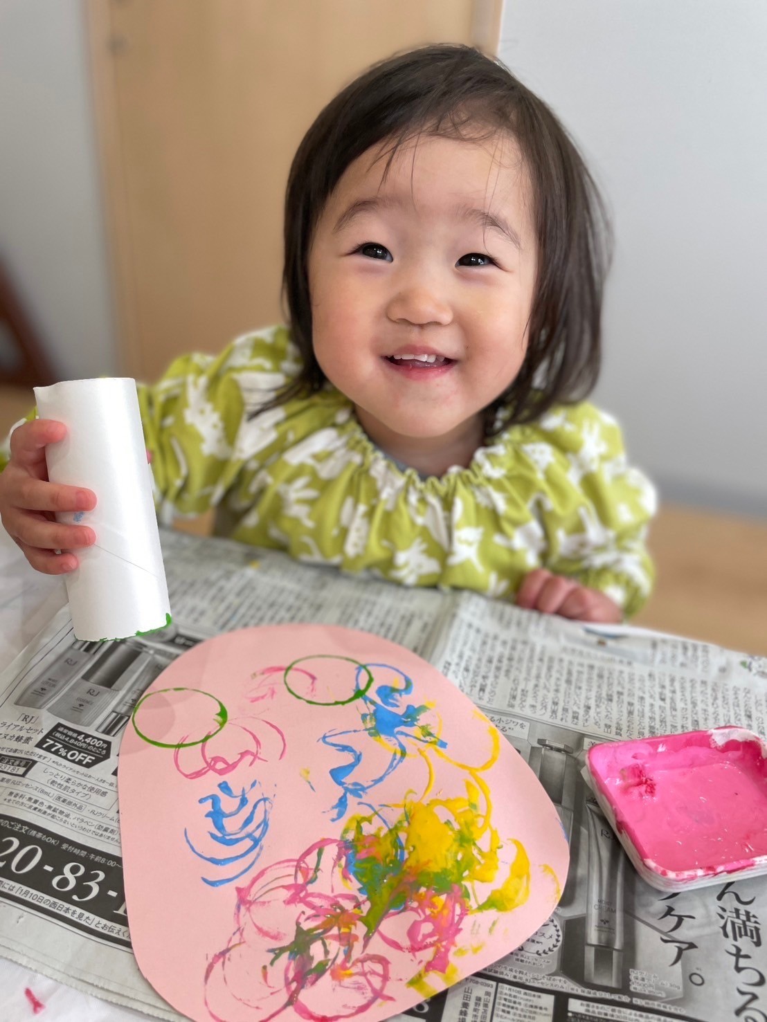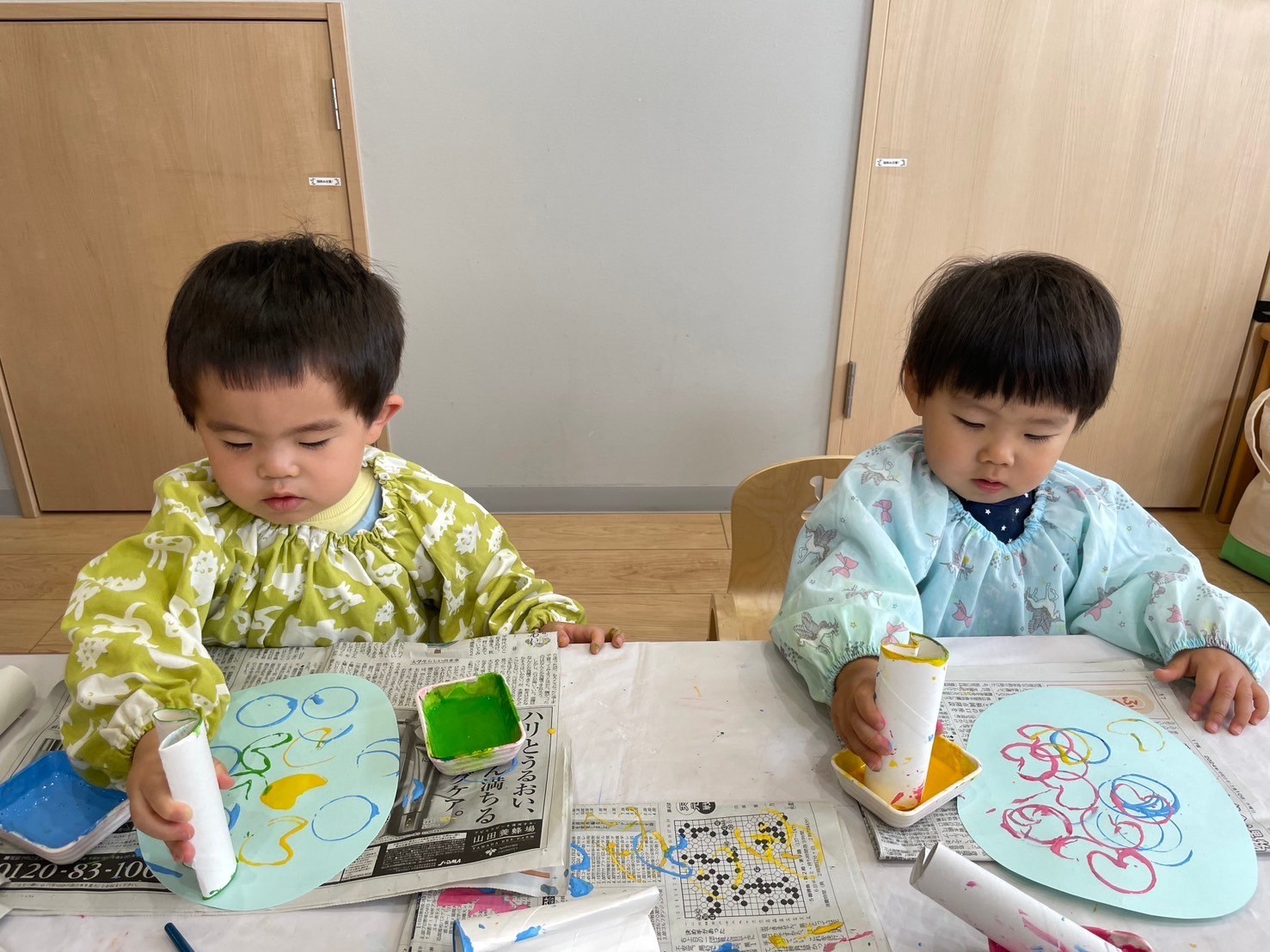 元気いっぱい朝の会をした後は、月製作でトイレットペーパーの芯を使ったスタンプ遊びをしましたよ🎨🖌