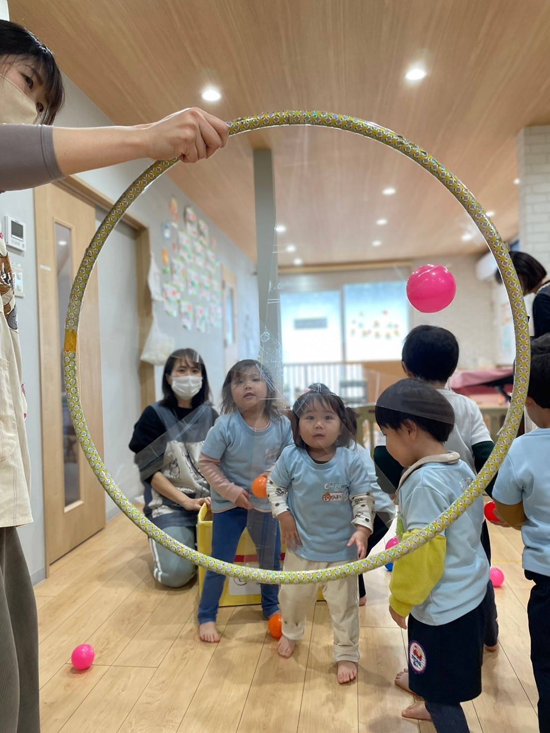 今日はフラフープを使って的当て遊びをしました🎵フープにカラーボールを投げるとくっついたままになり、、🤭不思議そうな子どもたち💓