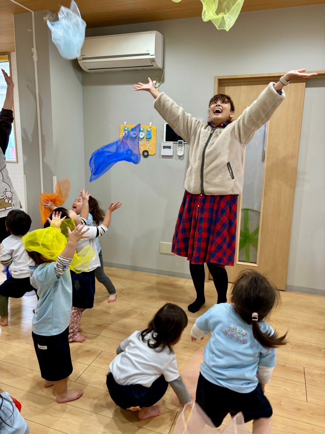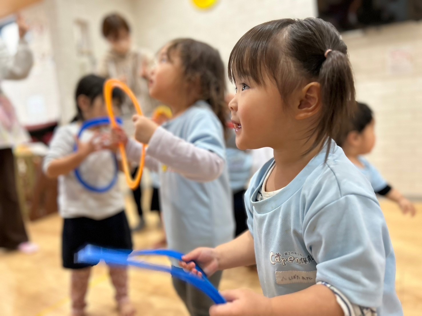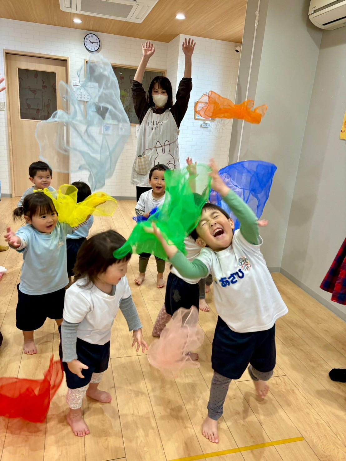 いつもに増して元気いっぱいな子ども達😆‼️まゆみ先生から好きな色のカラーリングを受け取り『バスにのって🚌』をノリノリで楽しみました🤗🎵みんなでカラーシフォンを持って『にじ🌈』も元気に踊りましたよ💛楽しそうなキラキラ笑顔がとっても可愛かったです💓