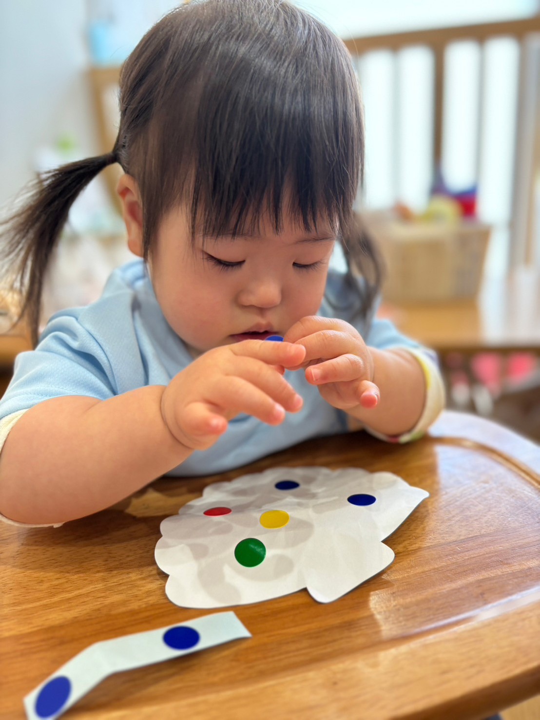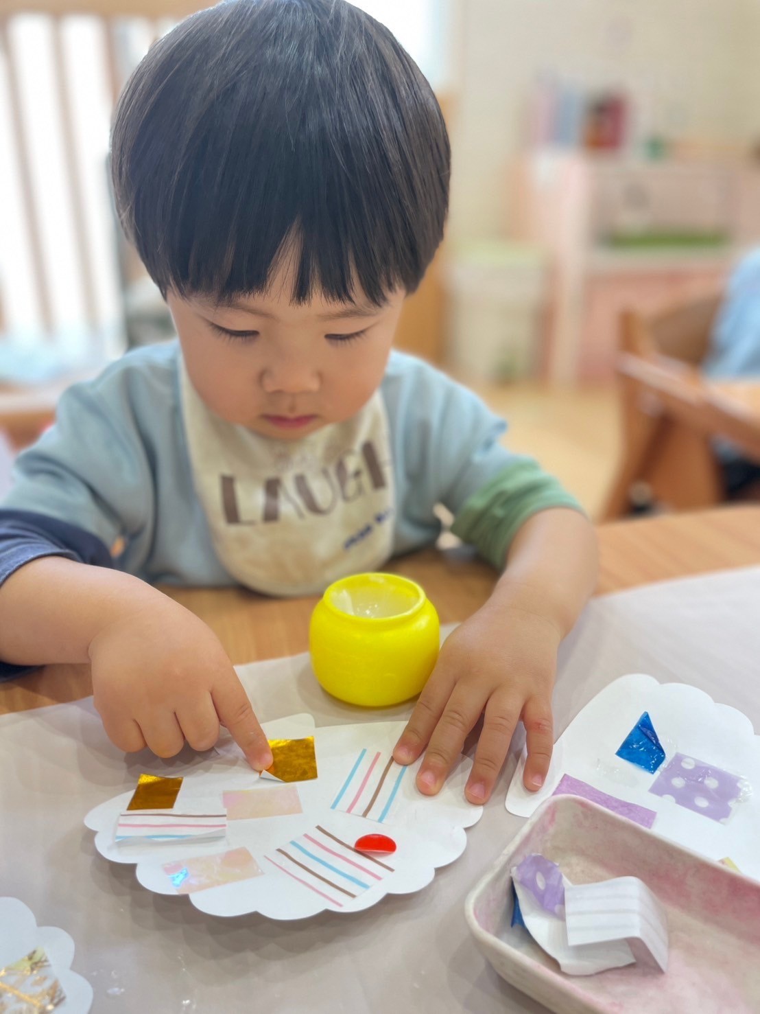 貝殻の形をした画用紙にりす組さんはシールを、ぱんだ組さんは切った折り紙を糊でペタペタと貼っていきました🌟