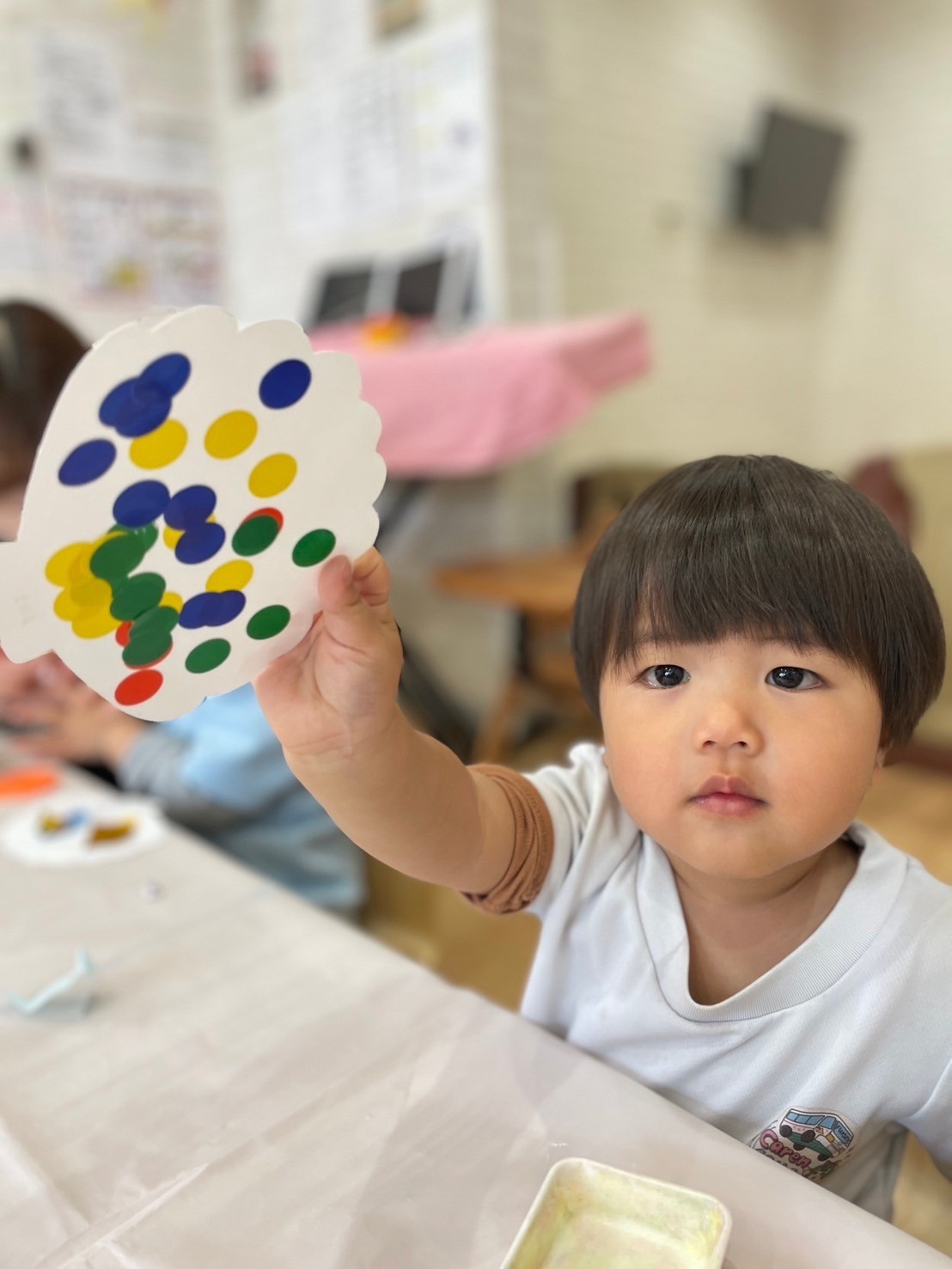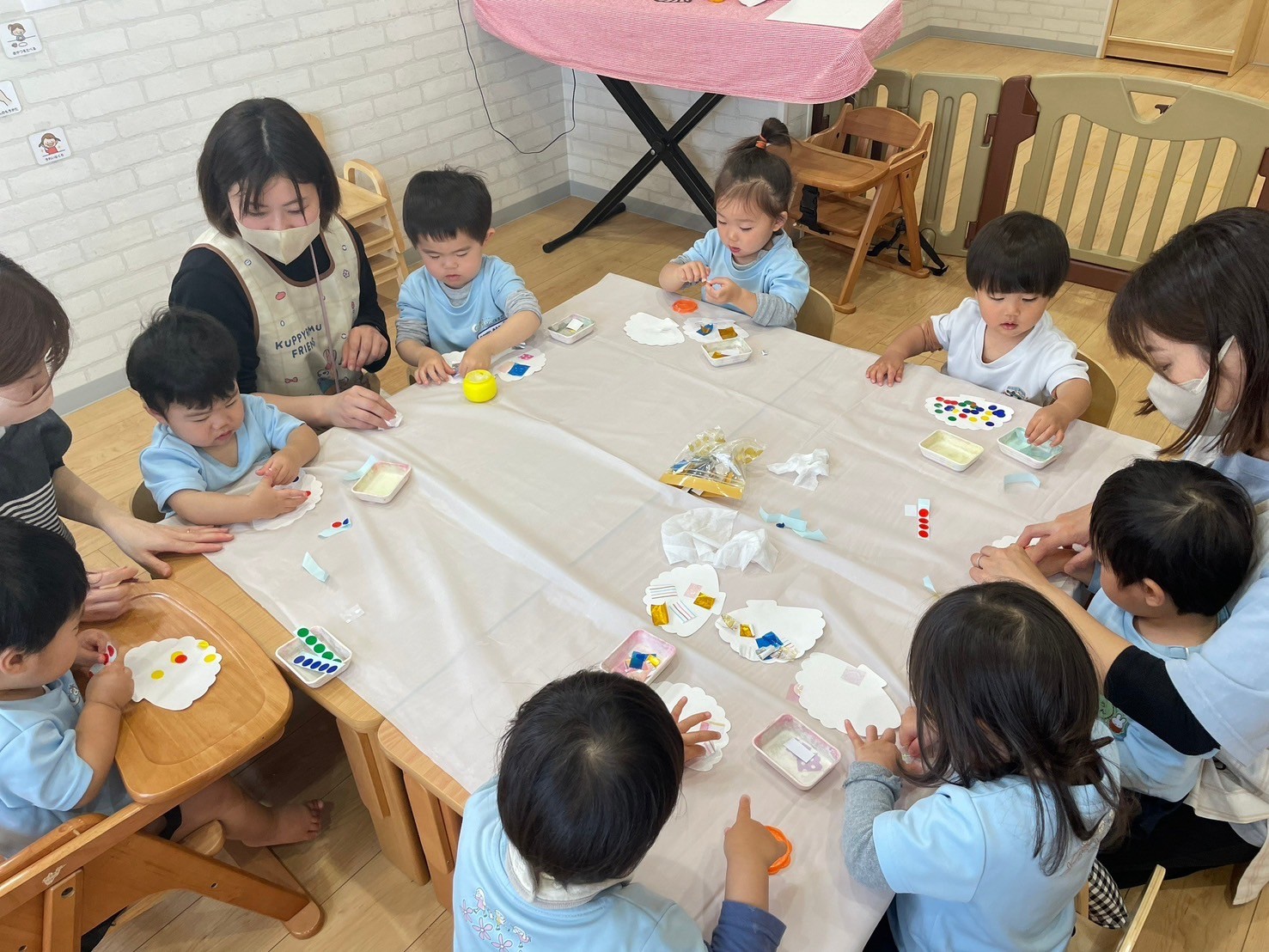 隣のお友だちと糊を仲良く使うパンダ組さん🐼🥰見て見てーと楽しそうなりす組さん🐿