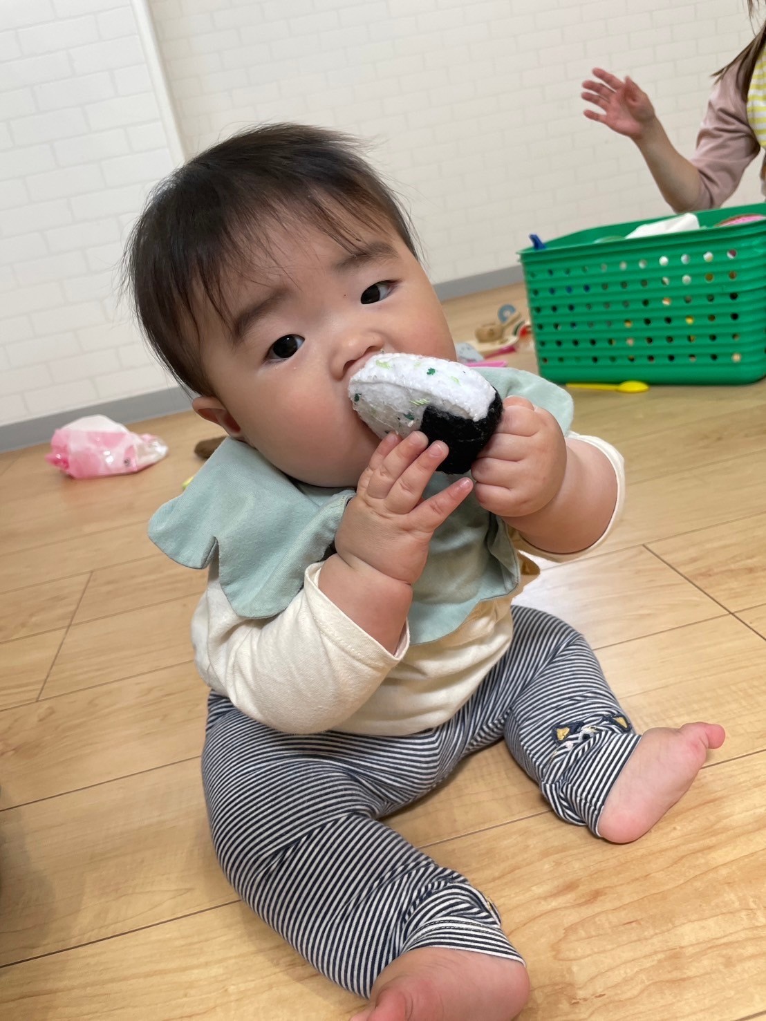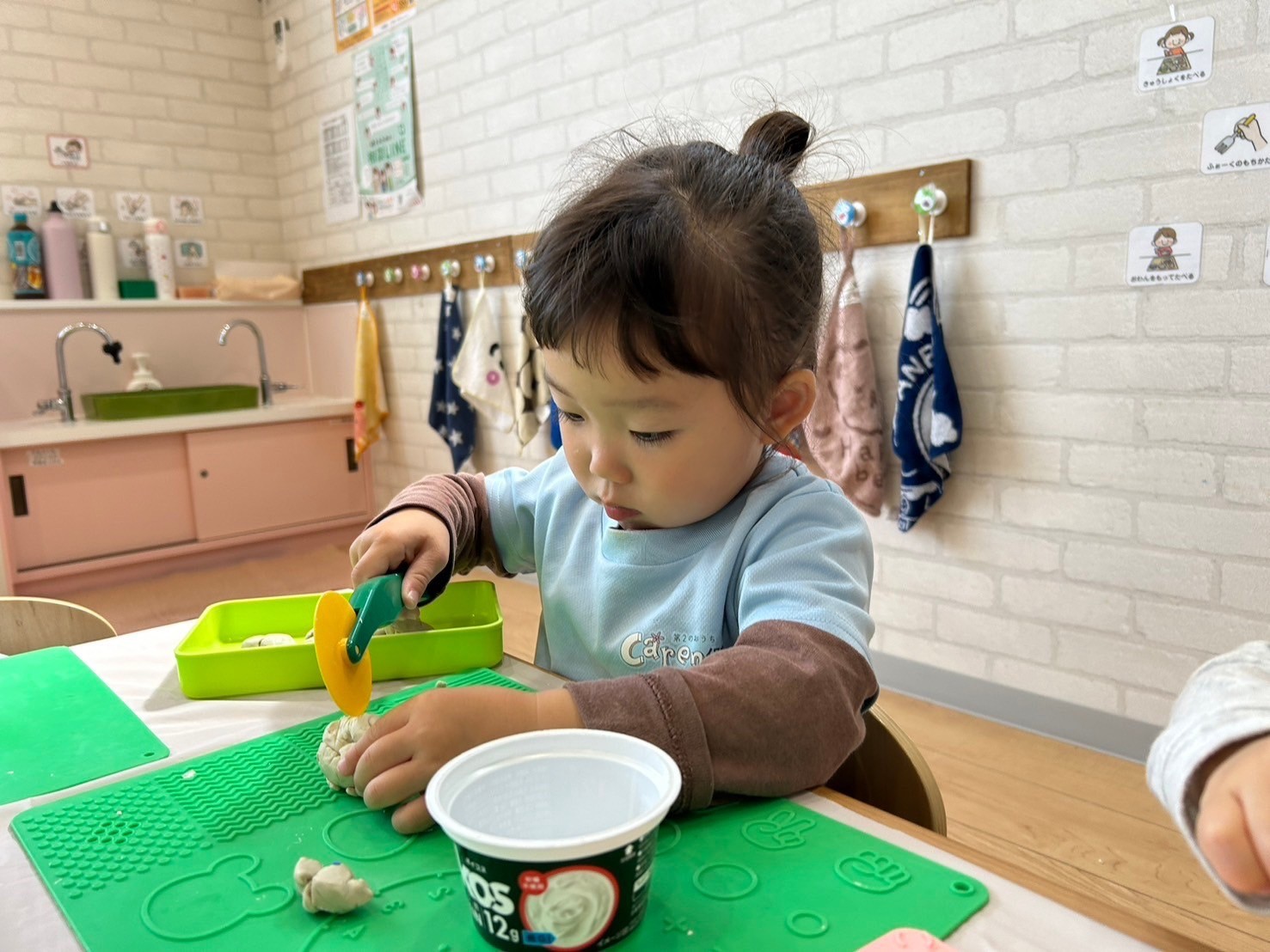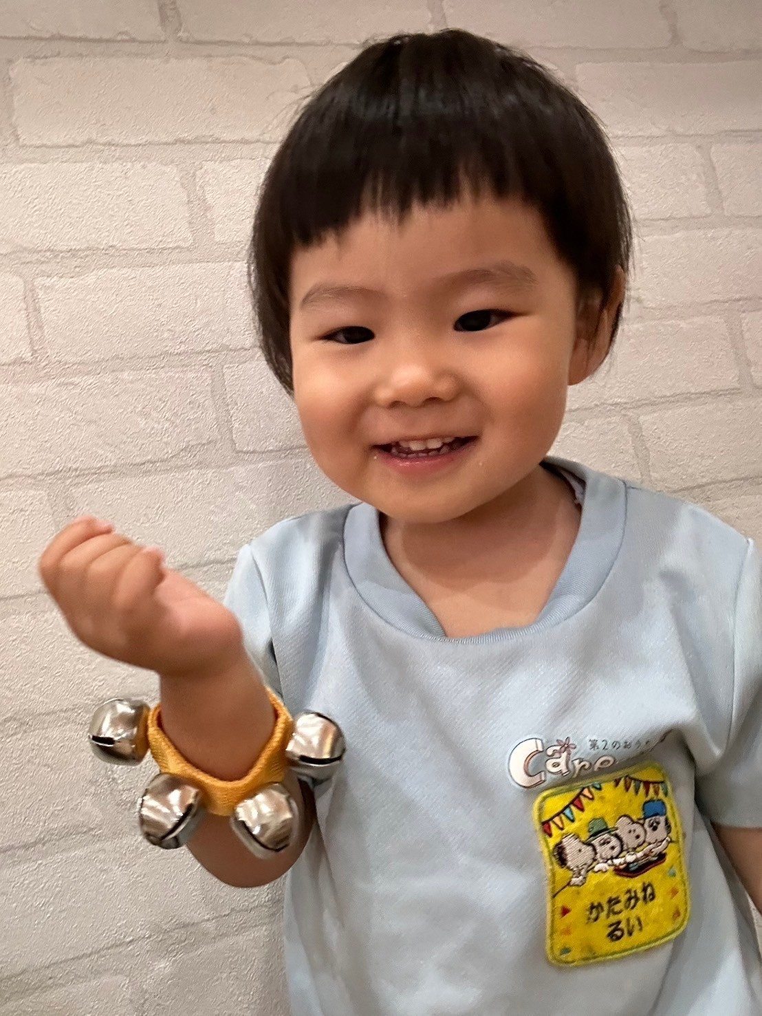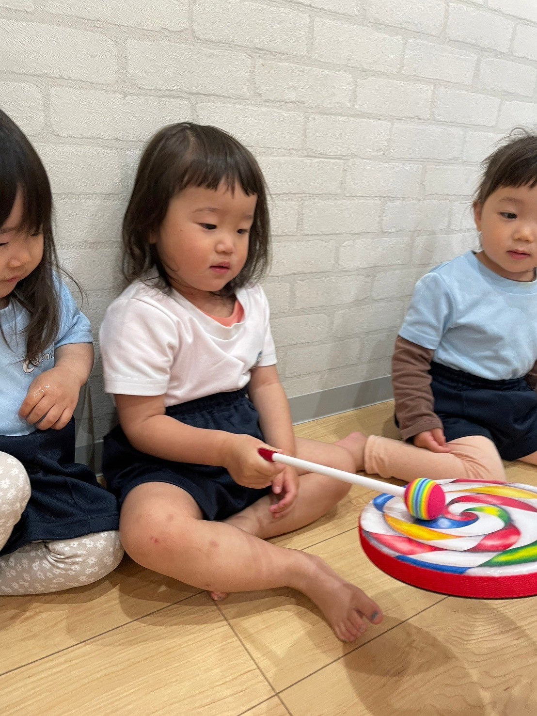 名前の文字数に合わせて元気よく太鼓を叩いたり🪘好きな色の鈴を手首につけて音を鳴らしたりして楽しみました🎶みんなノリノリで色んな音を鳴らしていました♪リトミックの後は、粘土チームとままごとチームに分かれて遊びました🥰