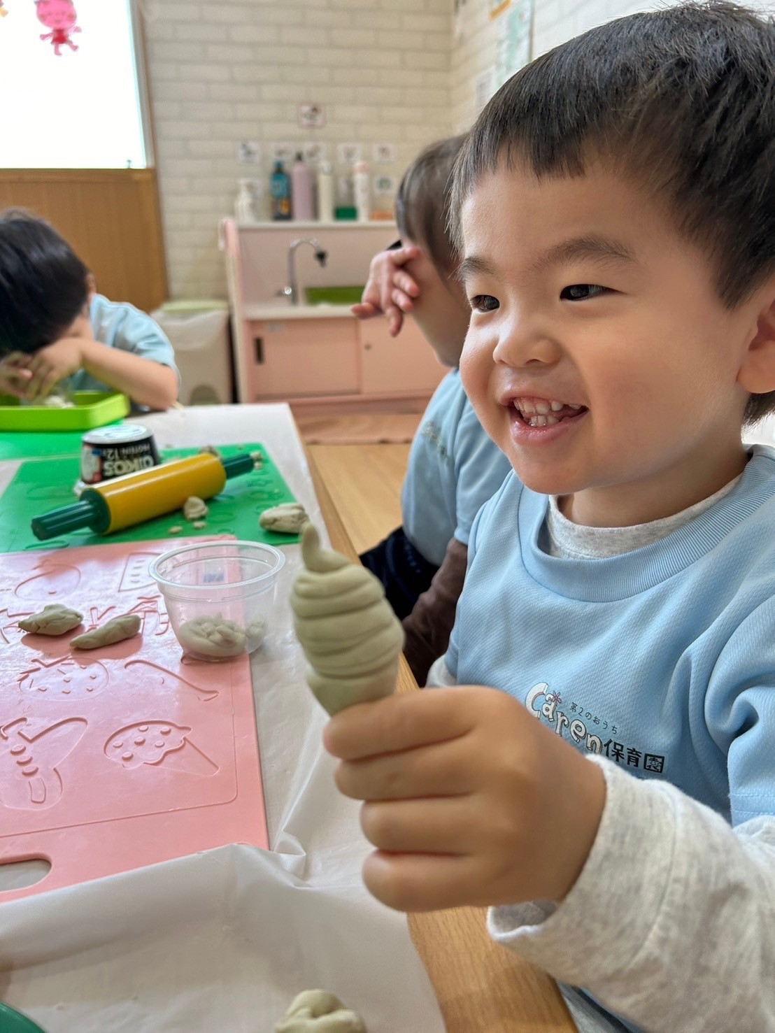 粘土チームは、アイスクリームやお汁を作ってお友だちと食べる真似をしてました🍦✨