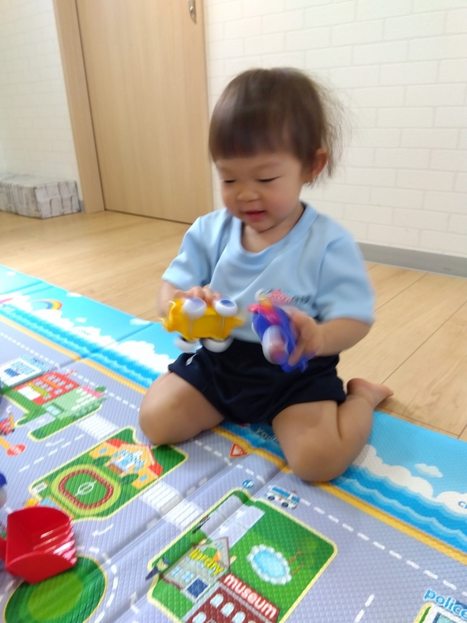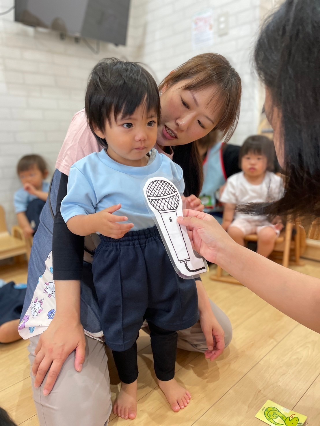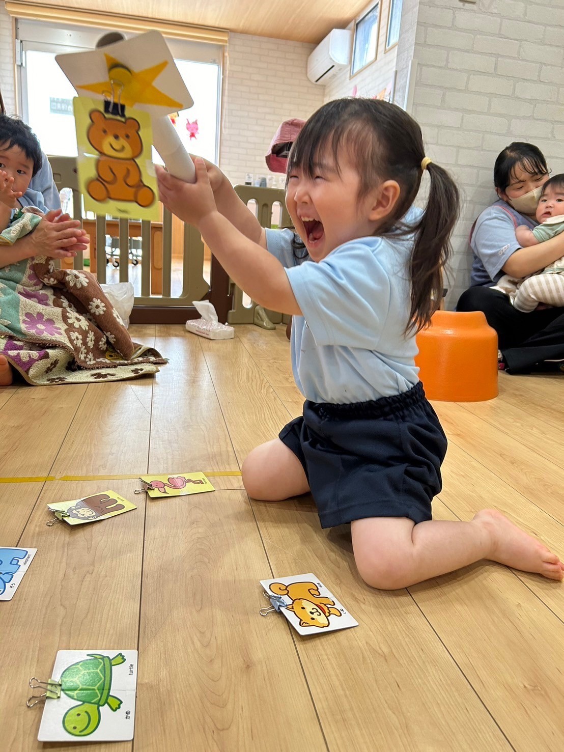 動物の絵本を見ながら、同じ動物のカードを⭐️ステッキでとる遊びもしました😊動物の名前も英語ですこーし覚えましたよ(動物)(動物)(犬)(猫)その後ぱんださんは(恐竜)恐竜公園まで遊びに行き、りす・ひよこさんは室内遊びを楽しみました🥰