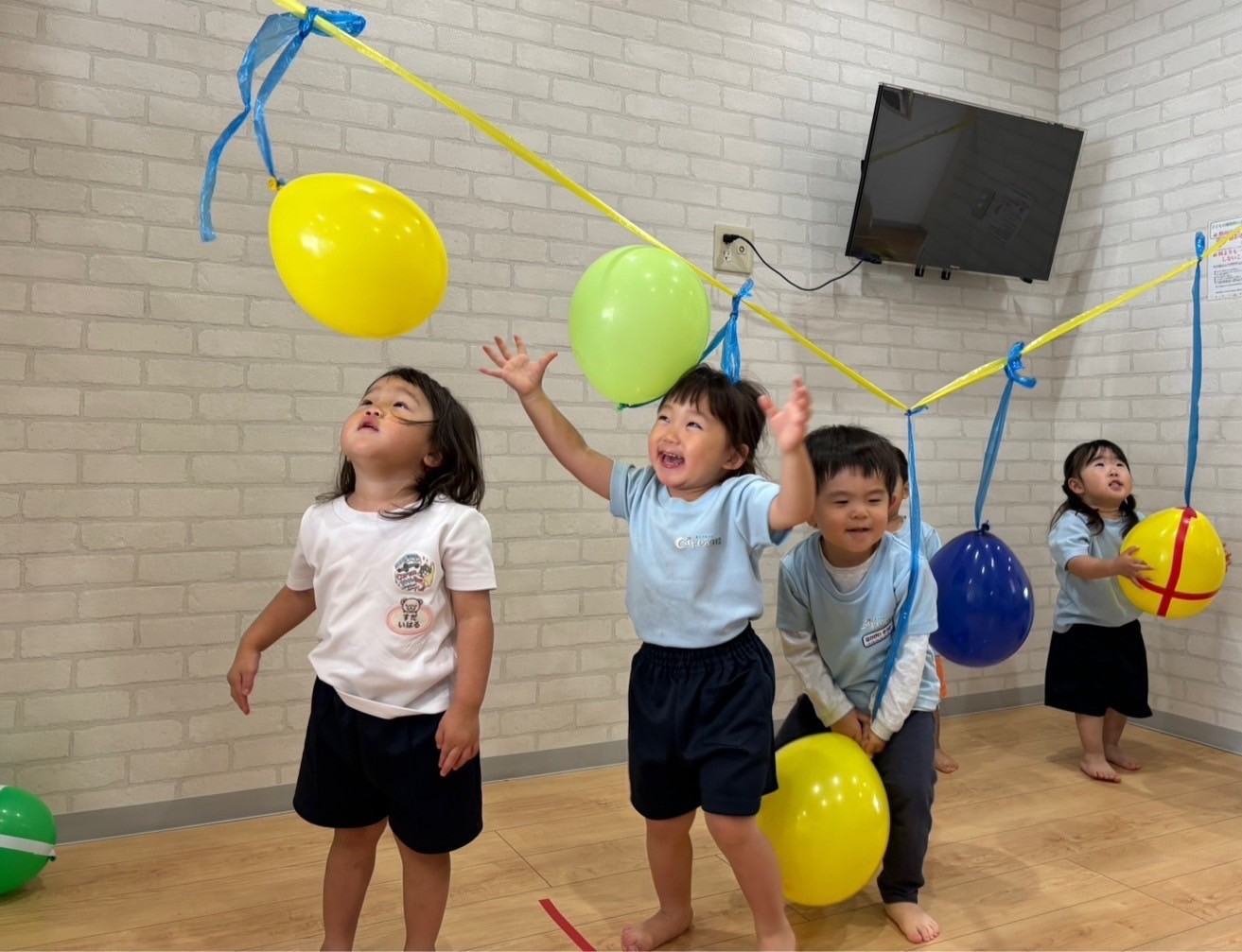 高く吊るした風船にジャンプしたり、風船マットの上をぴょんぴょんして、身体をいっぱい動かして遊びましたよ💓