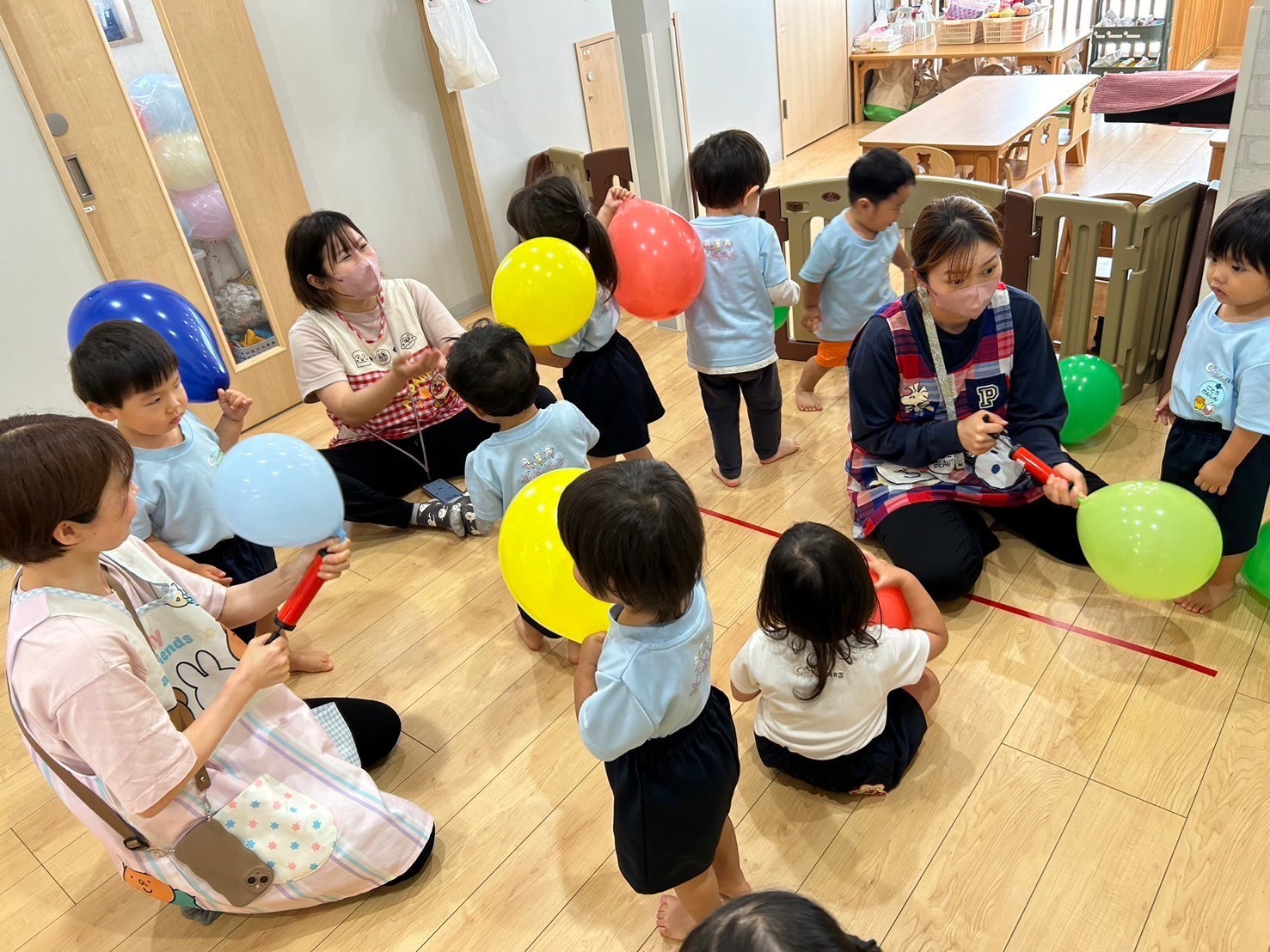 好きな色の風船を膨らませてもらって、ポンポンと投げたり、ギュッと抱っこしたり💕ビニールテープを巻いてボールに変身させたり、紐を繋げて風船ワンちゃん🐶のお散歩も楽しみました🥰