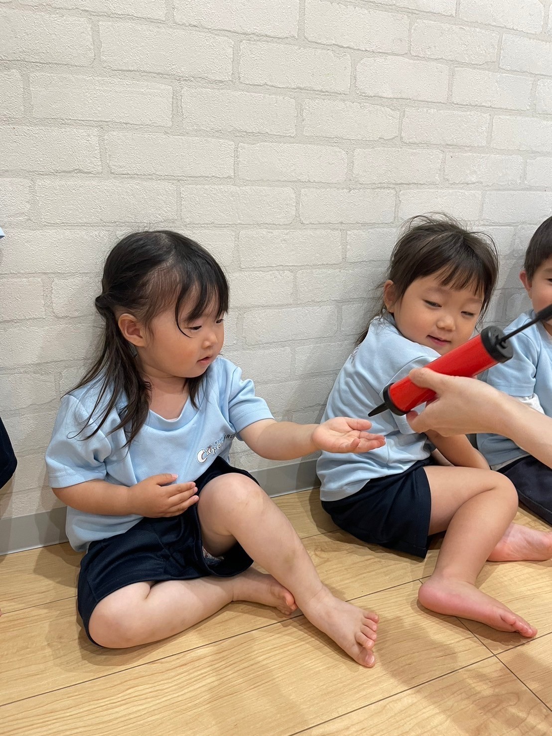 空気入れからシュッシュっと出る風に、気持ち良さそうな子ども達😆顔や手にかけると嬉しそうでしたよ🎵