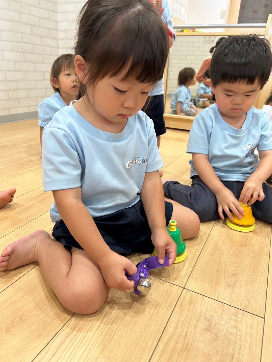 鈴やベル、太鼓の中から好きな楽器を選んで「おもちゃのチャチャチャ」の曲に合わせて合奏をしました🛎🥁