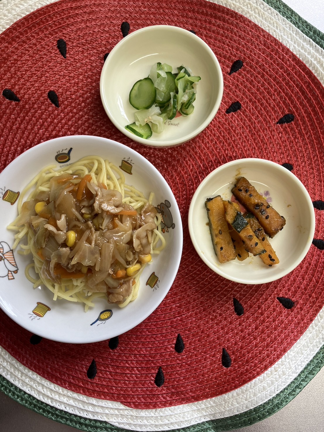 ジャングルジムや追いかけごっこ、砂遊びをして暑さに負けず楽しく元気に過ごせました☀️【福津園の今日の給食です】